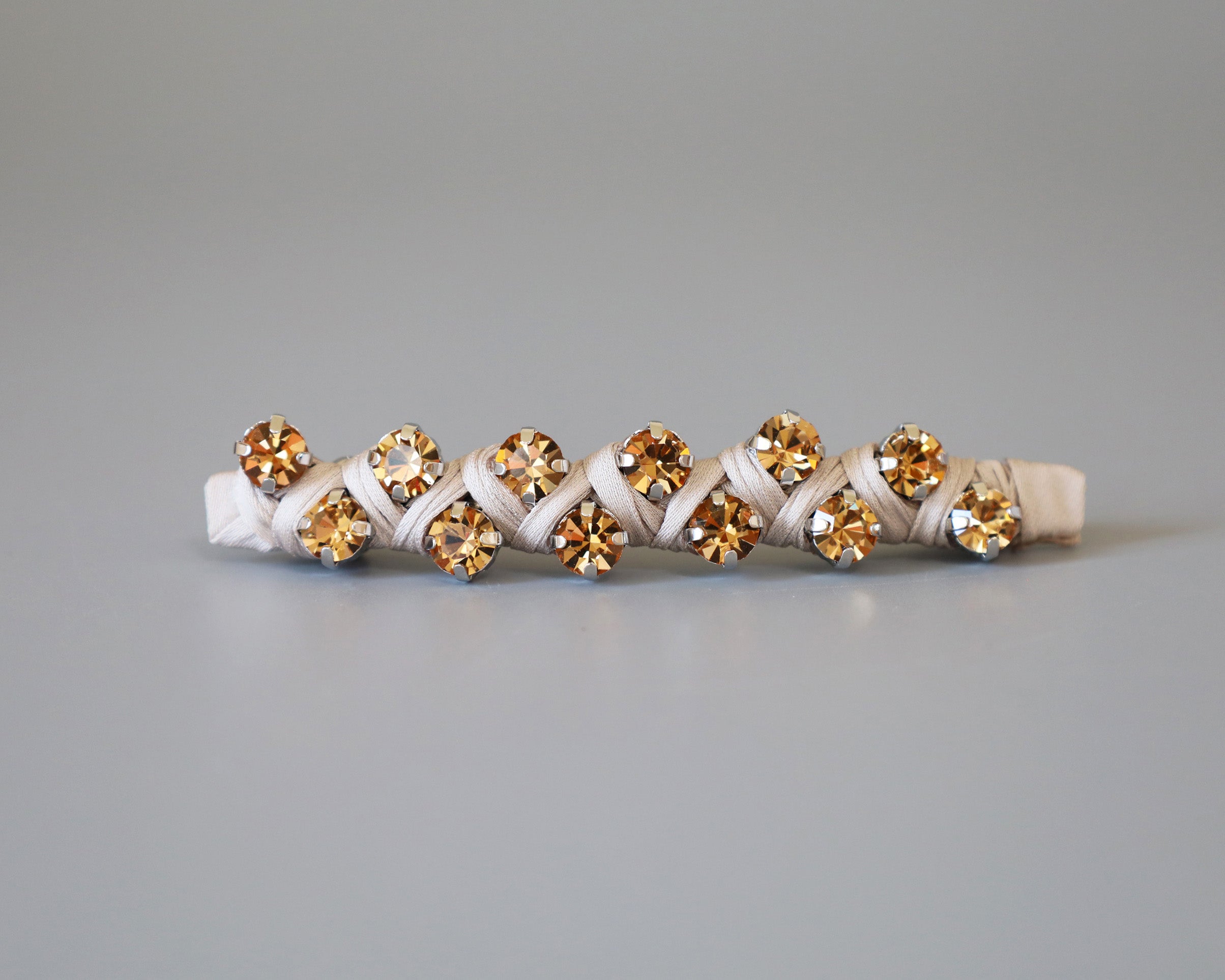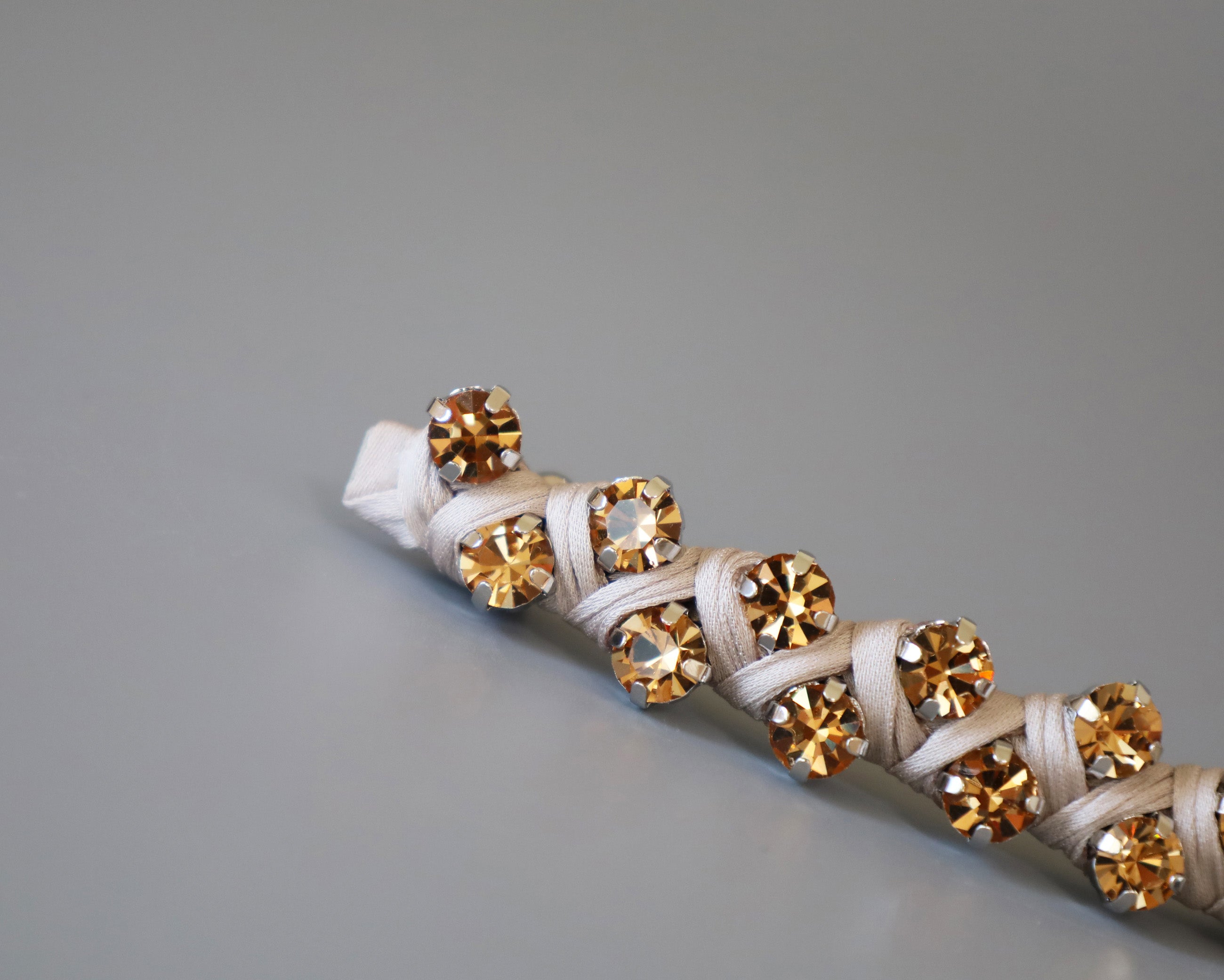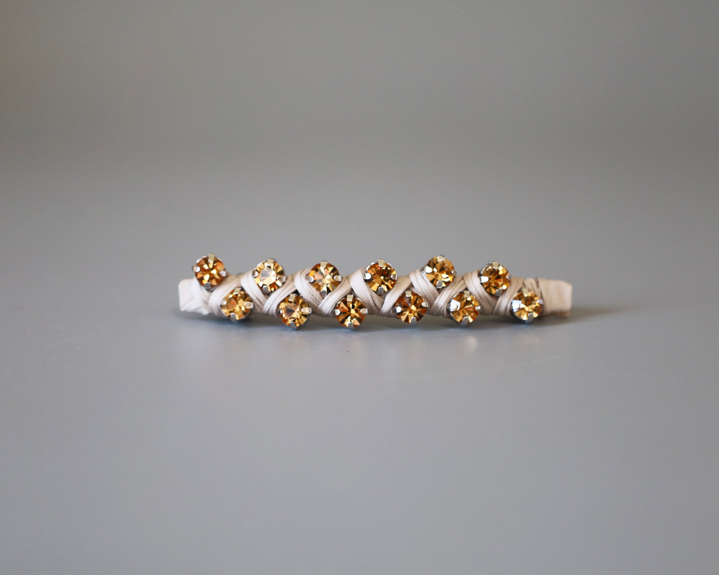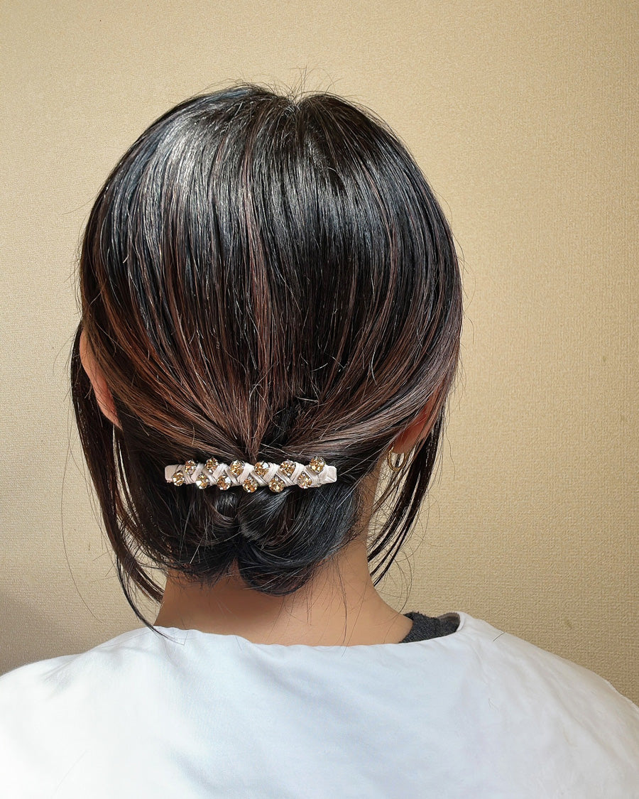 ゴールドにきらめくビジューを編み込んだようなヘアバレッタ。