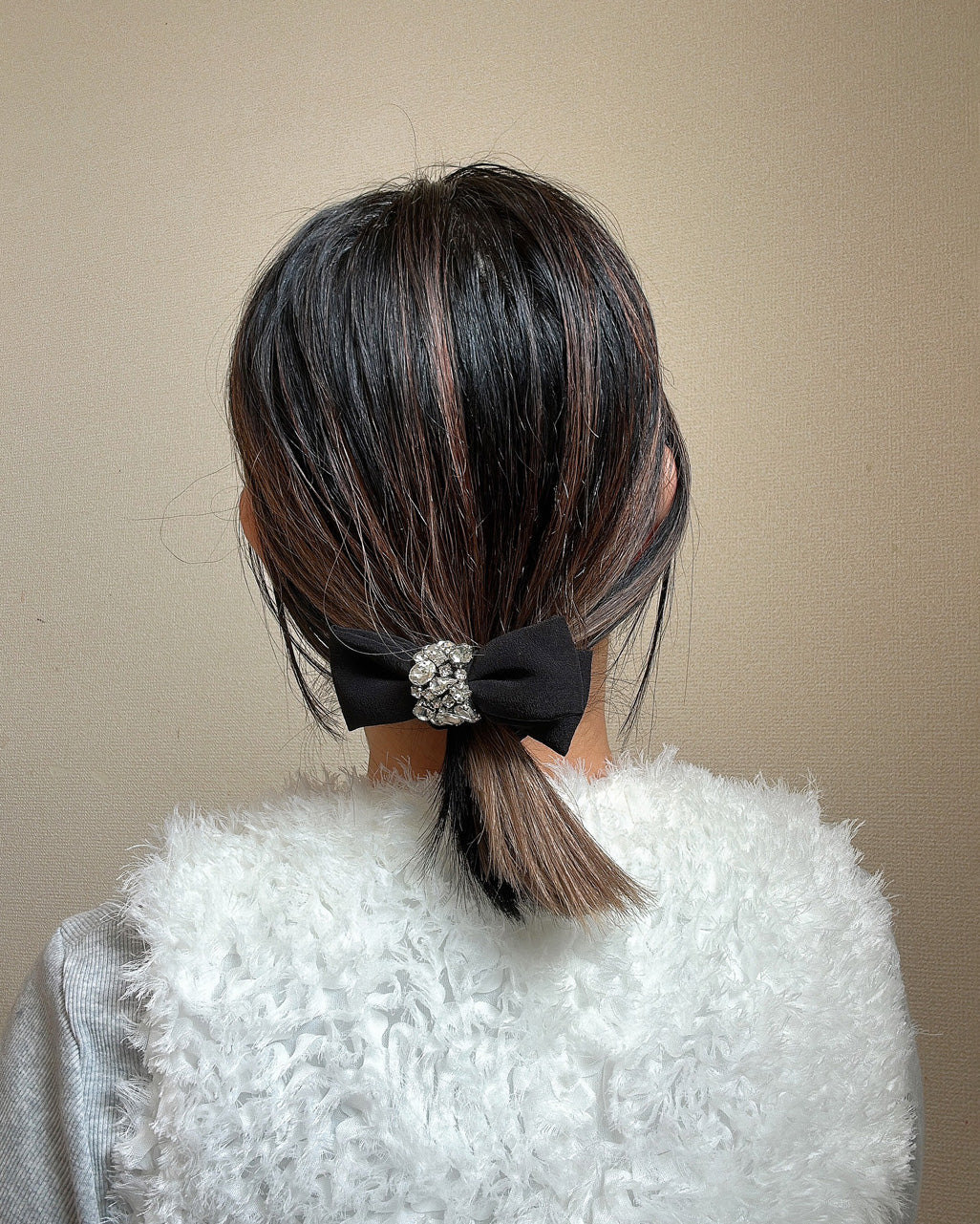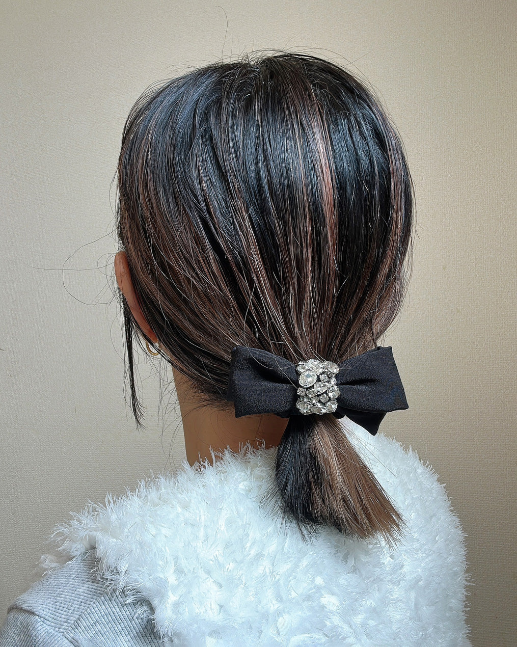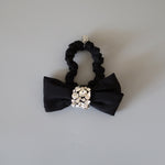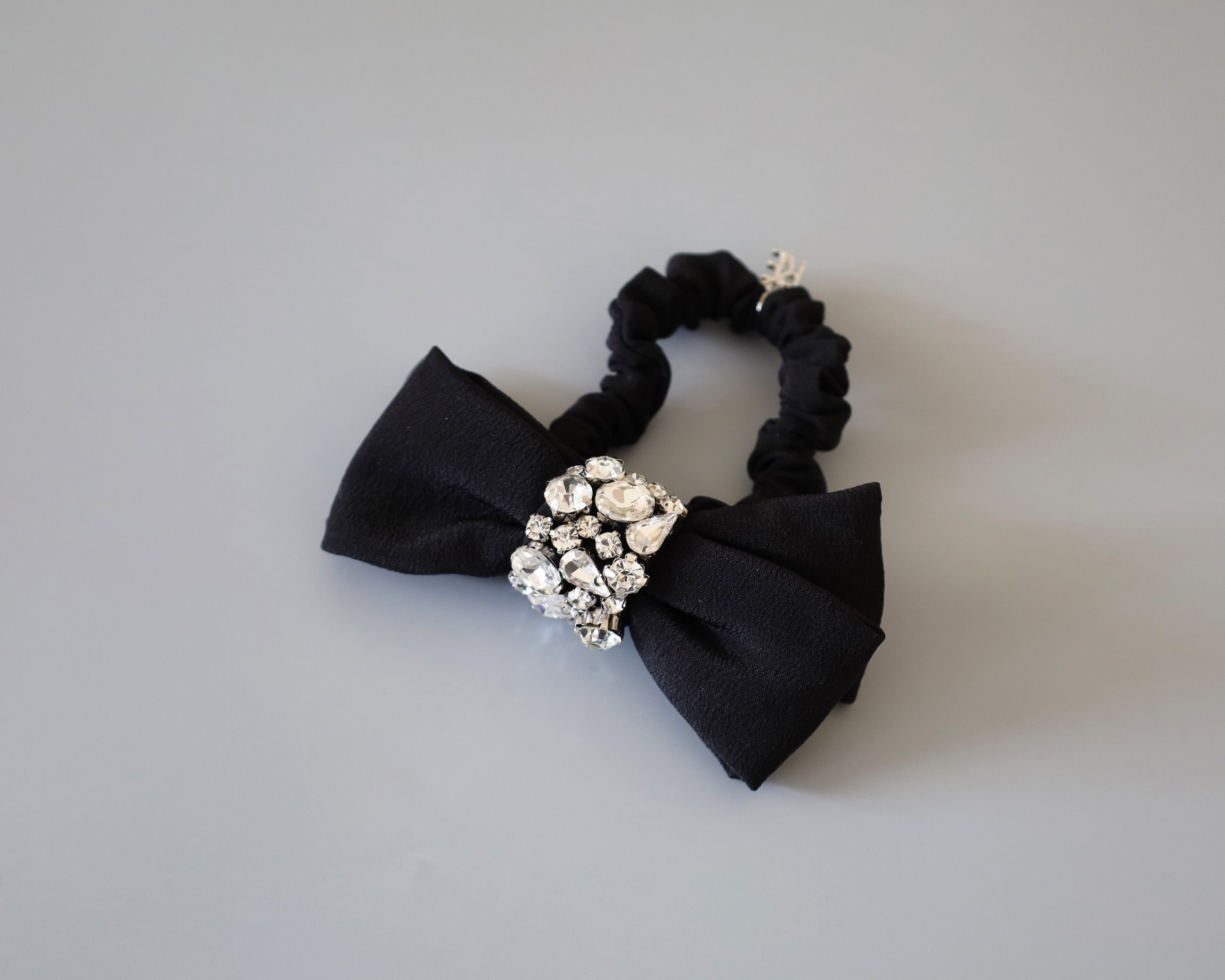 存在感のあるブラックリボンにビジューとシルバーのきらめきを組み合わせたリボンポニー。