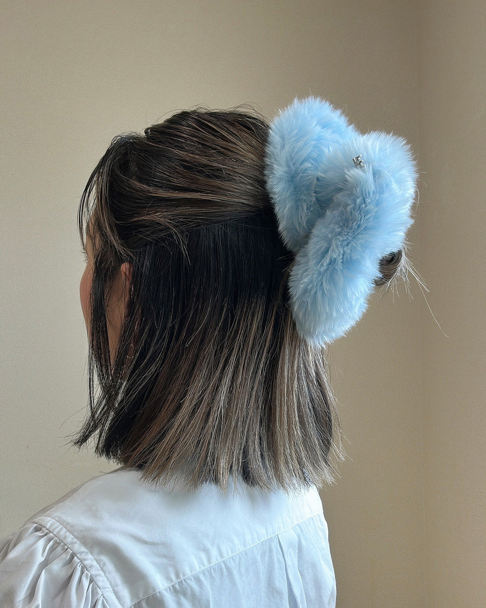 ライトブルーのふわふわもこもこのファーがキュート。