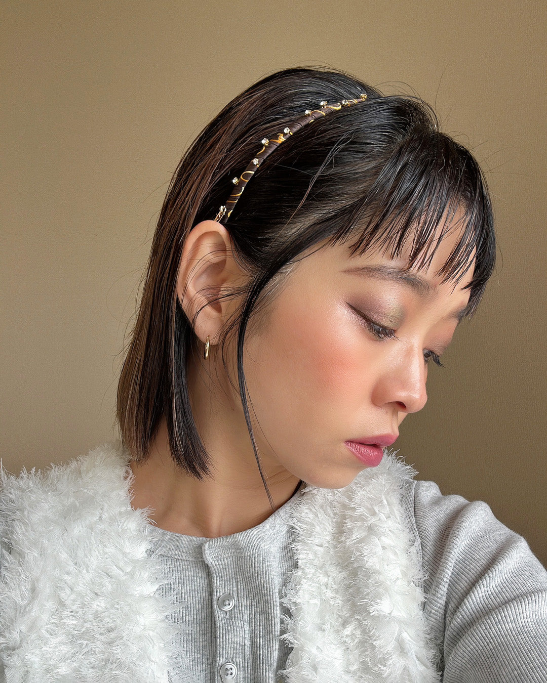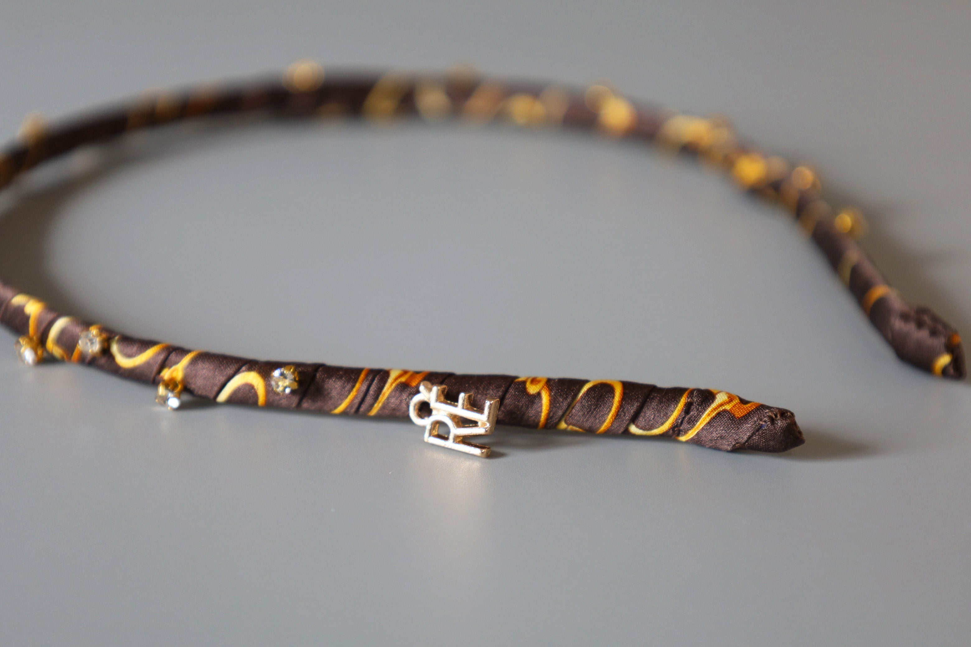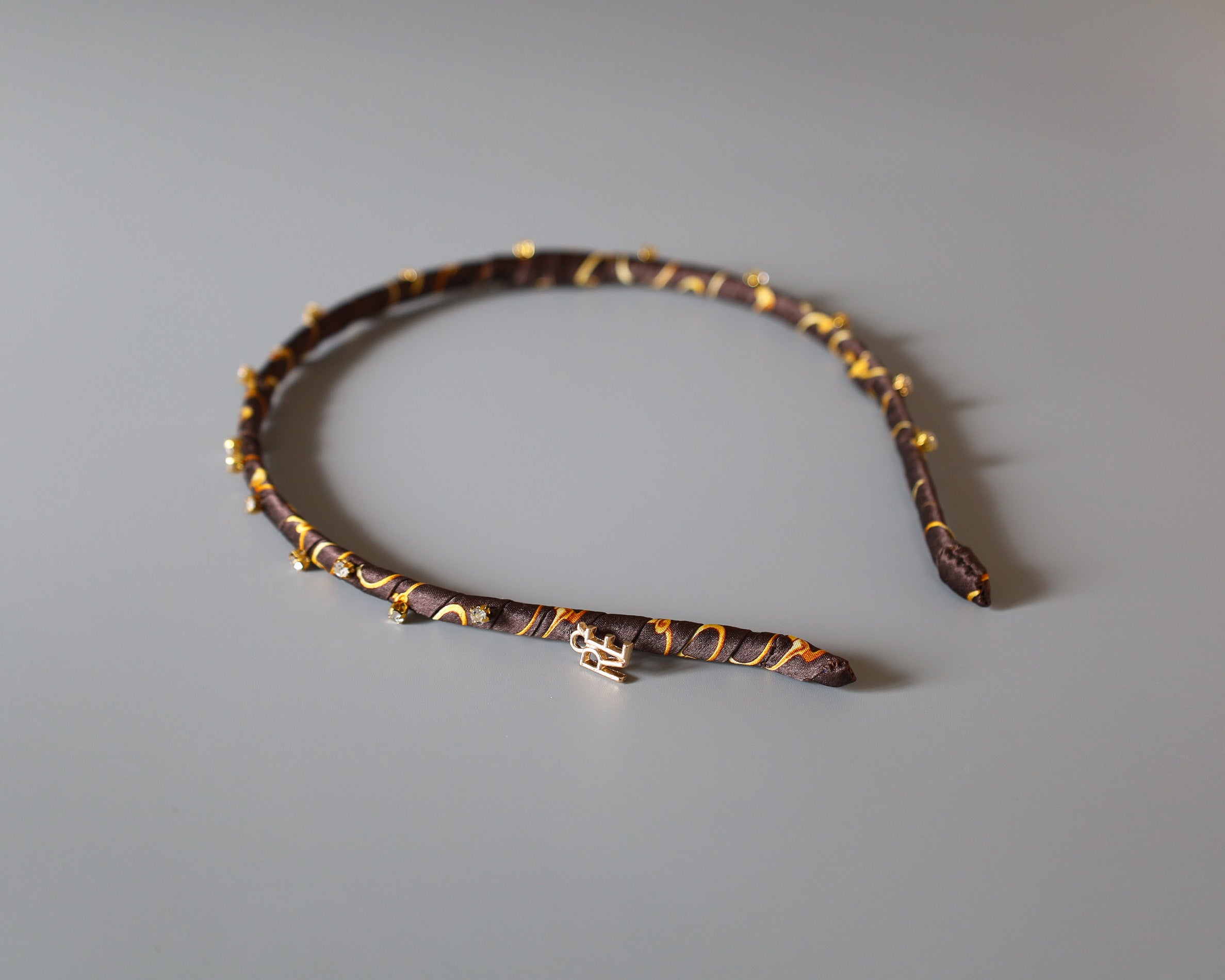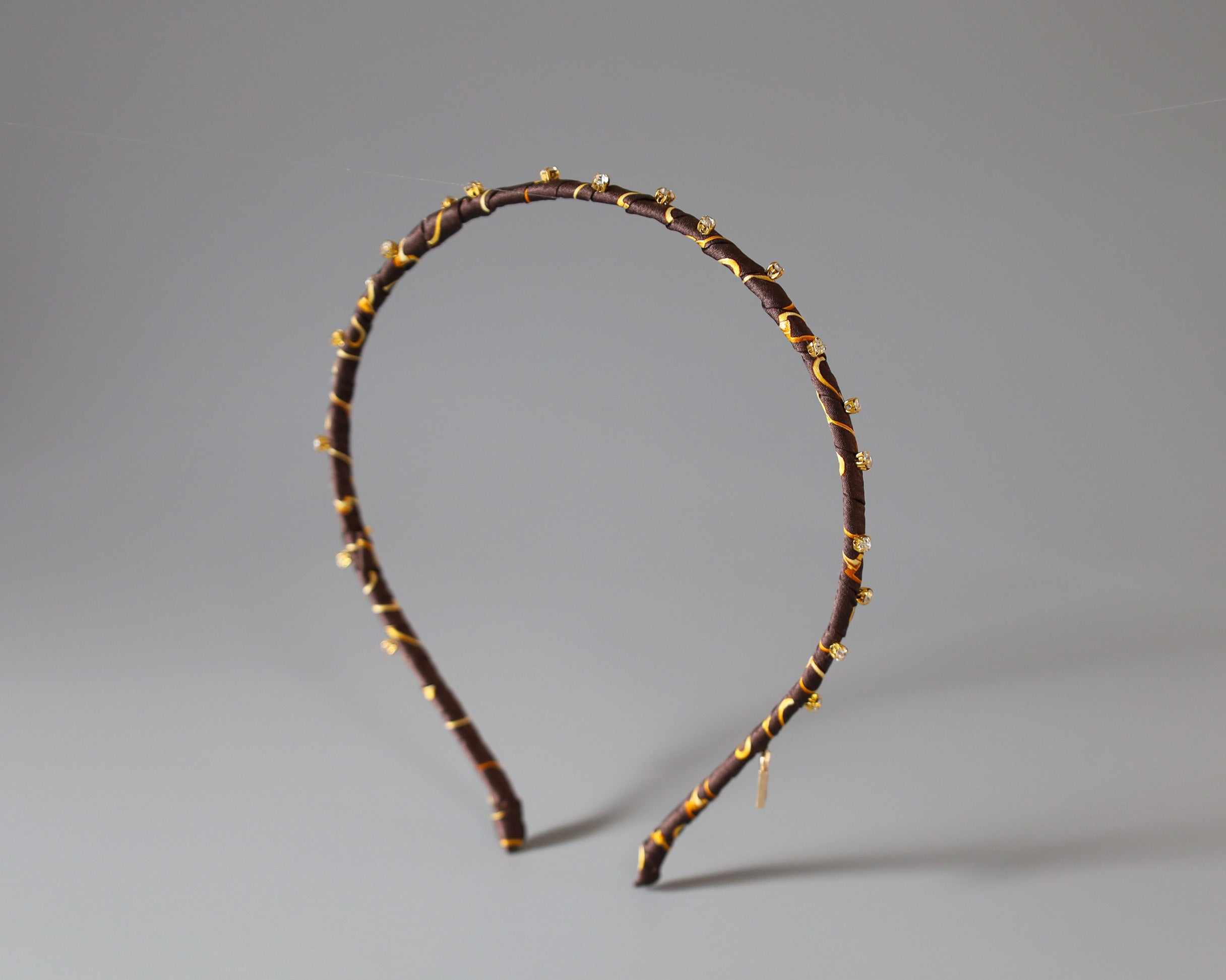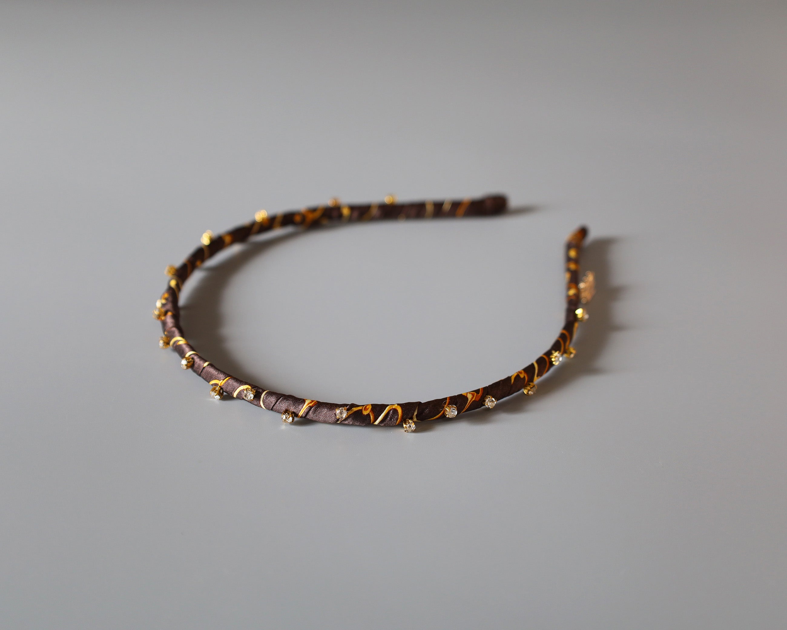 チョコレートのようなブラウンにゴールドのラインとビジューが映えるカチューシャ。