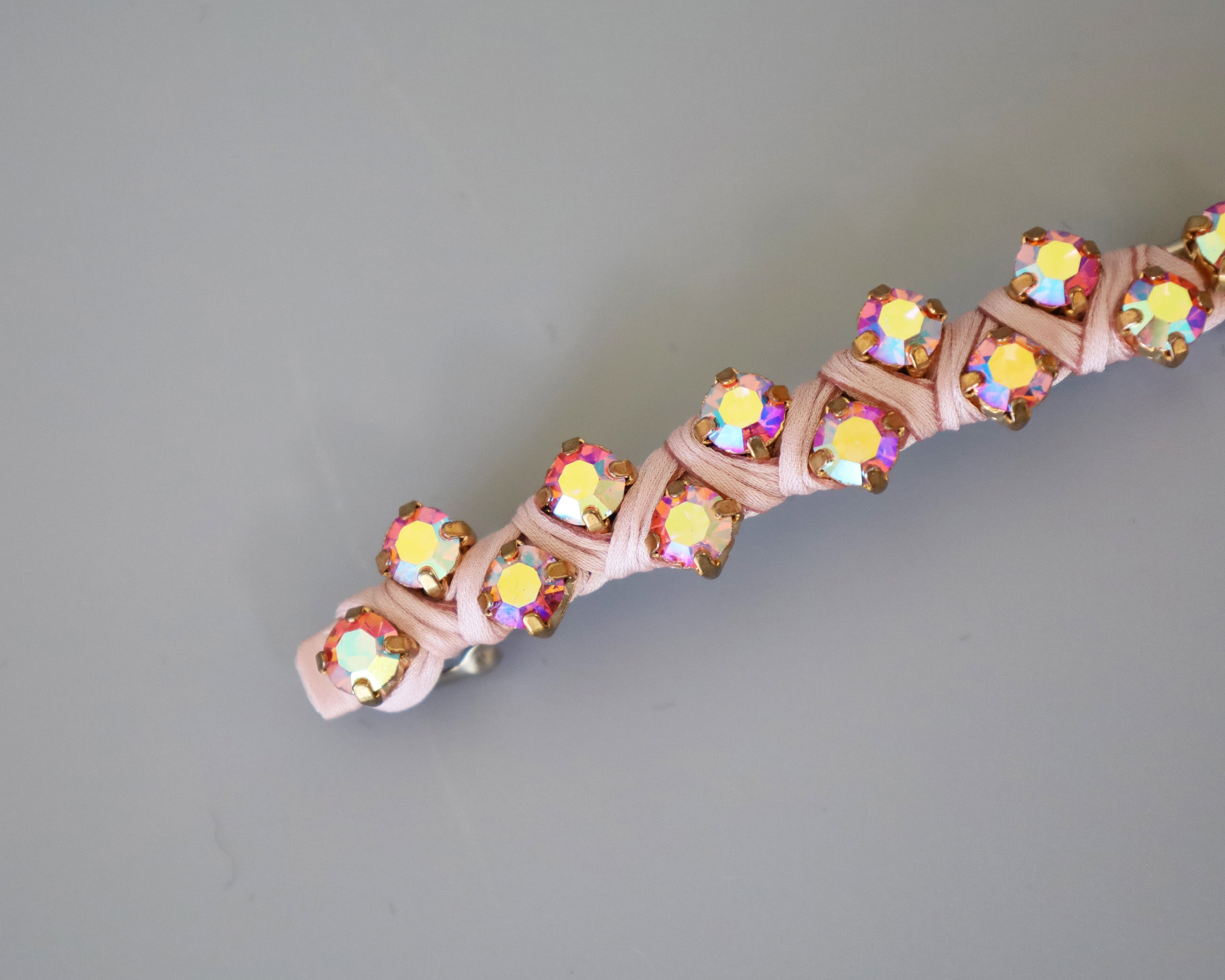 ミルキーなピンクの生地を纏ったボディに、表情豊かにきらめくオーロラピンクビジューをたっぷりデコレーション。