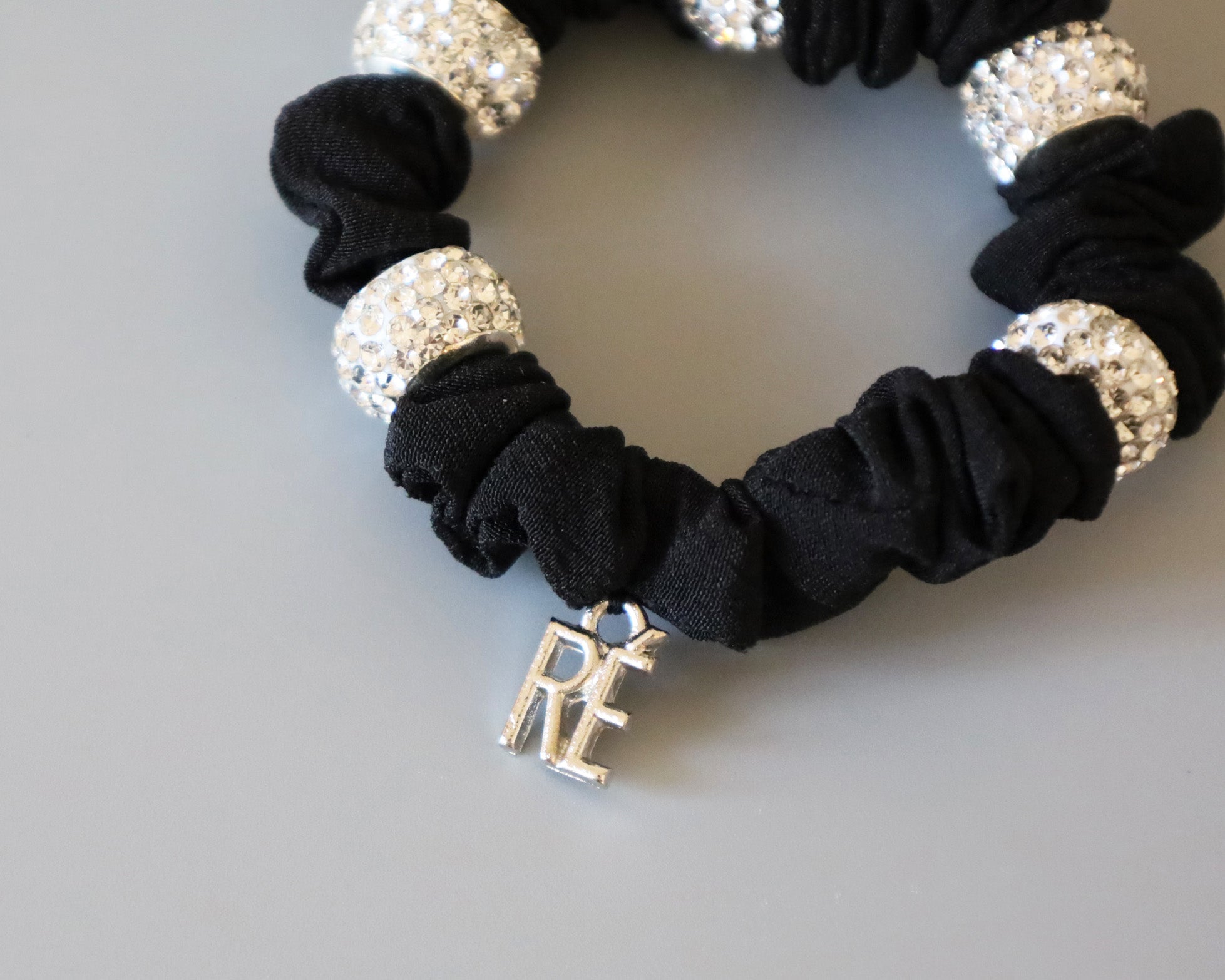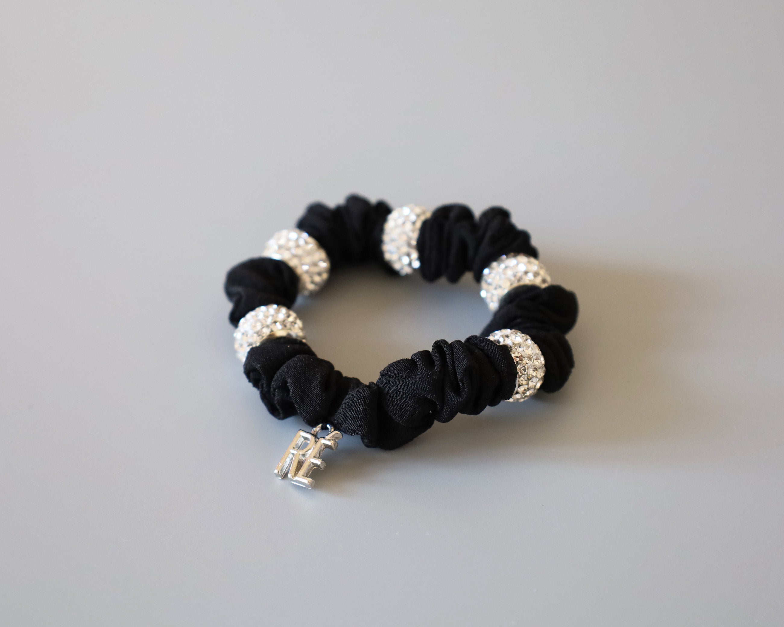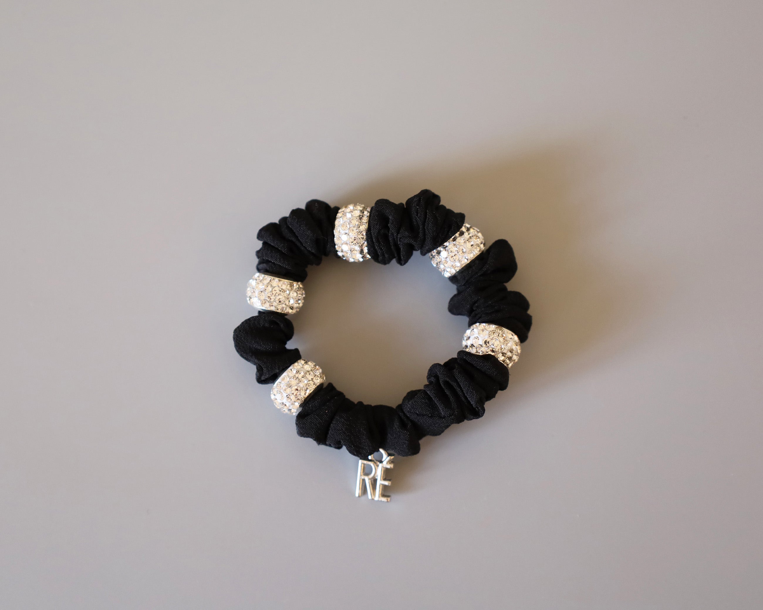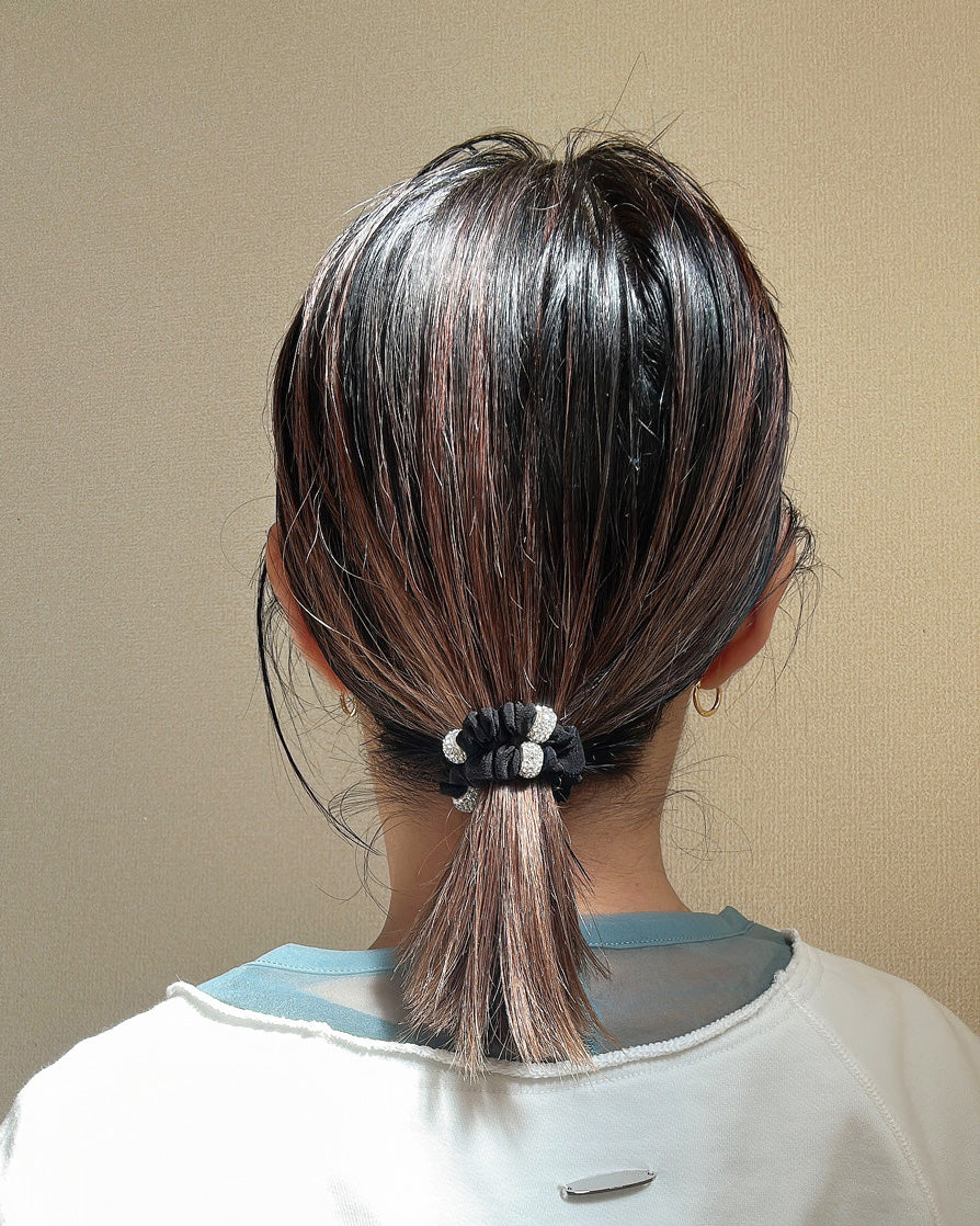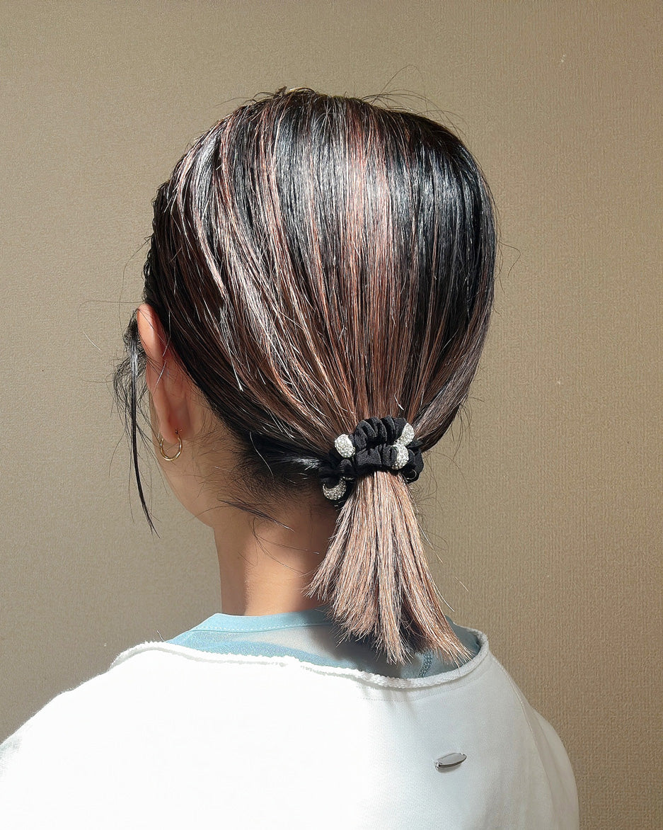 キラキラのビジューリングがリッチにきらめく、ミニシュシュタイプのヘアポニー。
