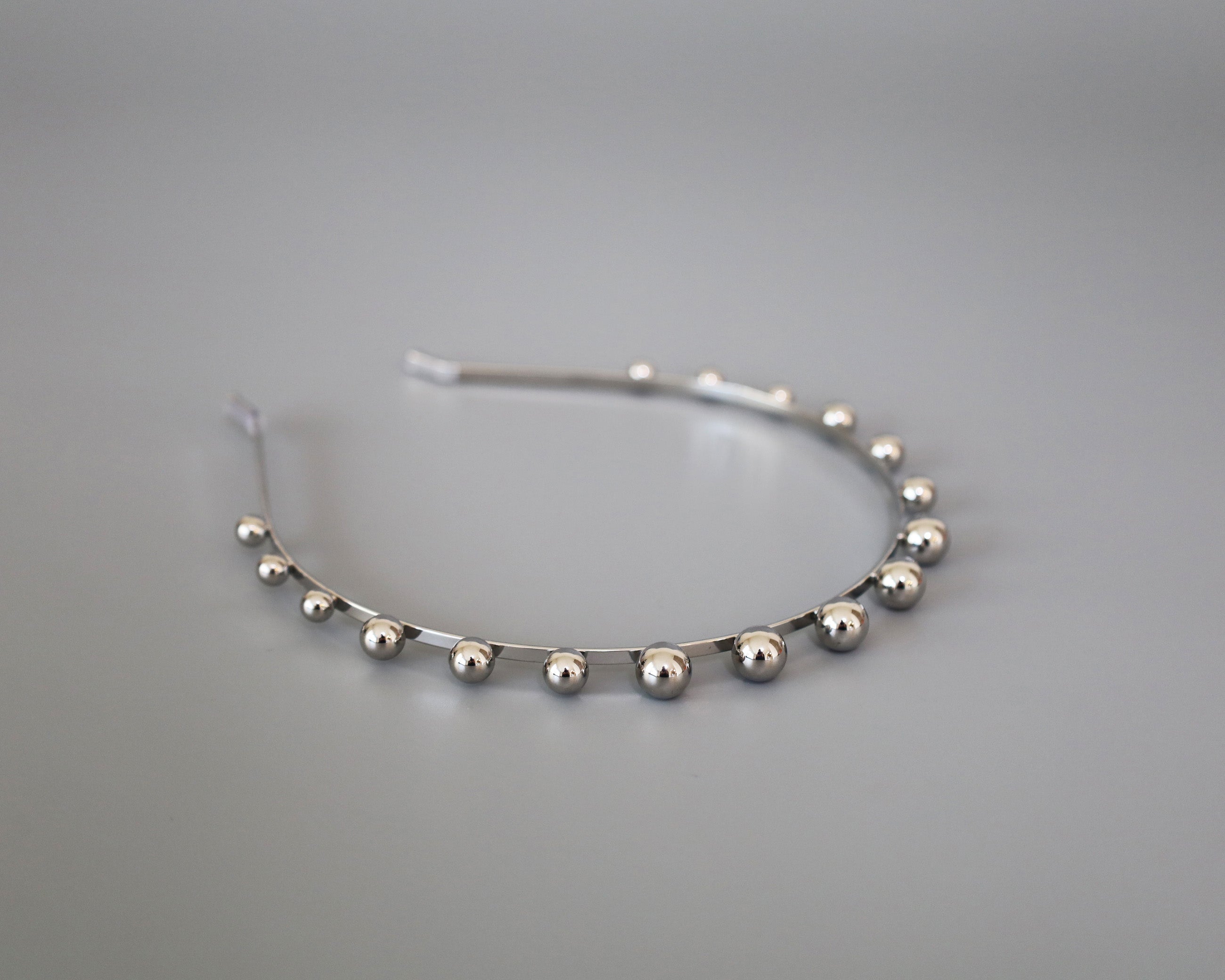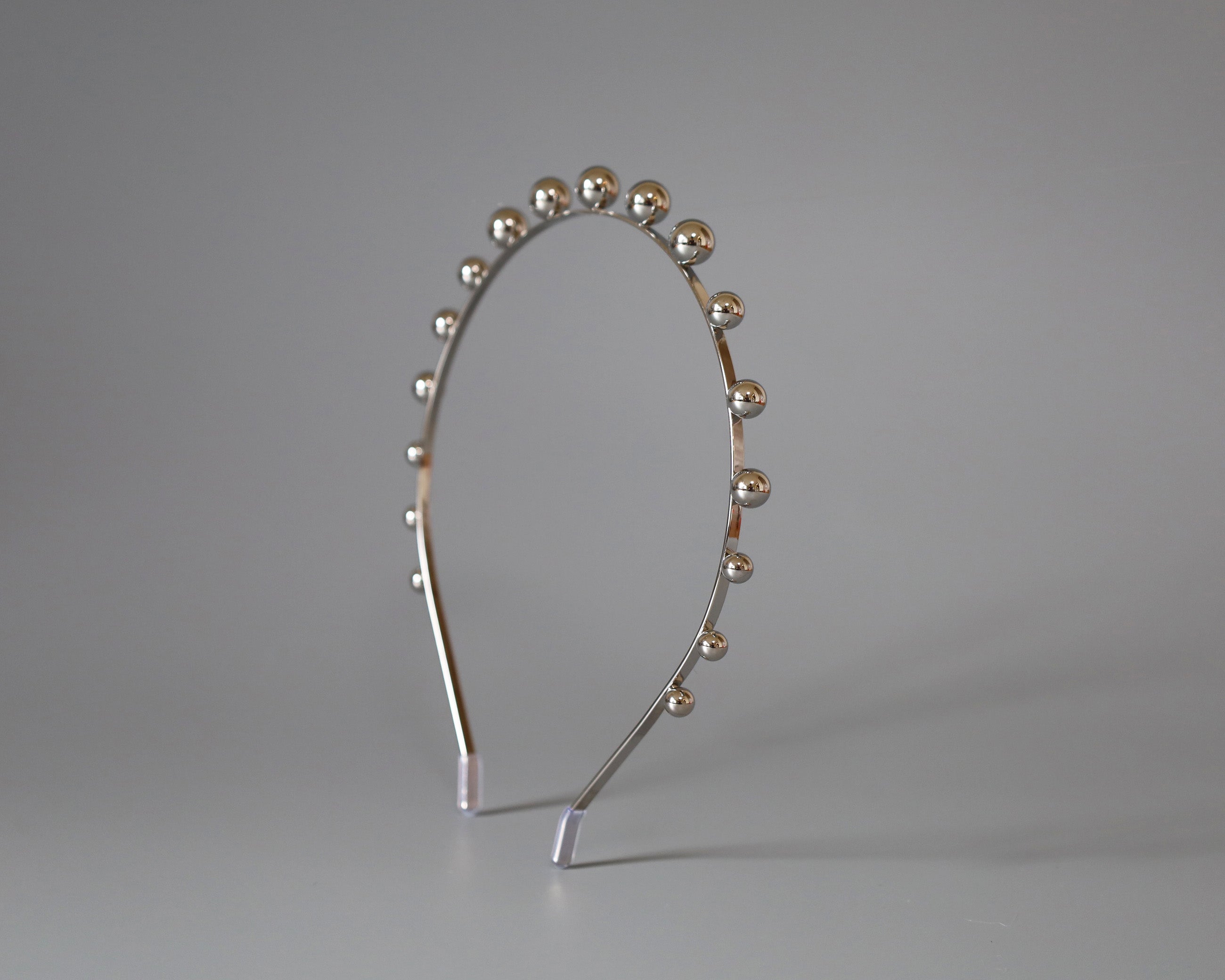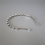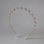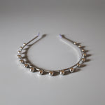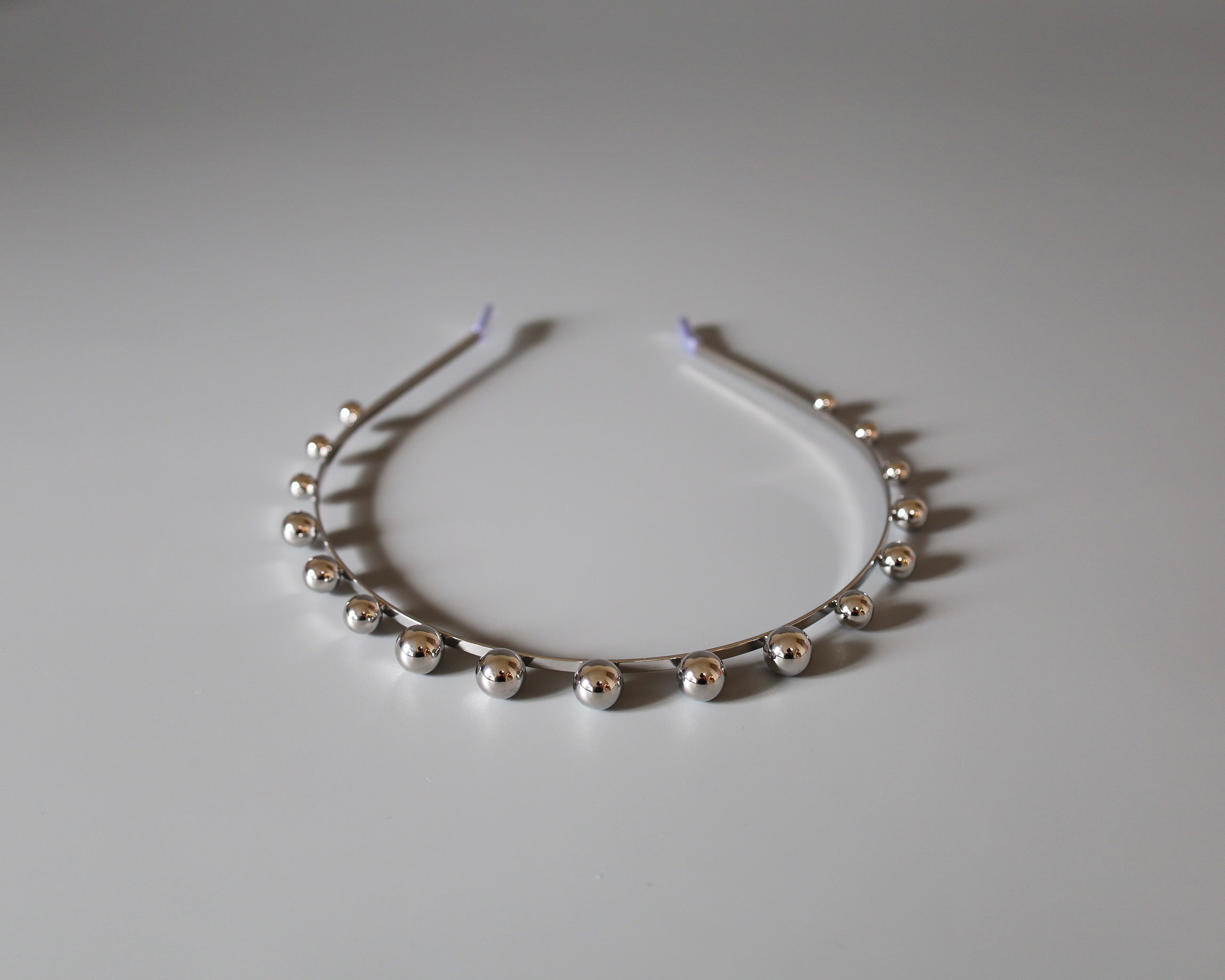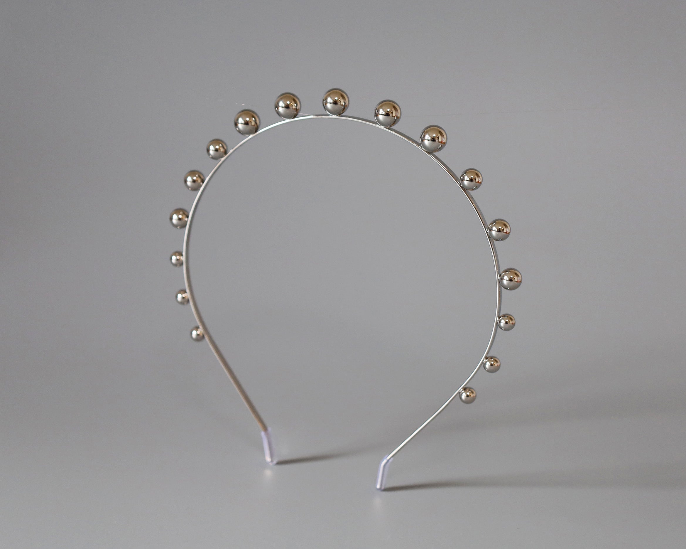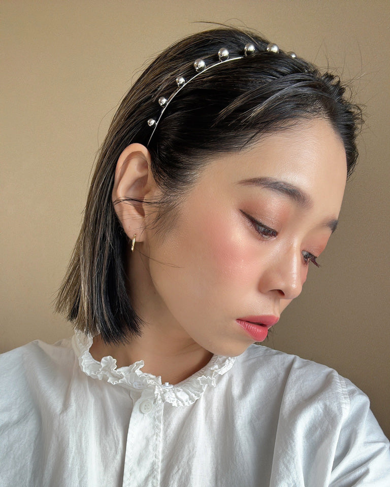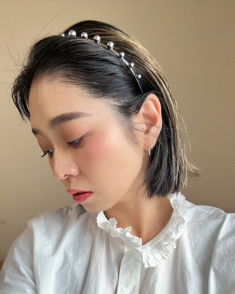 華奢なシルバーのメタルカチューシャに、メタルボールパーツを並べたフォルムで遊ぶデザイン。