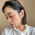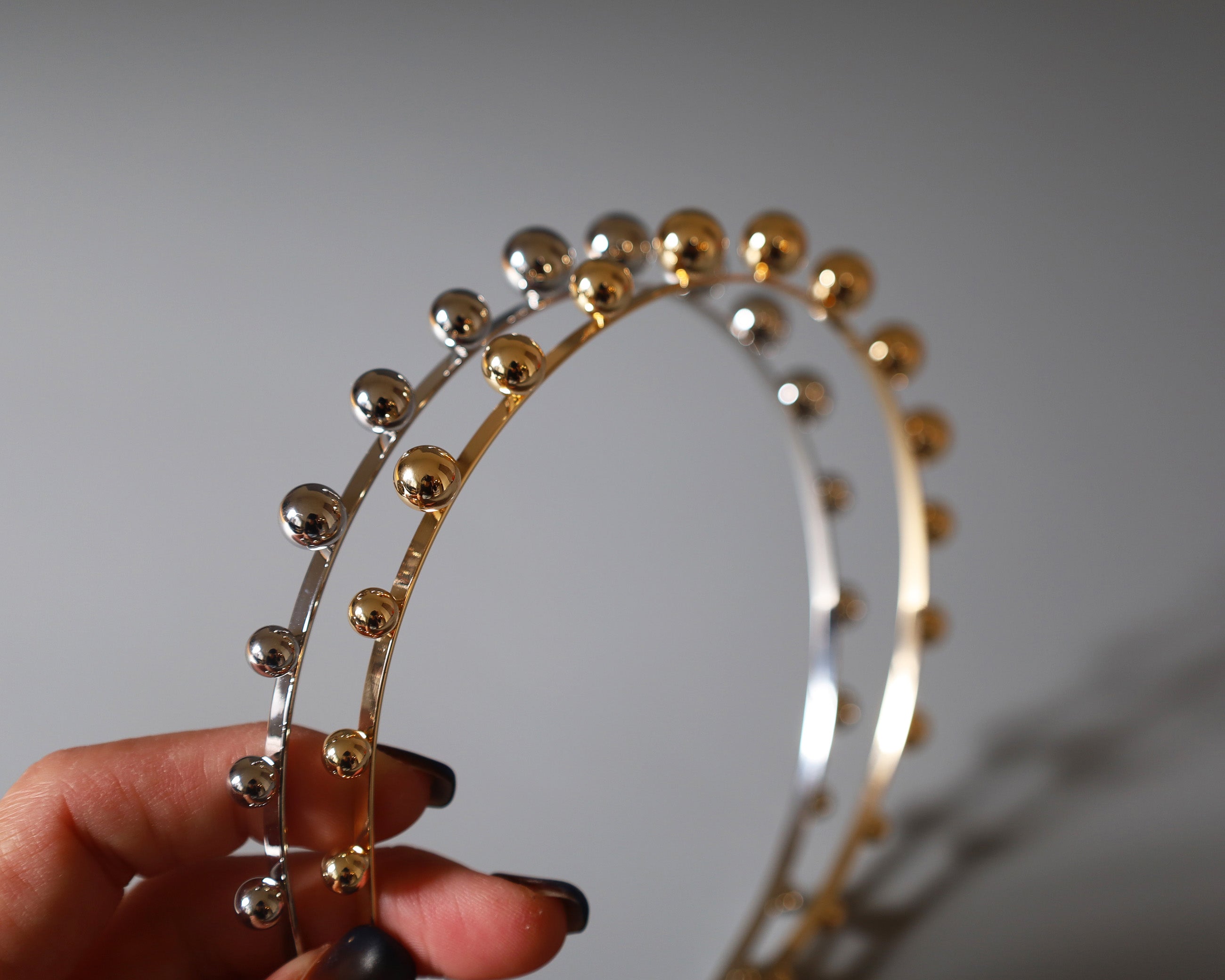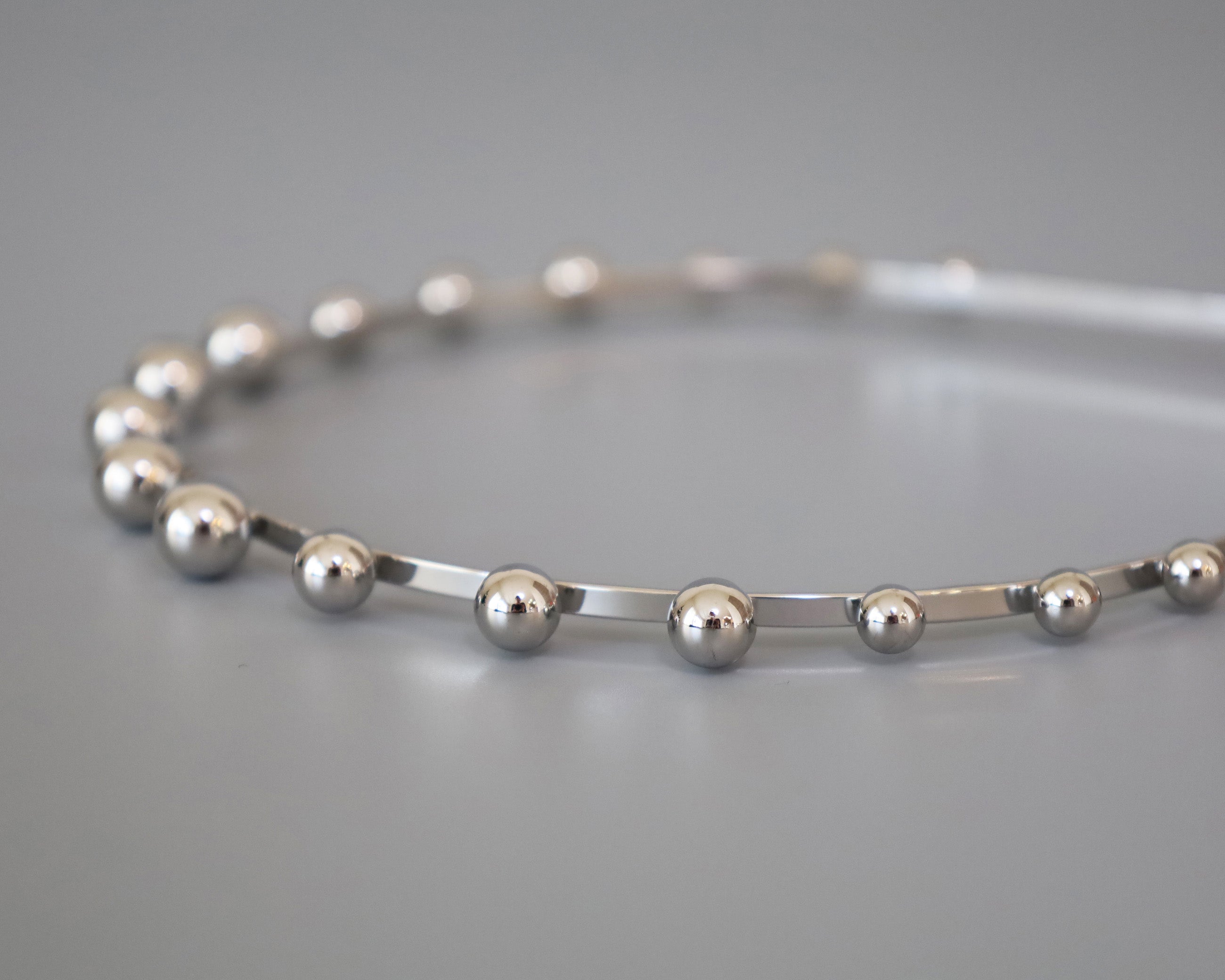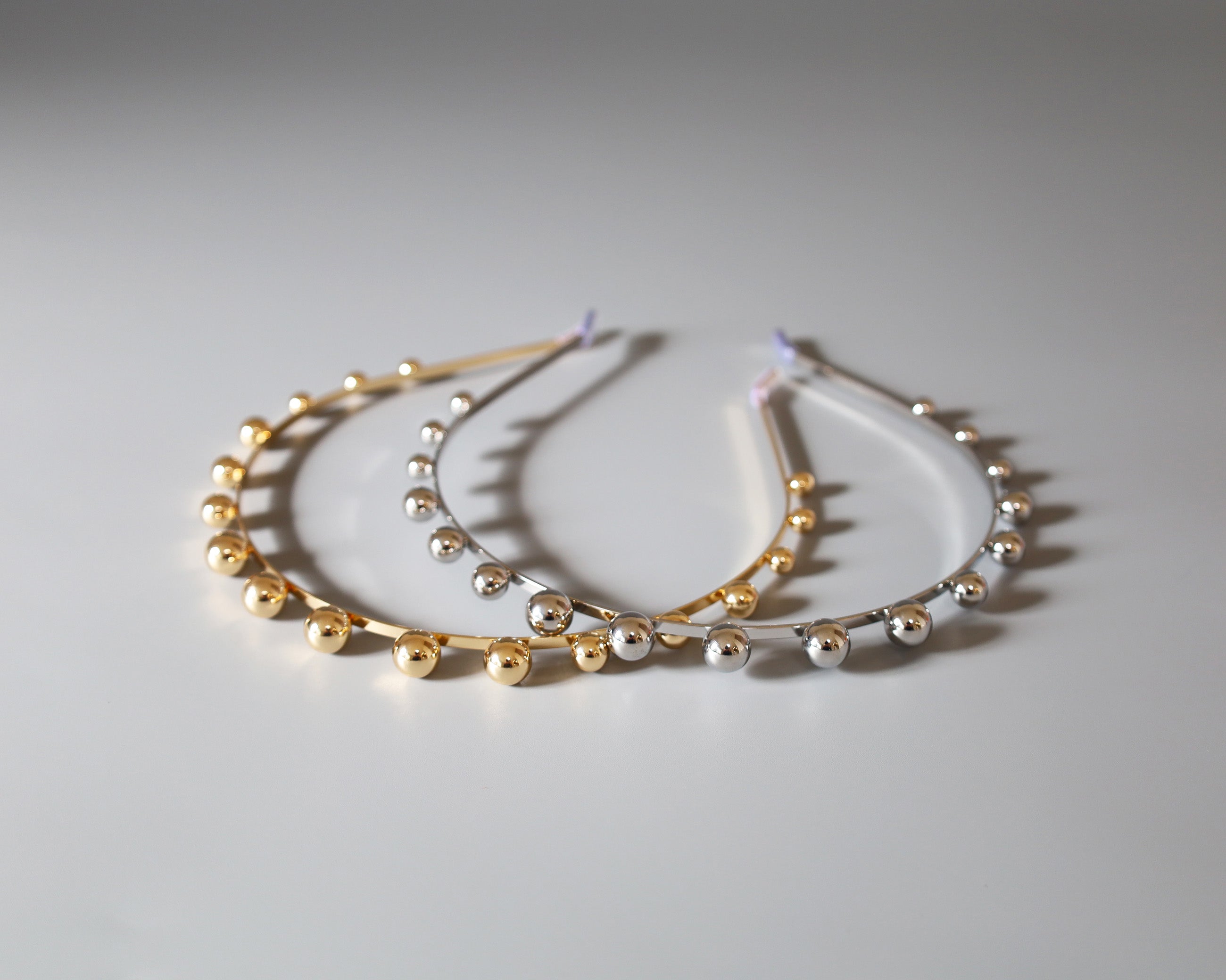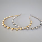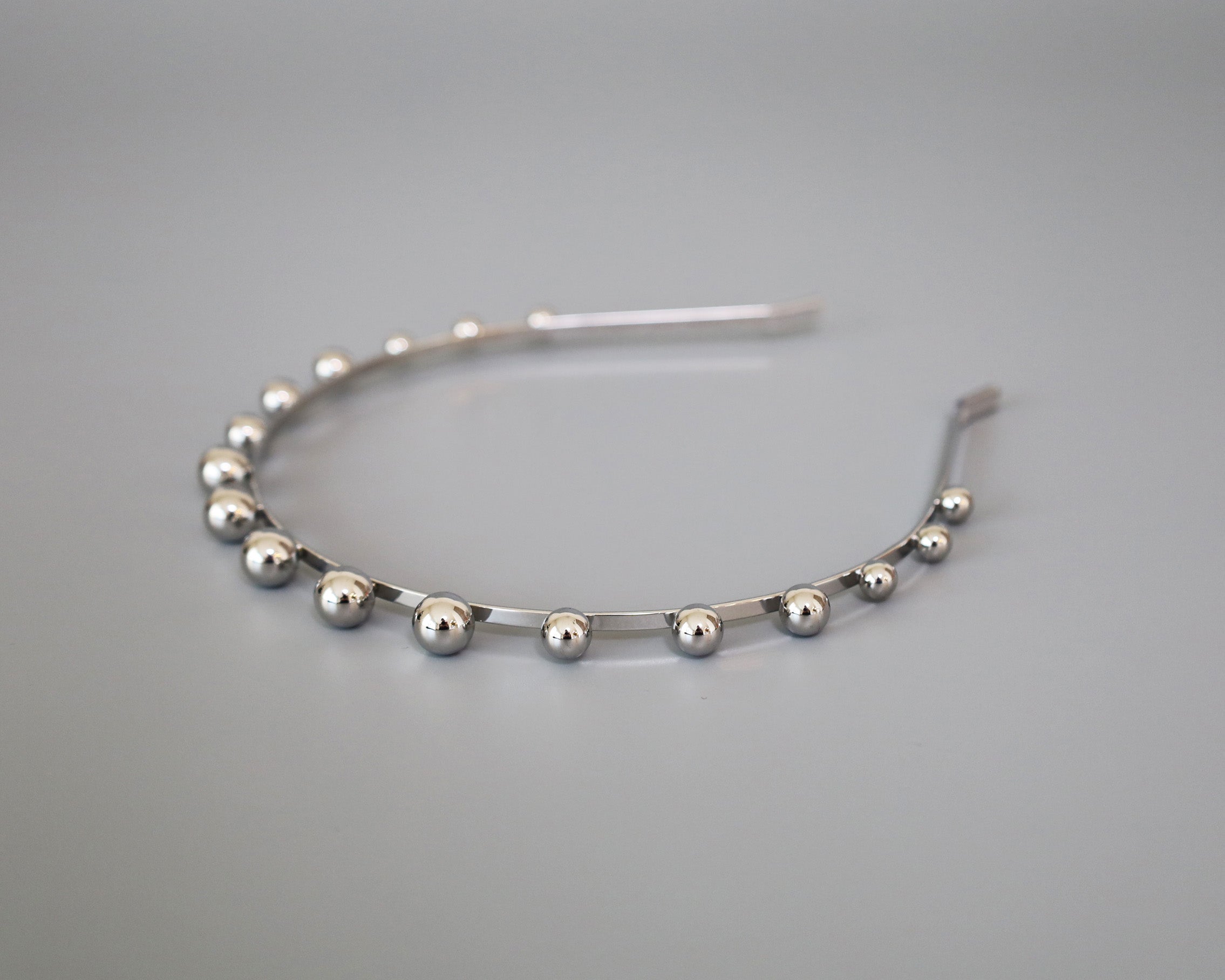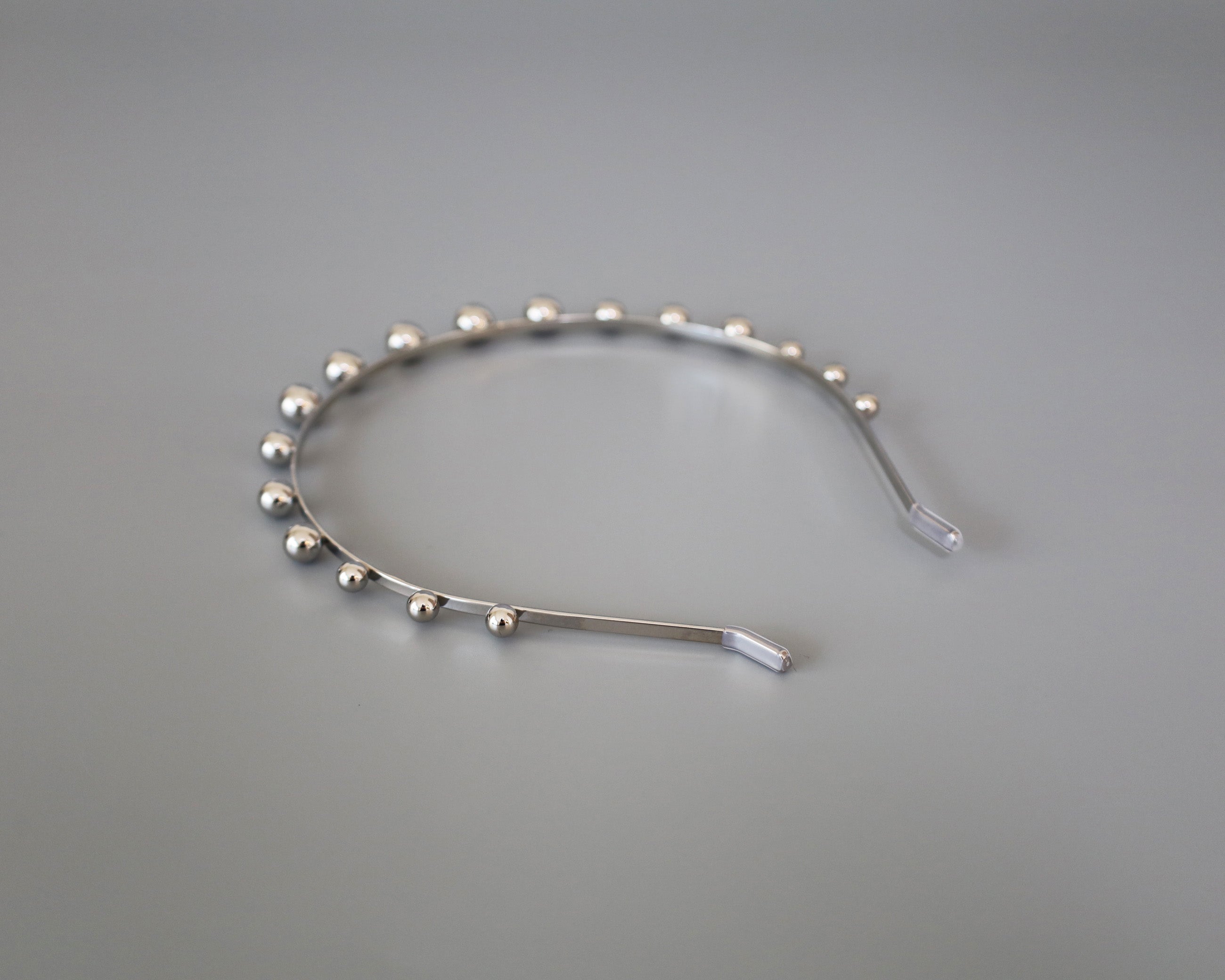 華奢なシルバーのメタルカチューシャに、メタルボールパーツを並べたフォルムで遊ぶデザイン。
