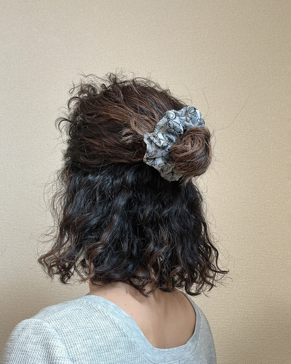 サイズ違いで2つ揃えて使いたくなるリボン柄シュシュ。