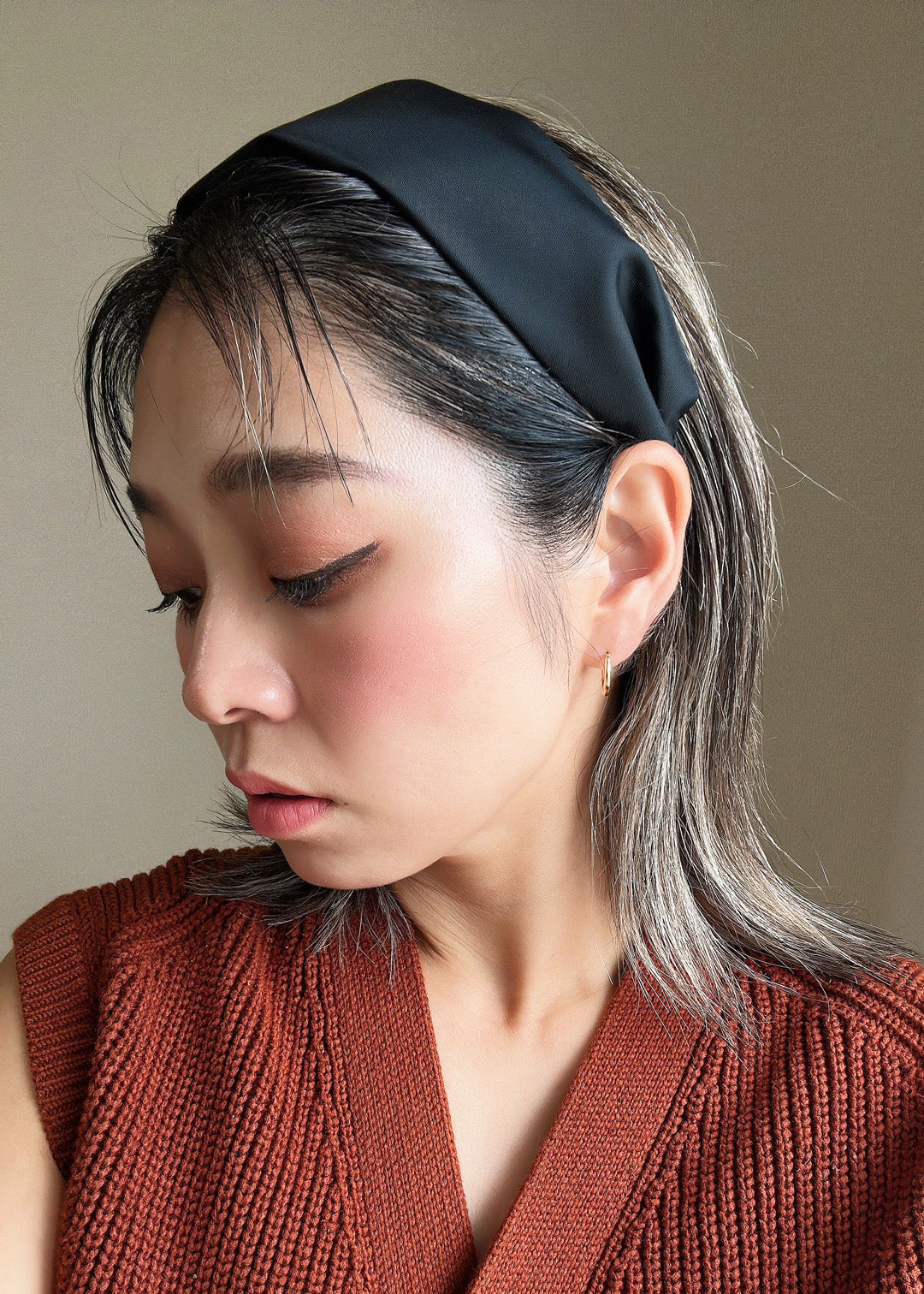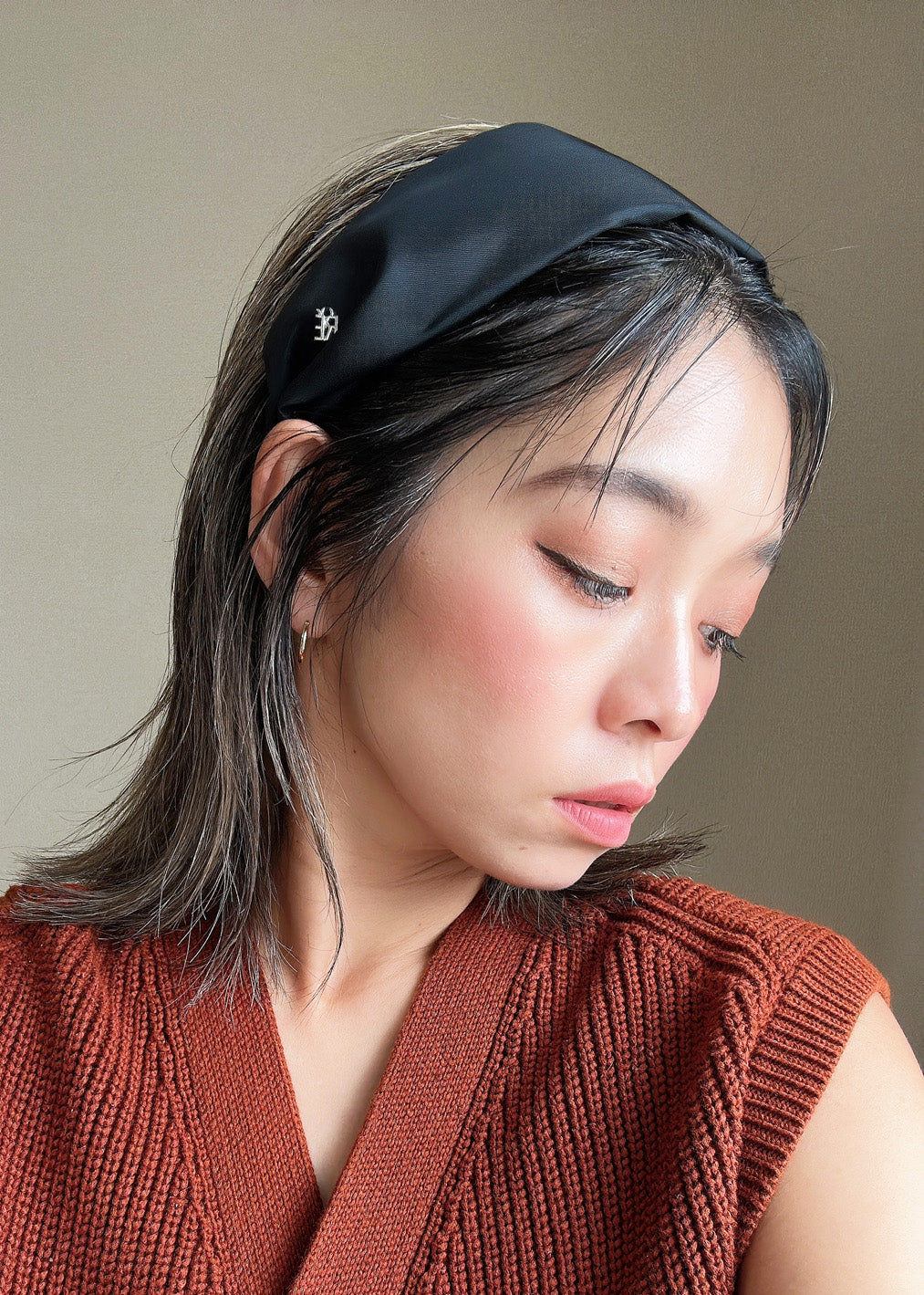 ブラックワンカラーで仕立てた、ターバン風な幅広カチューシャ。