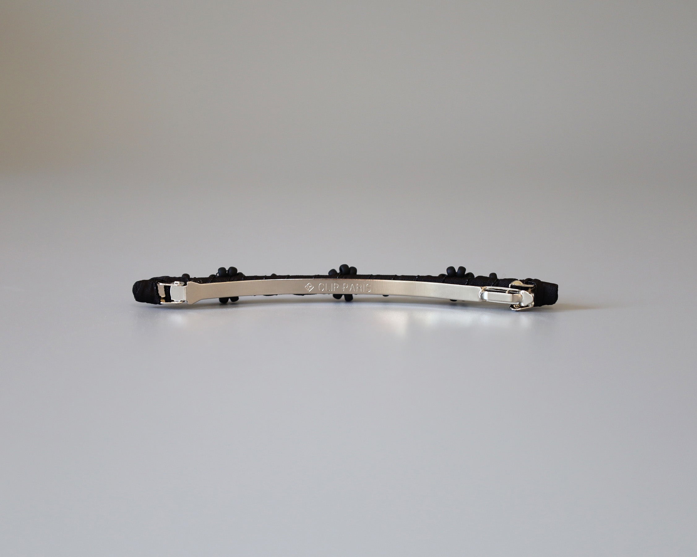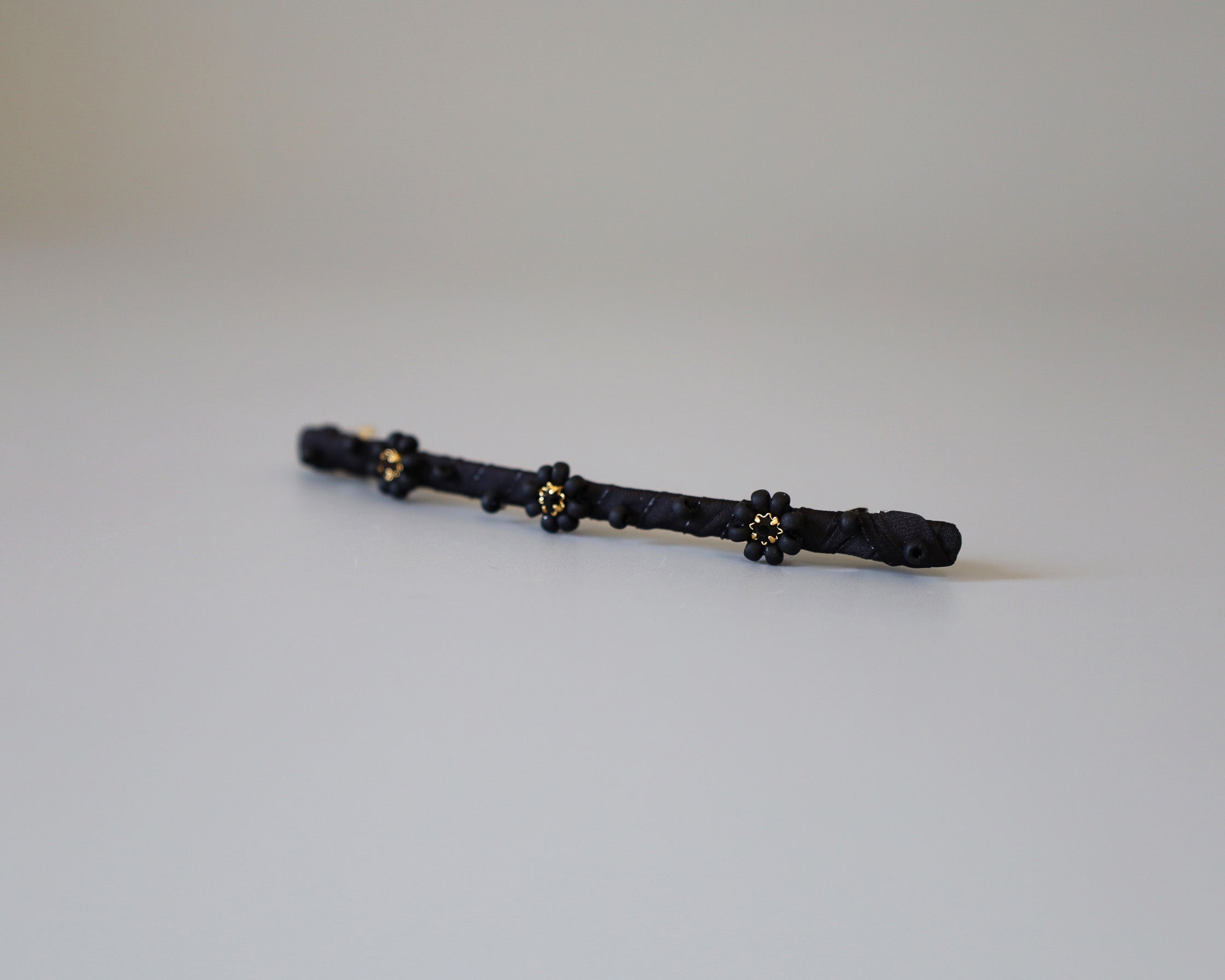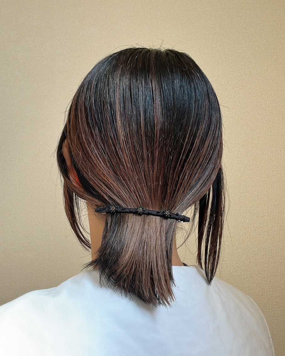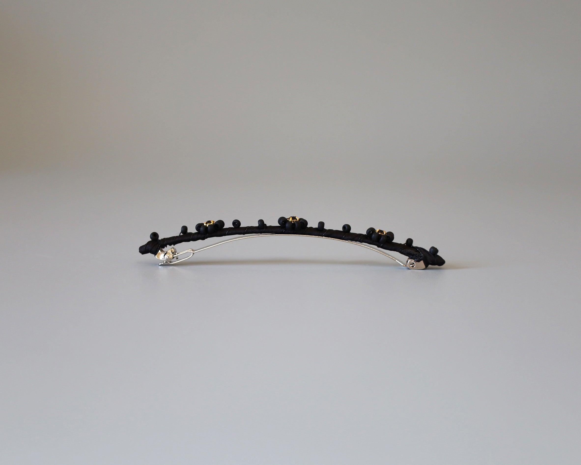 ブラックの生地をタイトに巻き付けたヘアバレッタ。