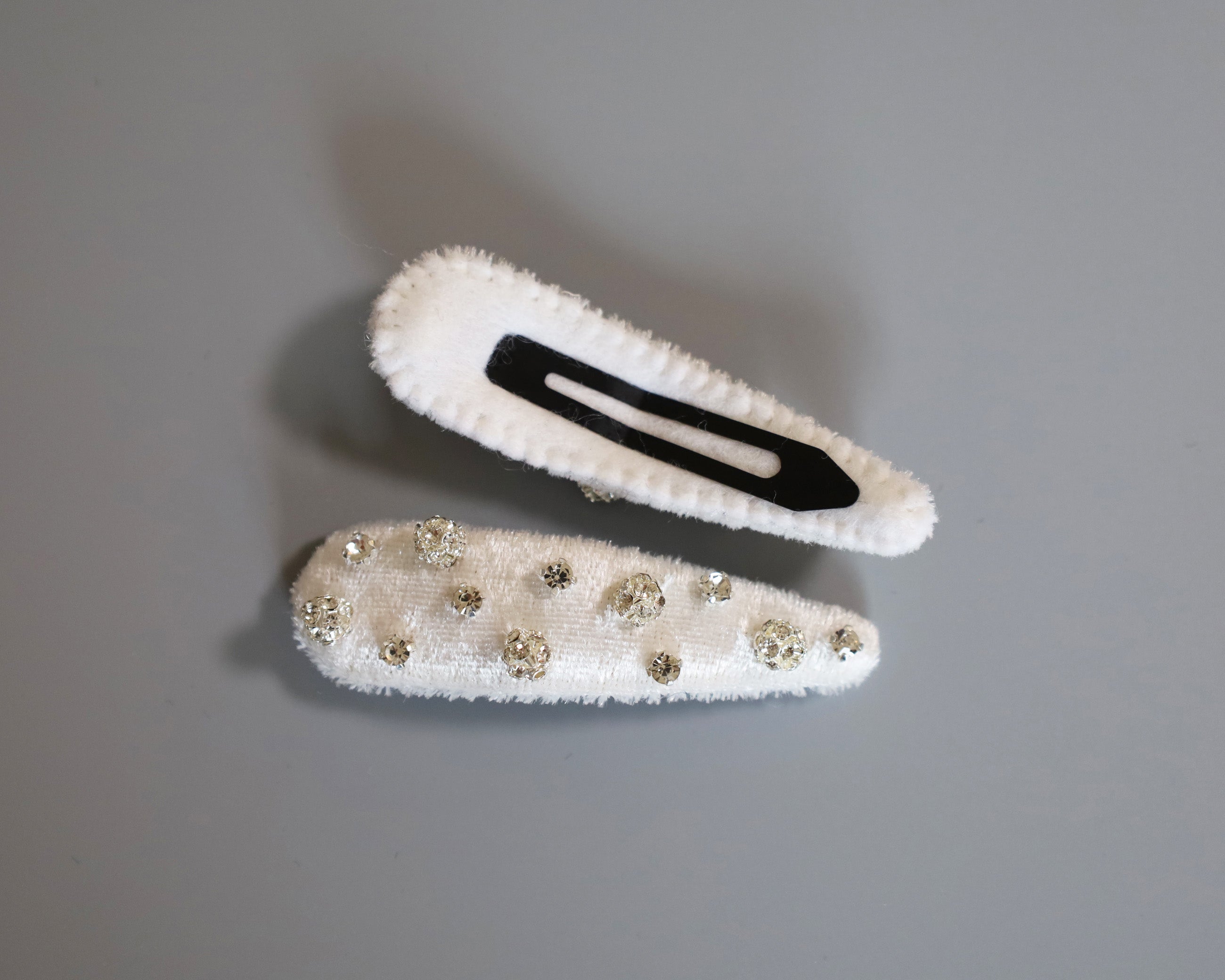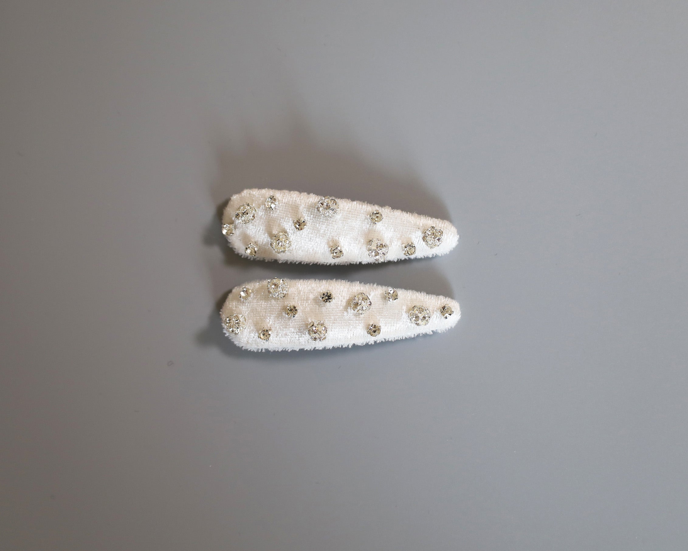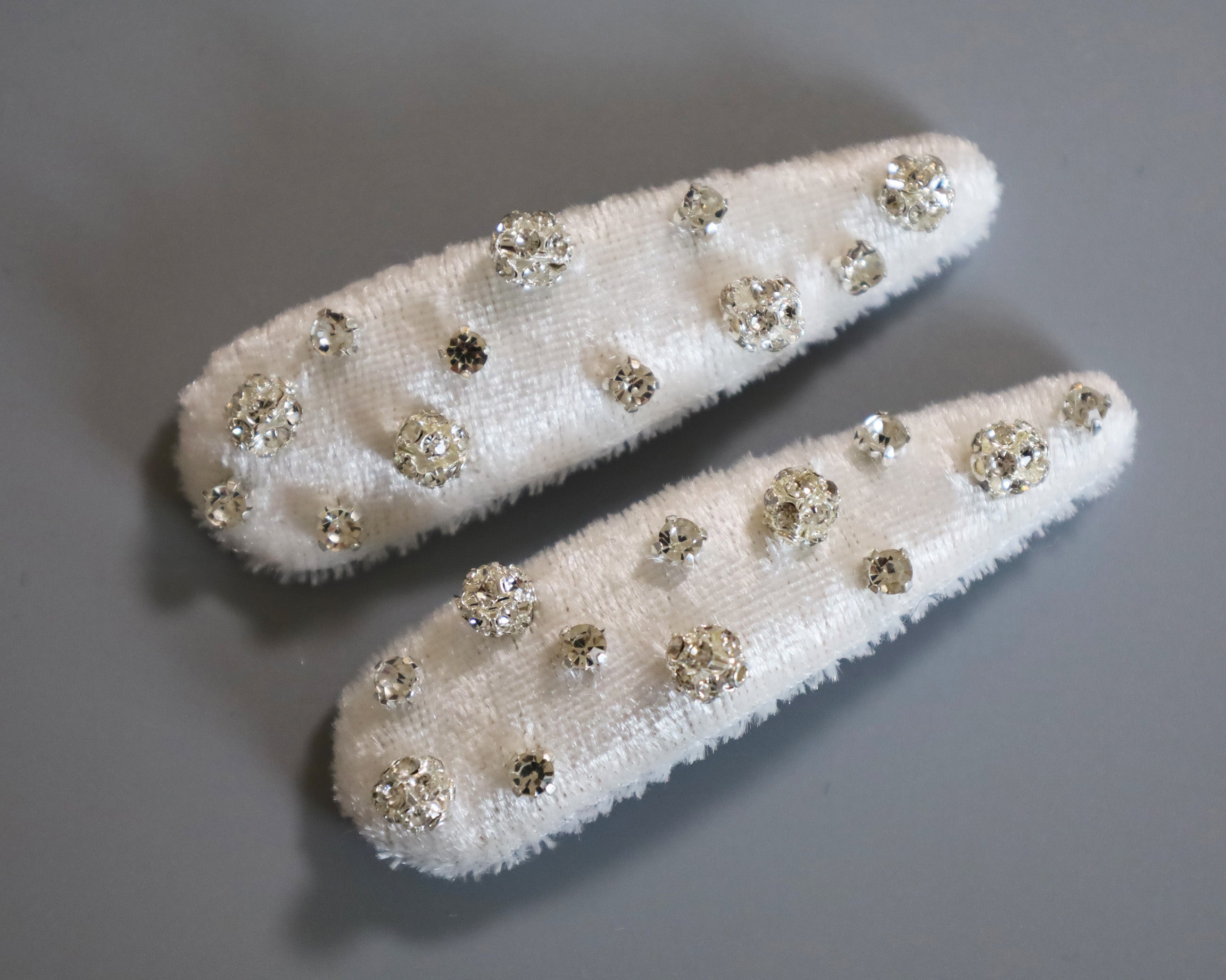 ホワイトのベロアにクリアビジューを散りばめたヘアピン。