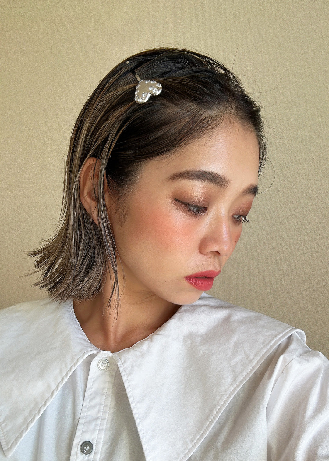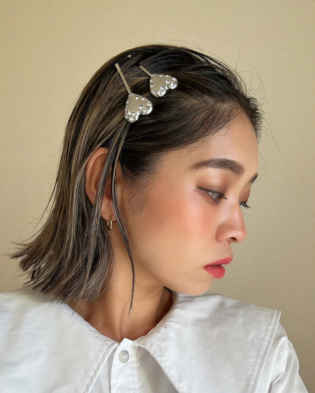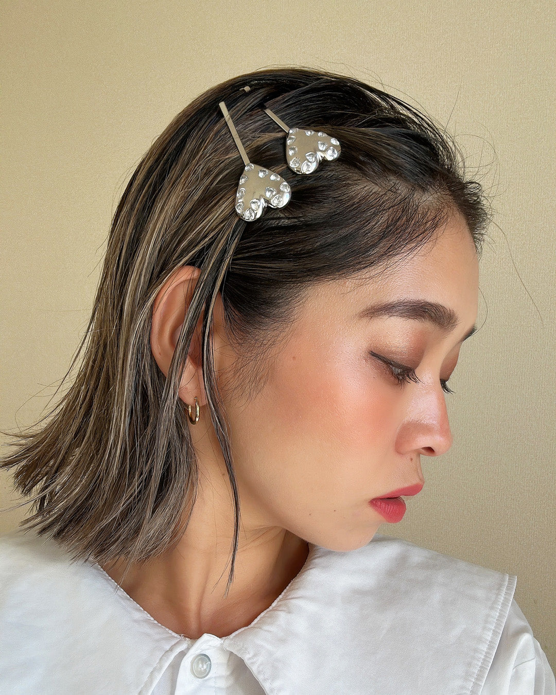 The plump heart motif and sparkling heart-shaped bijoux create a mature and lovely impression.