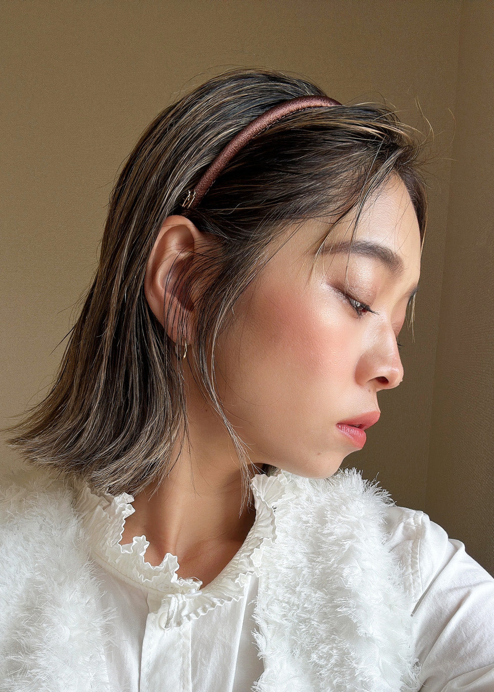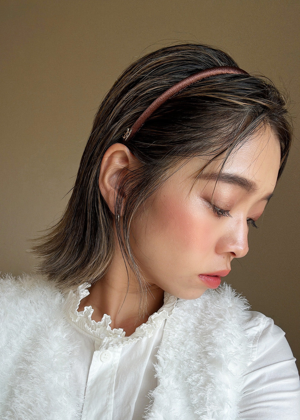 スキニーボディでさりげないおしゃれを叶えるブラウンカチューシャ。