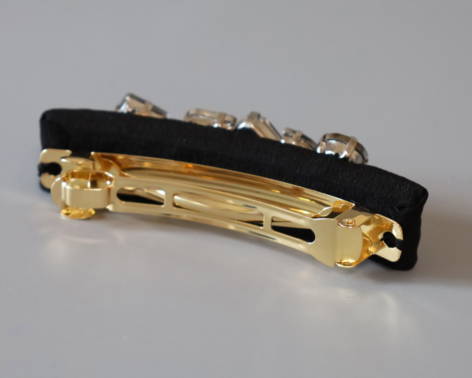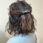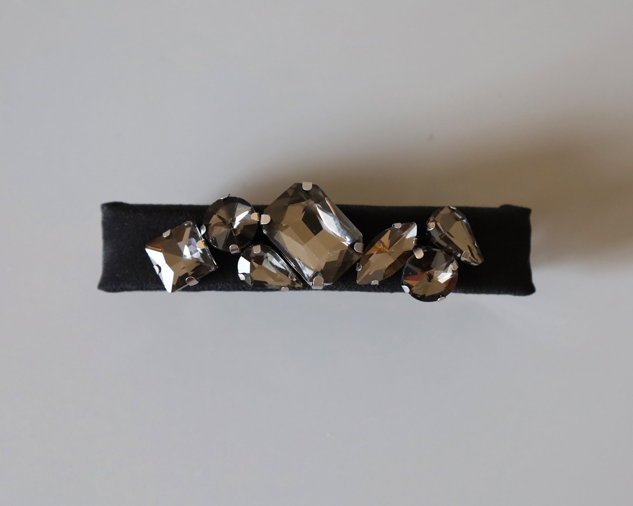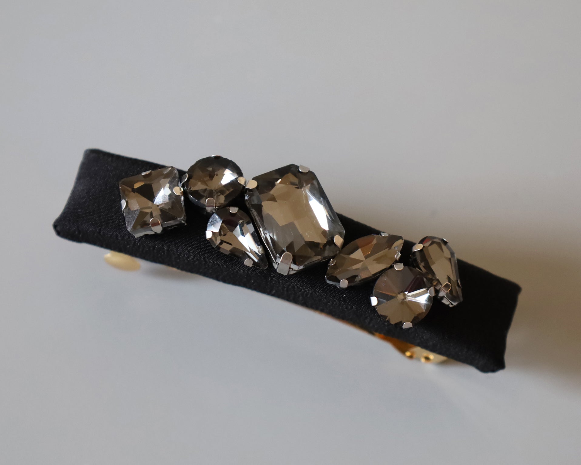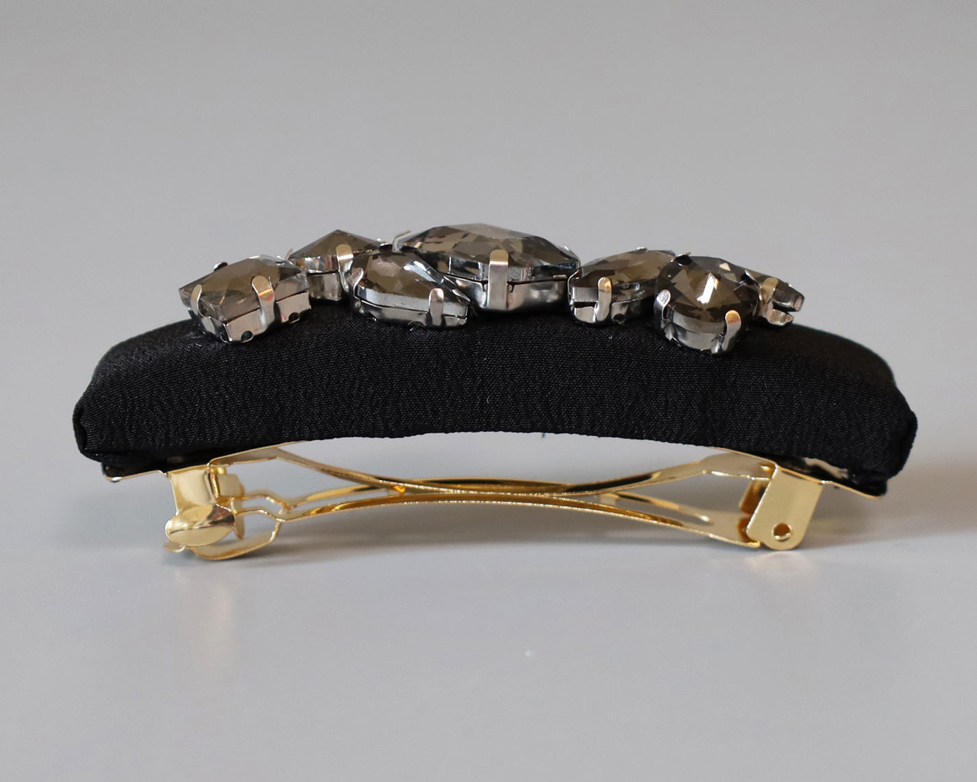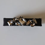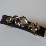ブラックシルクにスモーキーなブラックビジューを重ねたヘアバレッタ。