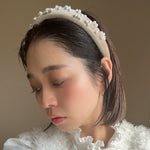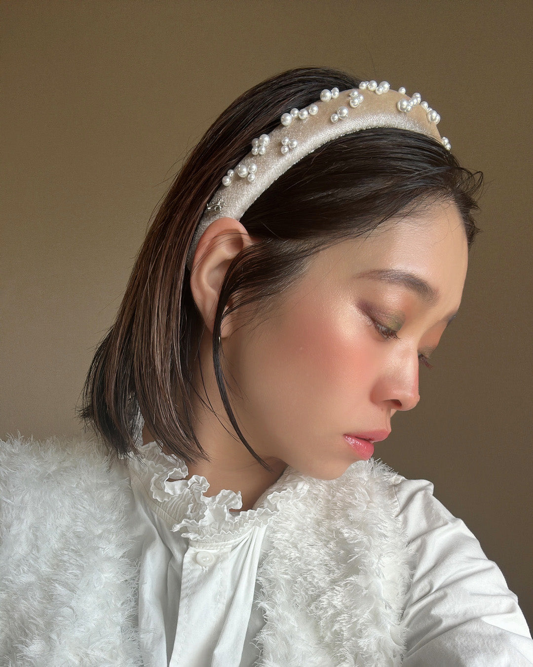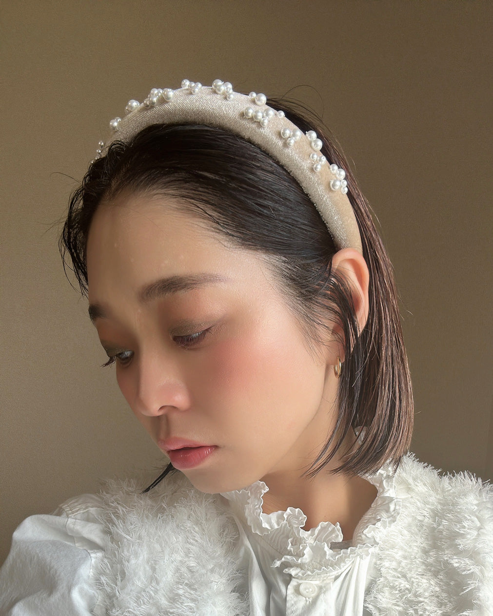 なめらかなベージュカラーのカチューシャに重ねるのは、上品な輝きのパール。