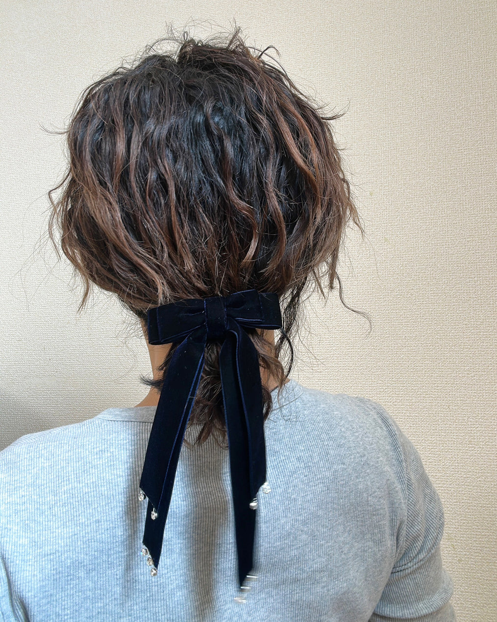 リボンの長さを活かして高めに作ったハーフアップもフェミニンでおすすめです。