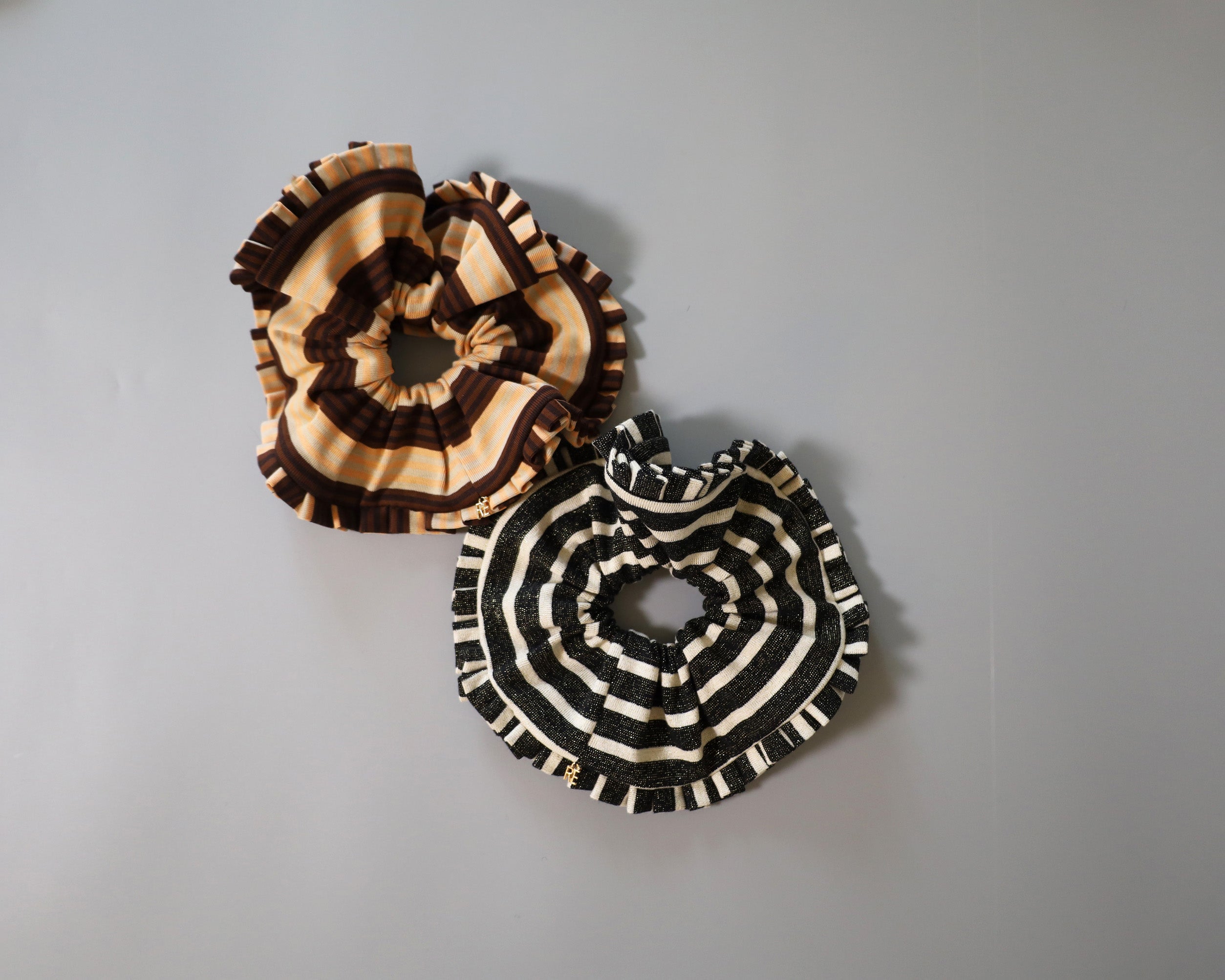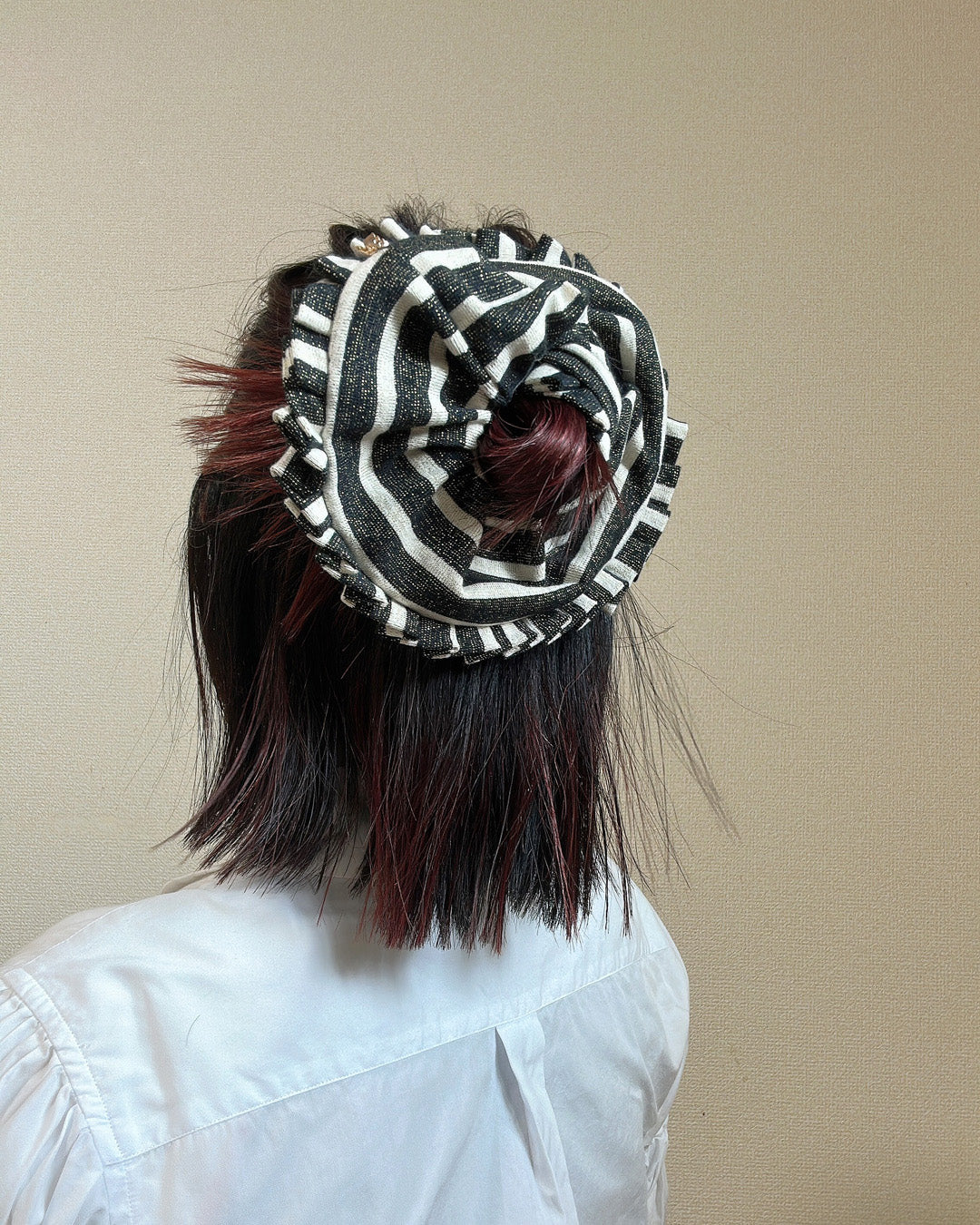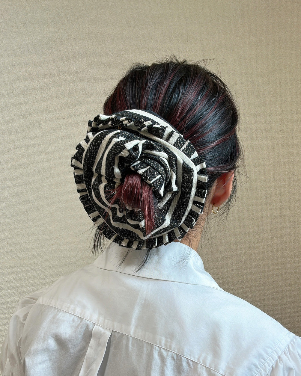 バックスタイルが華やぐボリューミーさで、ロングはもちろん短めヘアにもおすすめなシュシュ。