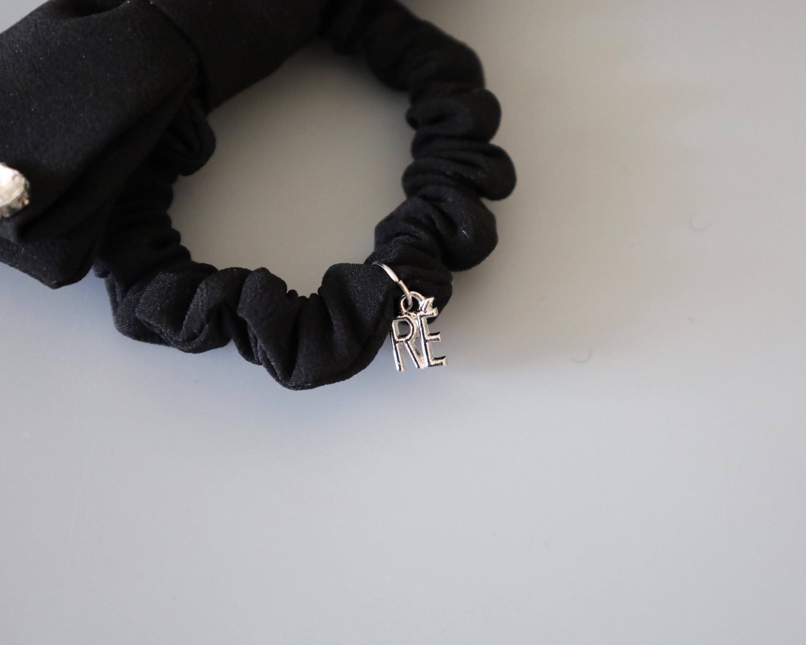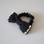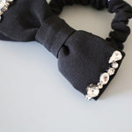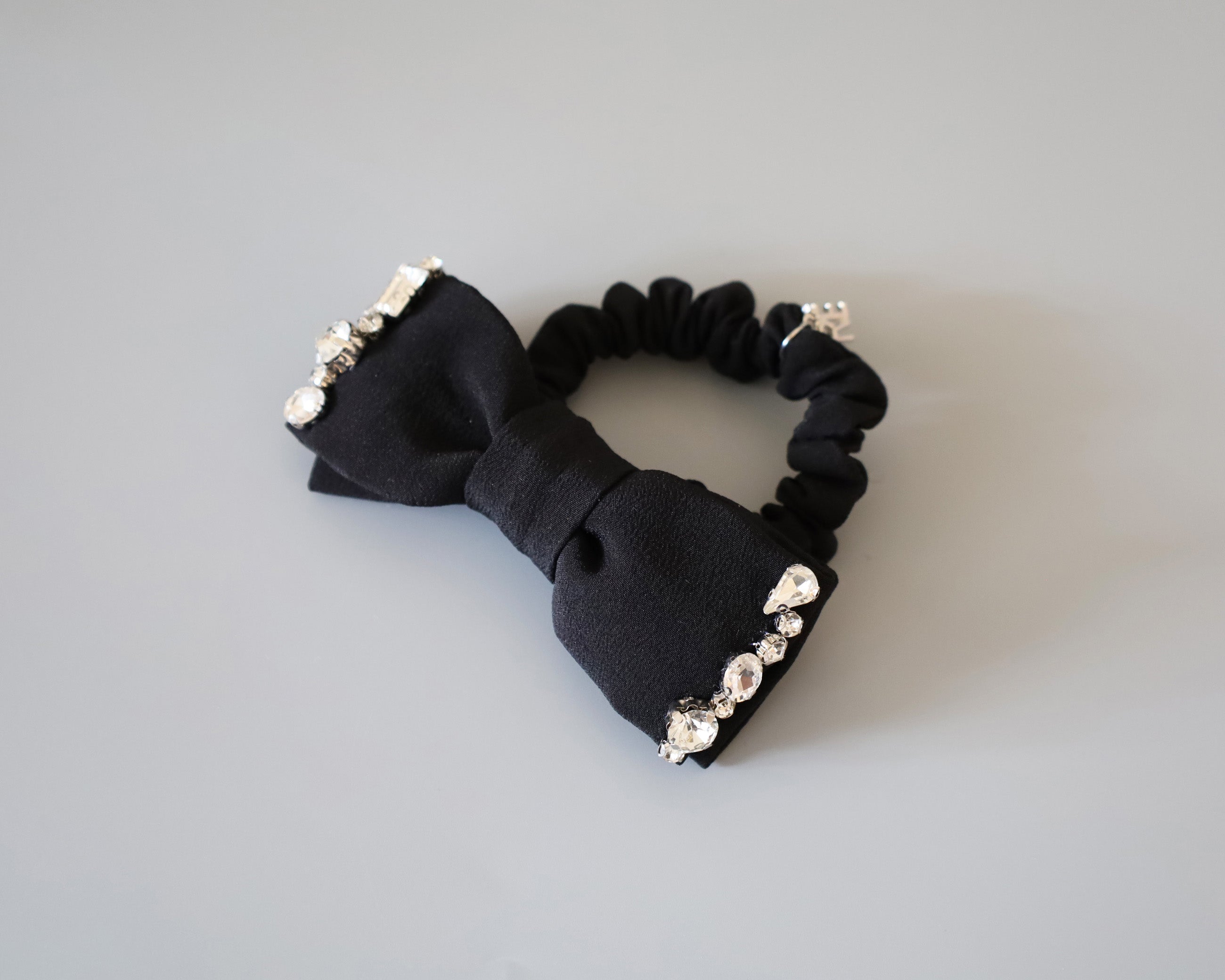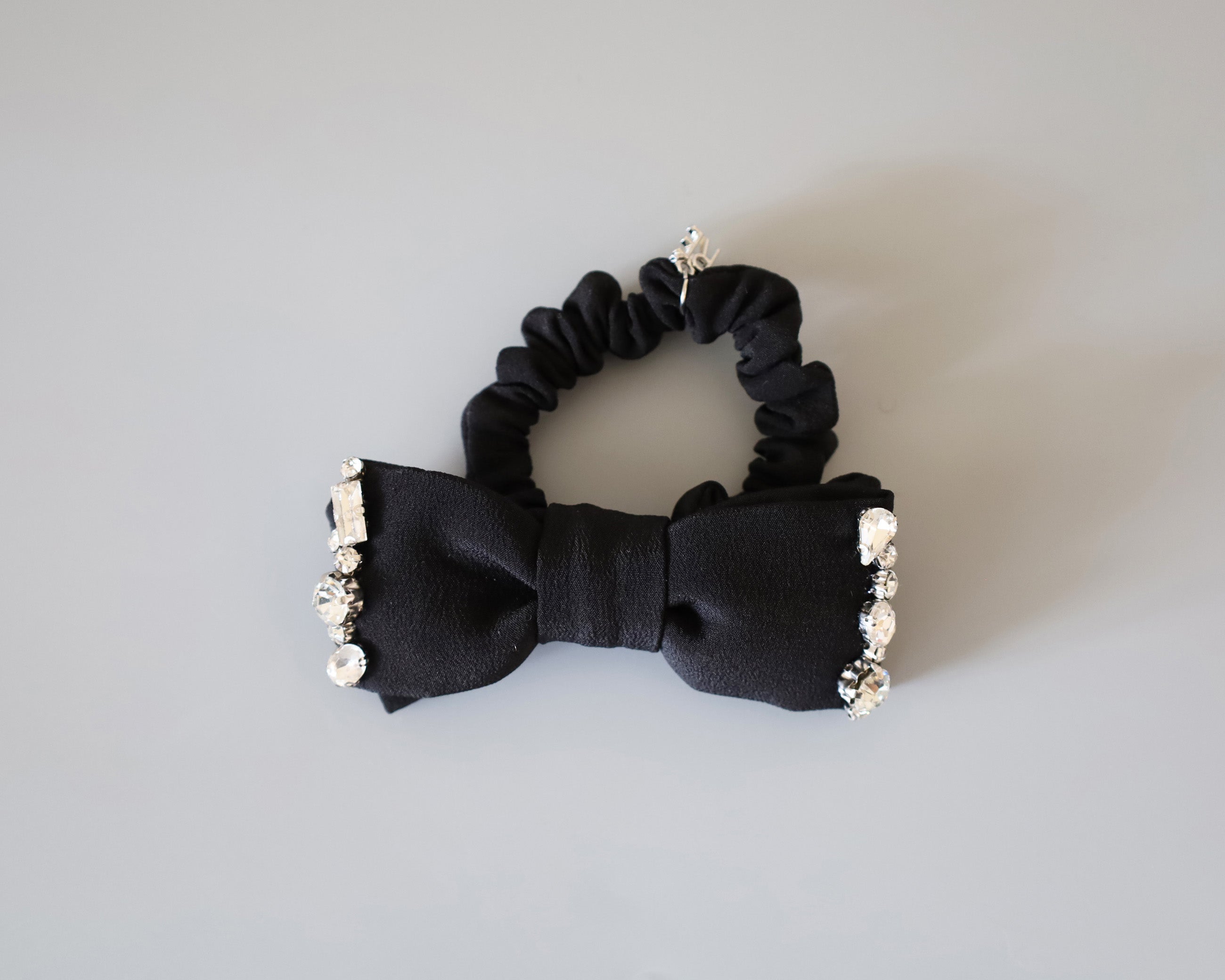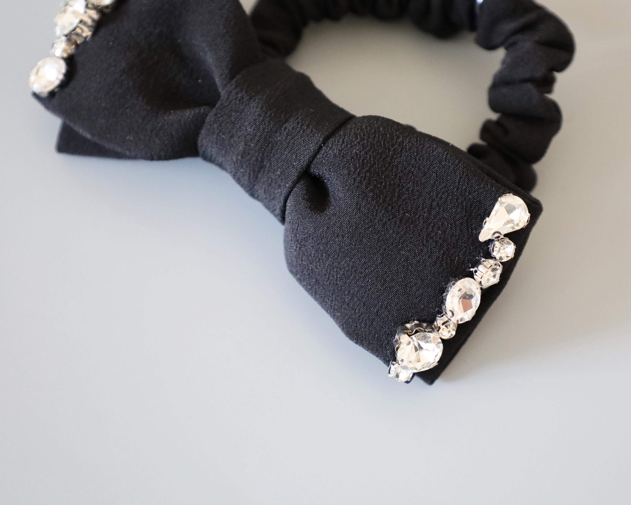 ブラックリボンの両サイドにはシルバー×クリアビジューをあしらい、揺れるエレガンスを演出。