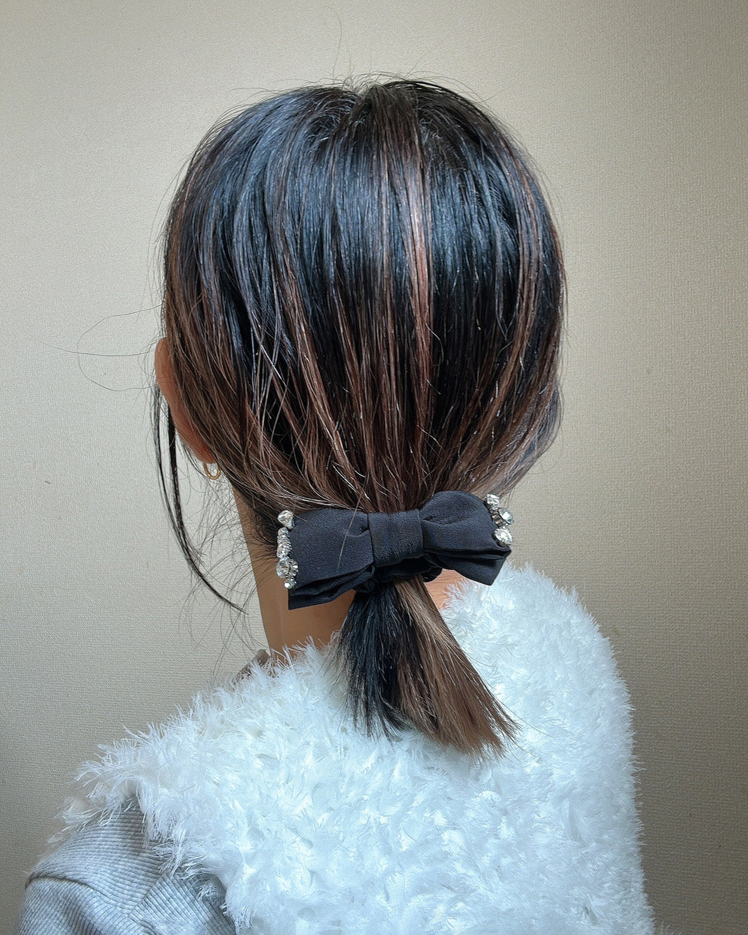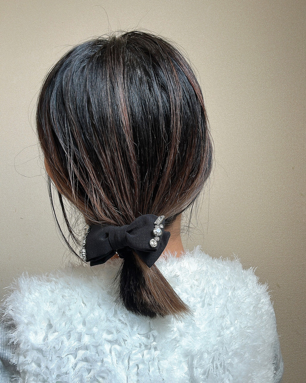 普通のヘアゴムからこのリボンポニーに変えるだけで、いつものスタイルが垢抜け。