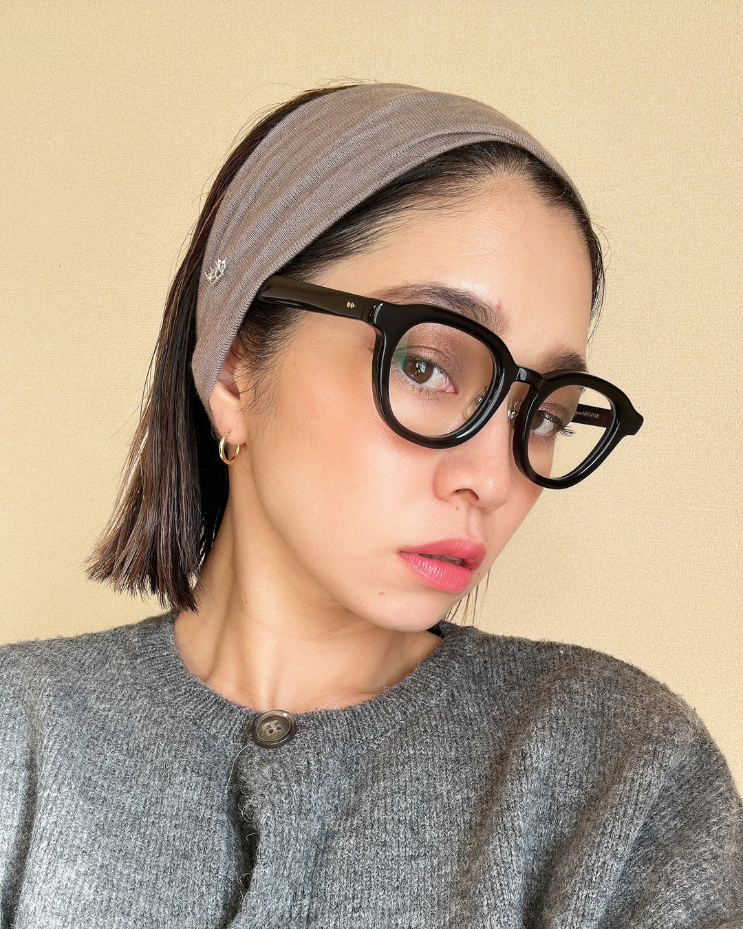 肌なじみのいいニュアンス感あるグレージュがこなれた雰囲気のターバン。