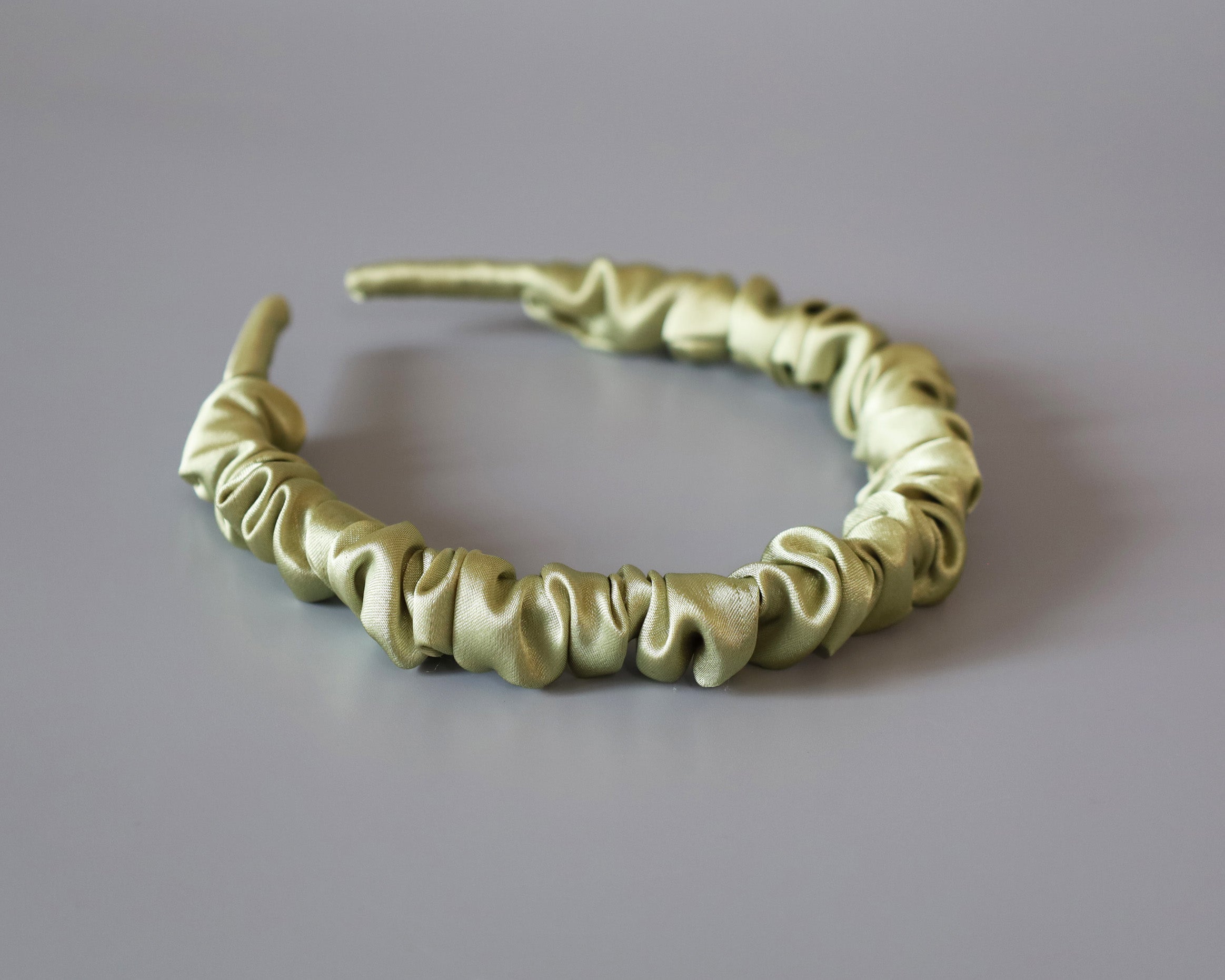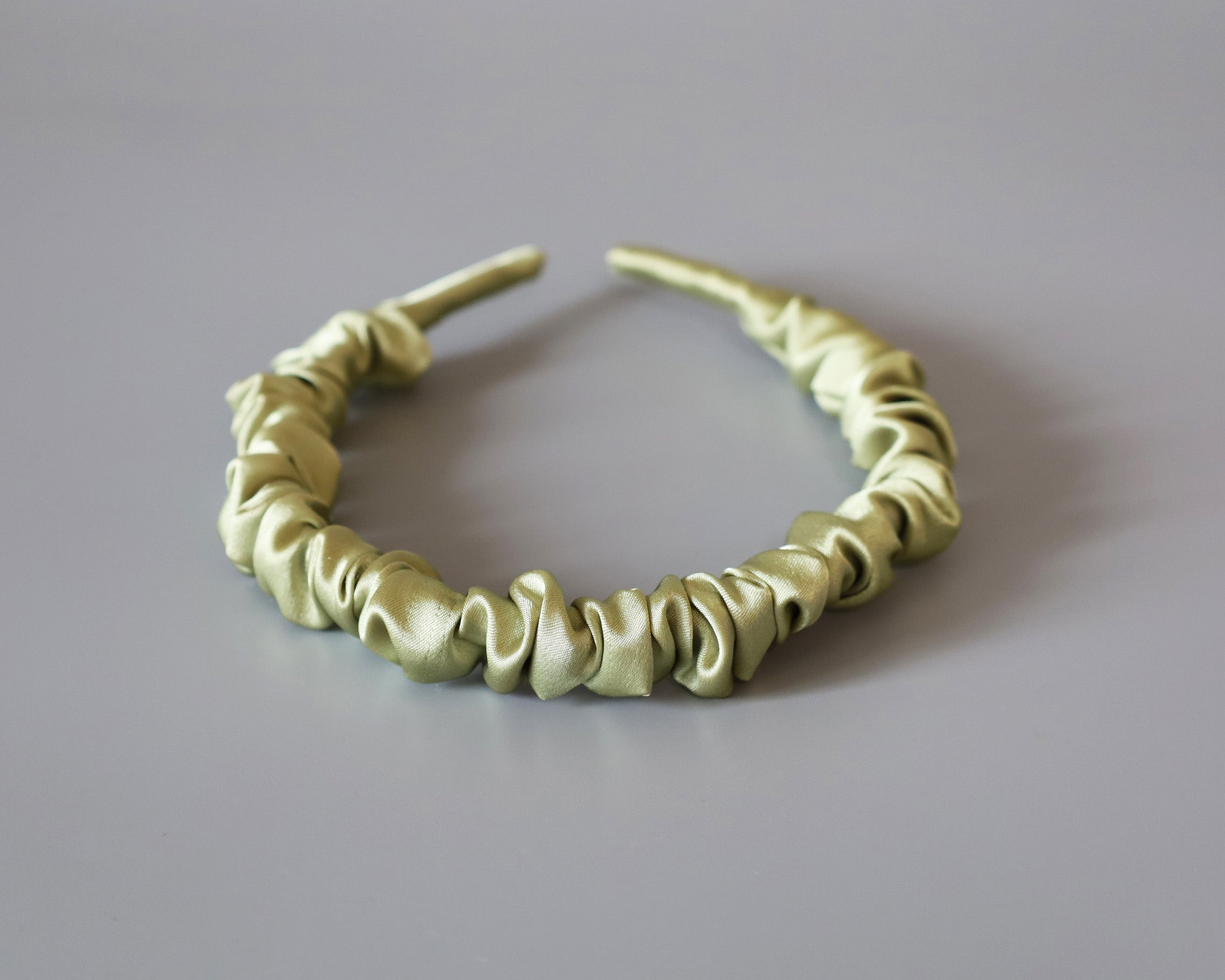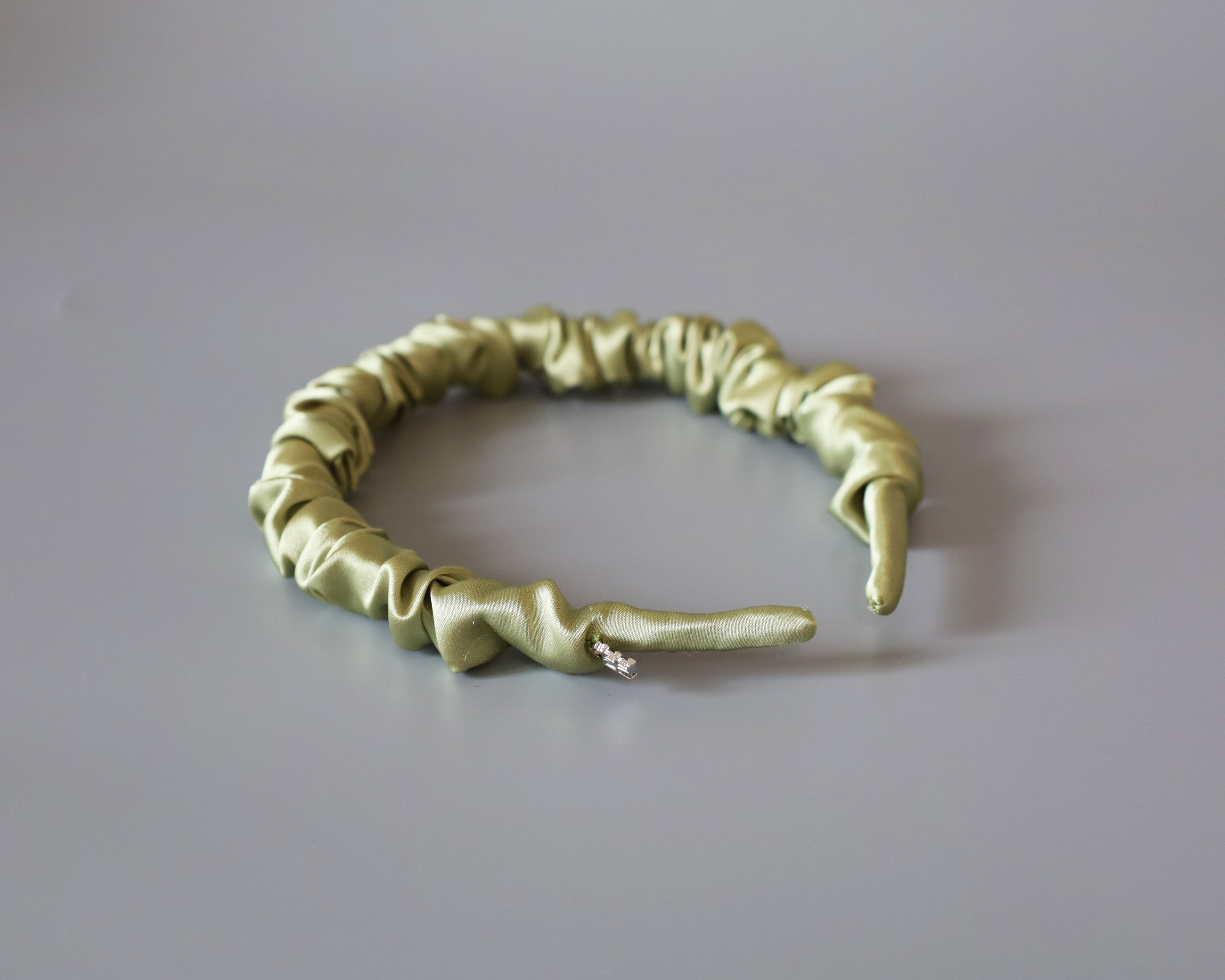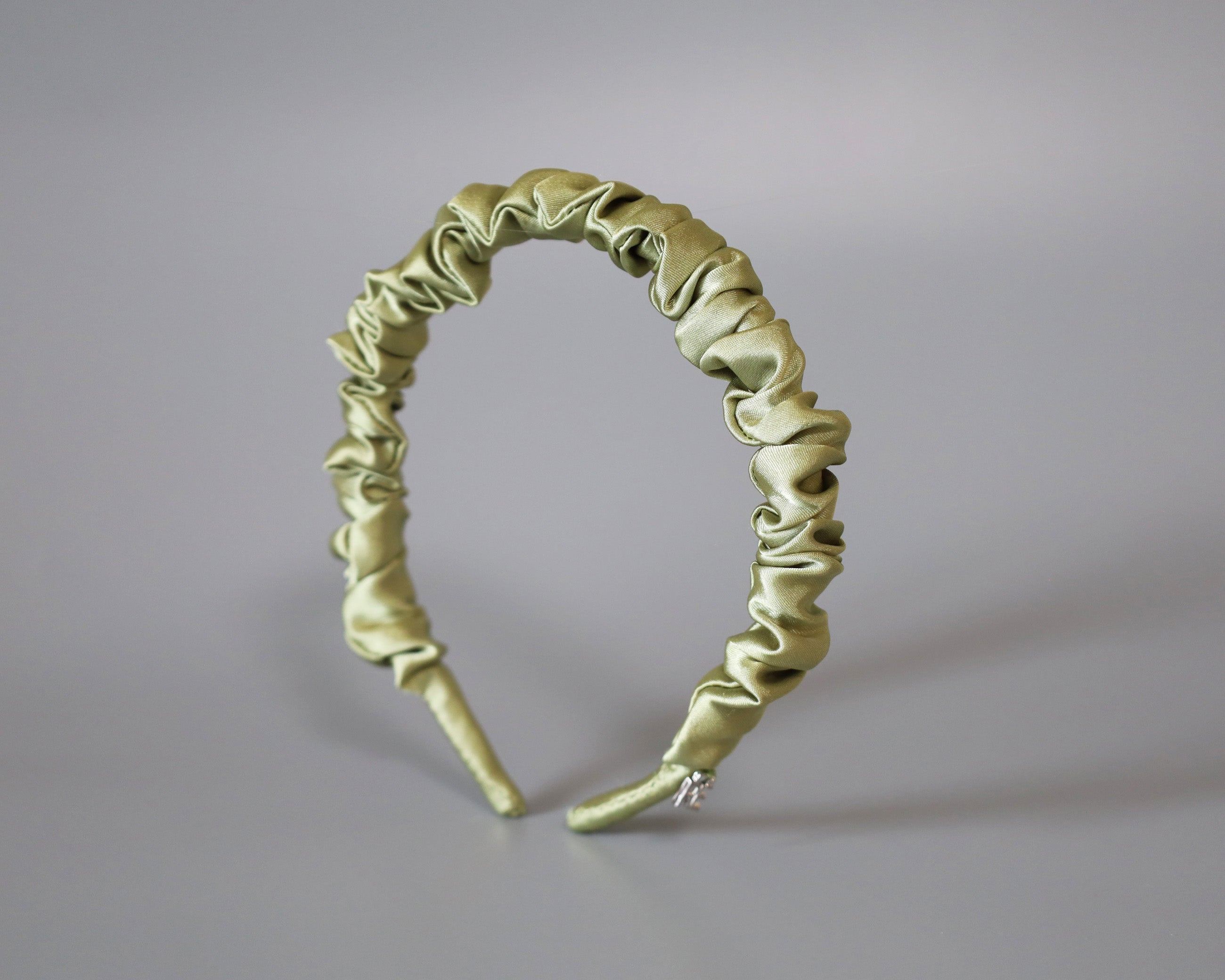 オリーブゴールドの軽やかな色に目を奪われるエアリーなギャザーカチューシャ。