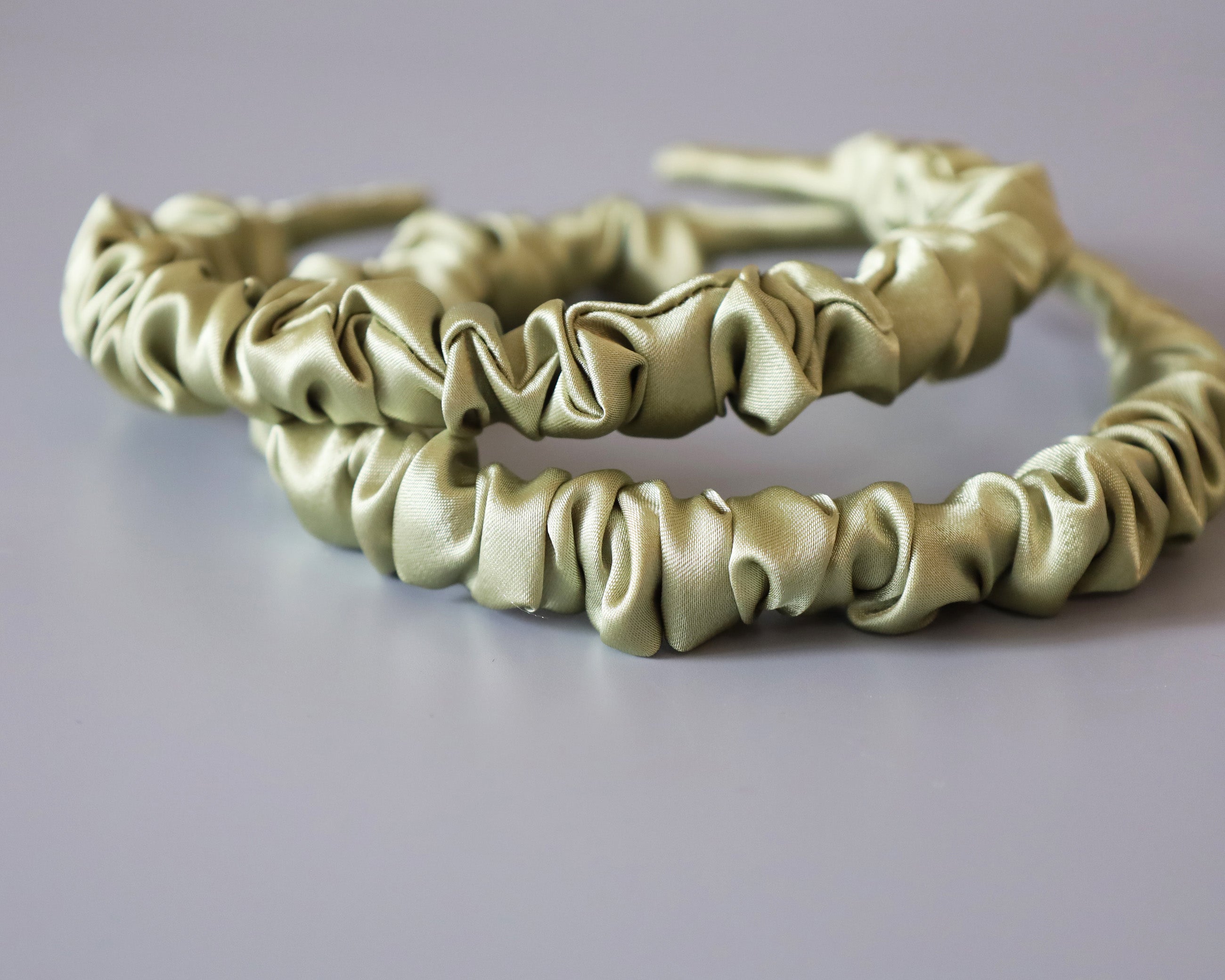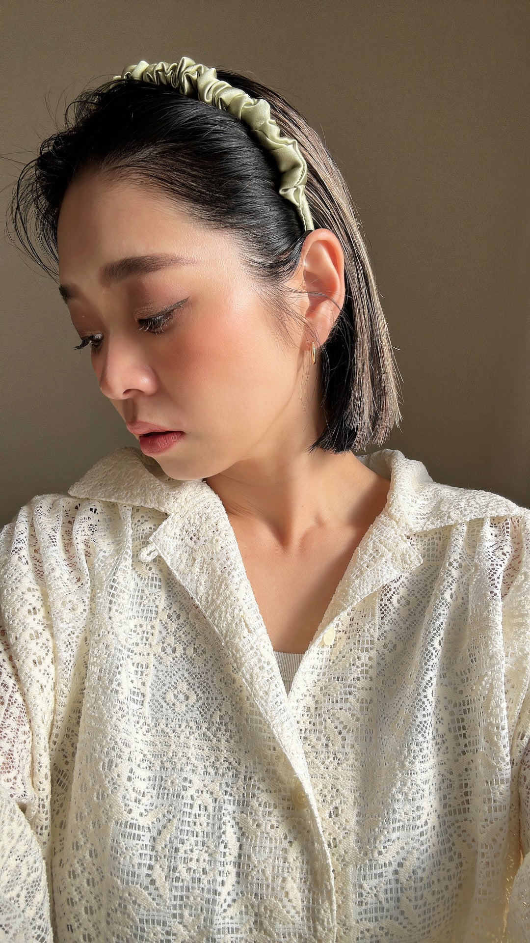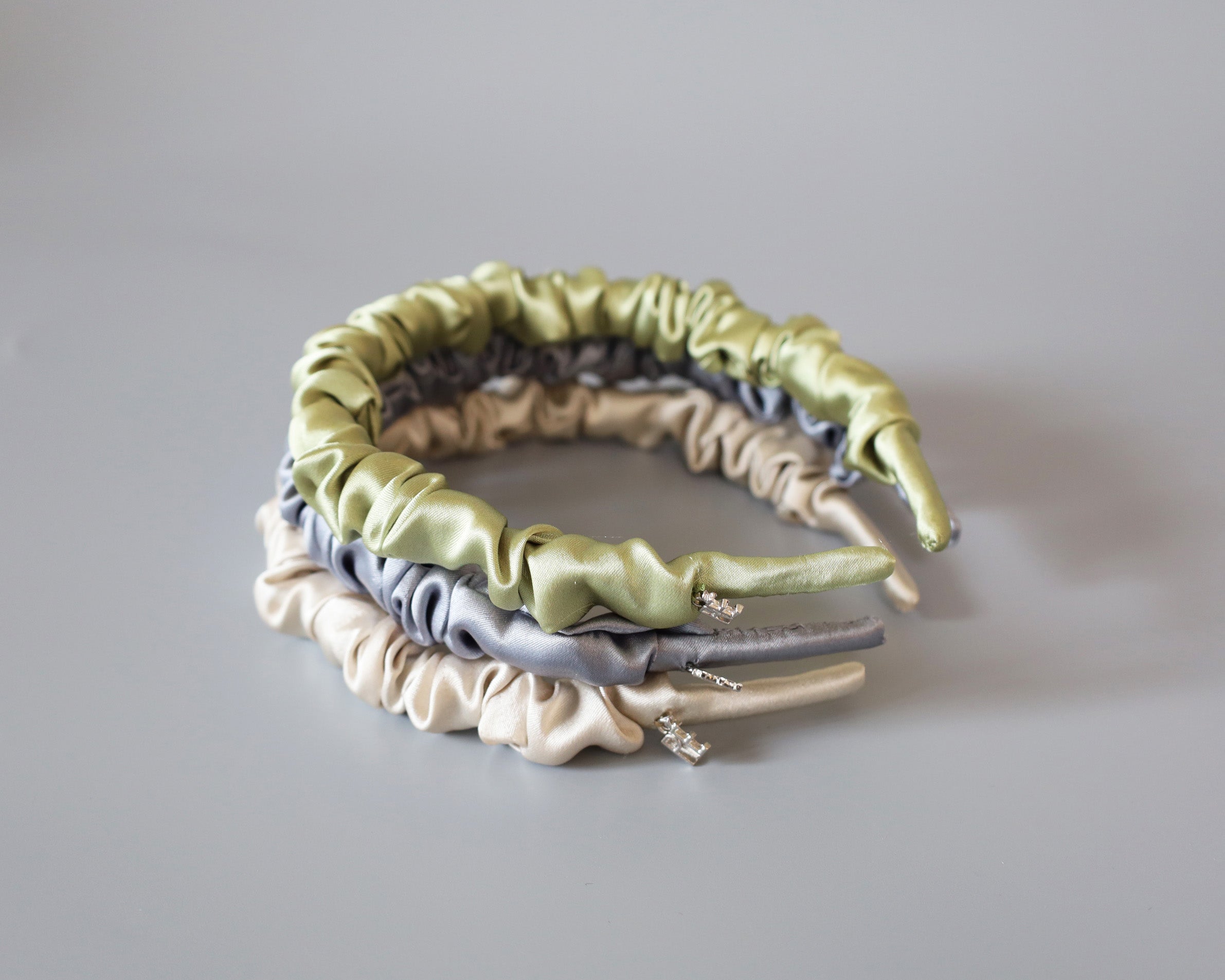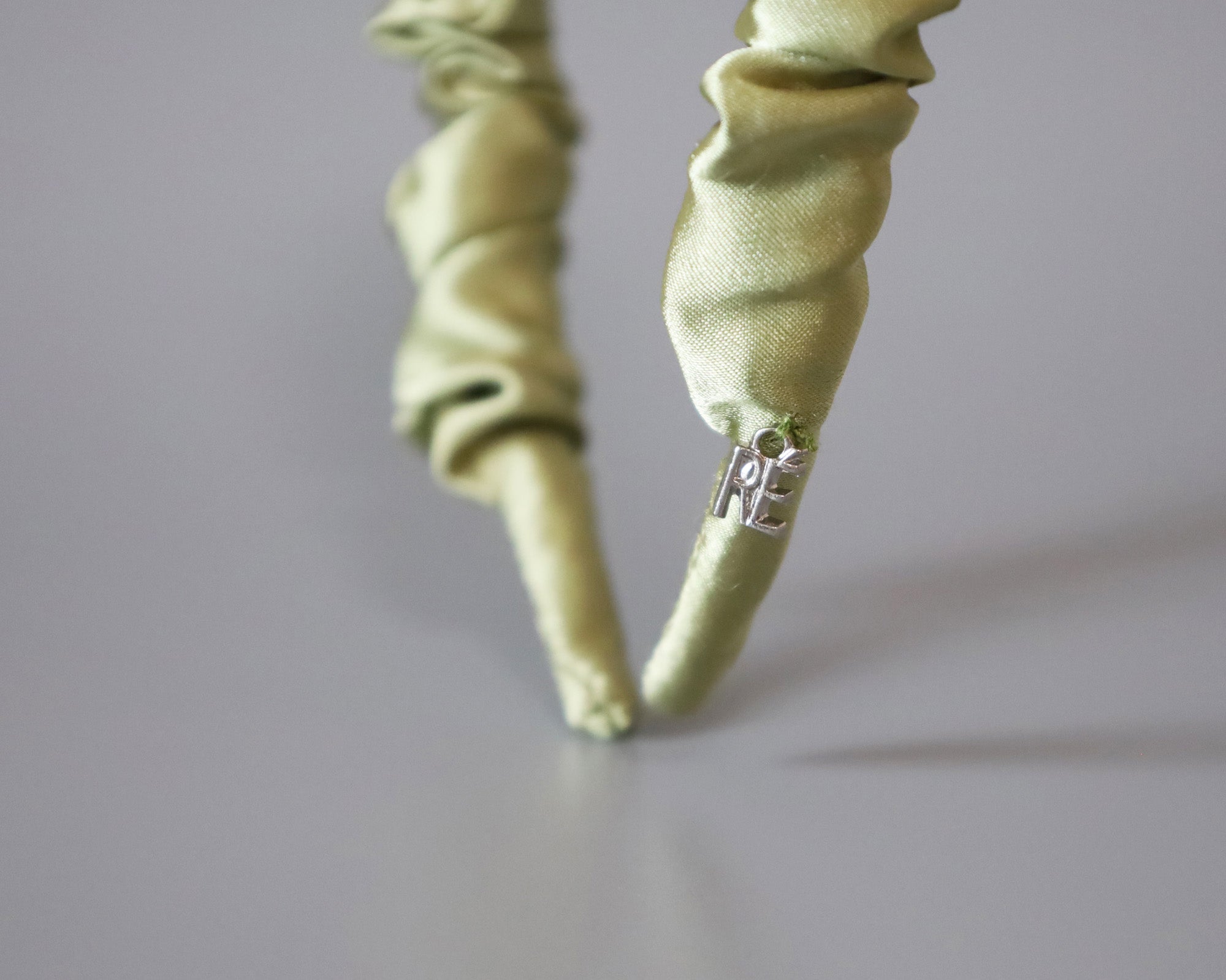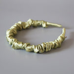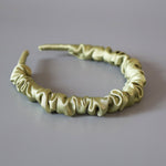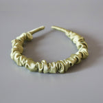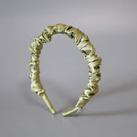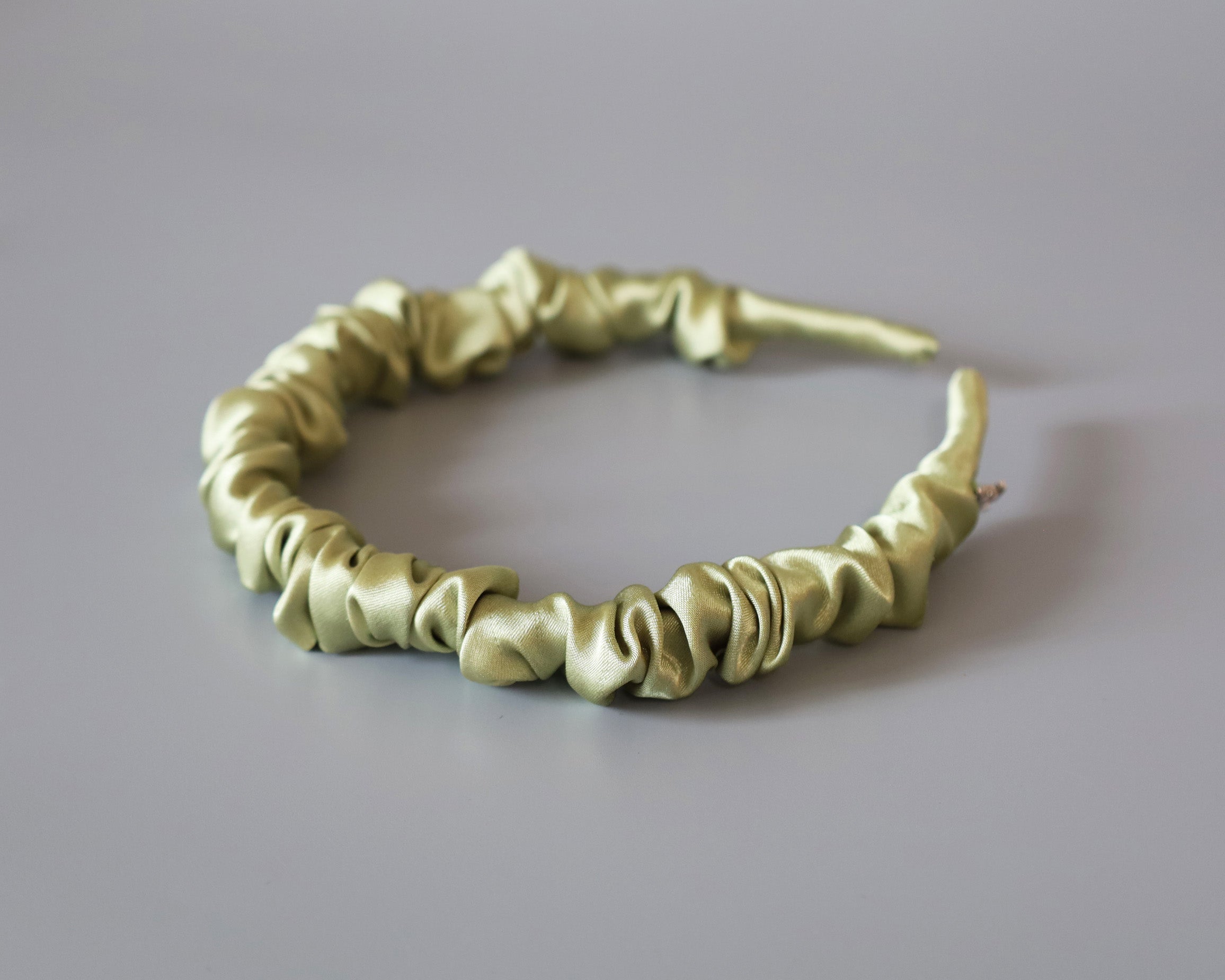 オリーブゴールドの軽やかな色に目を奪われるエアリーなギャザーカチューシャ。