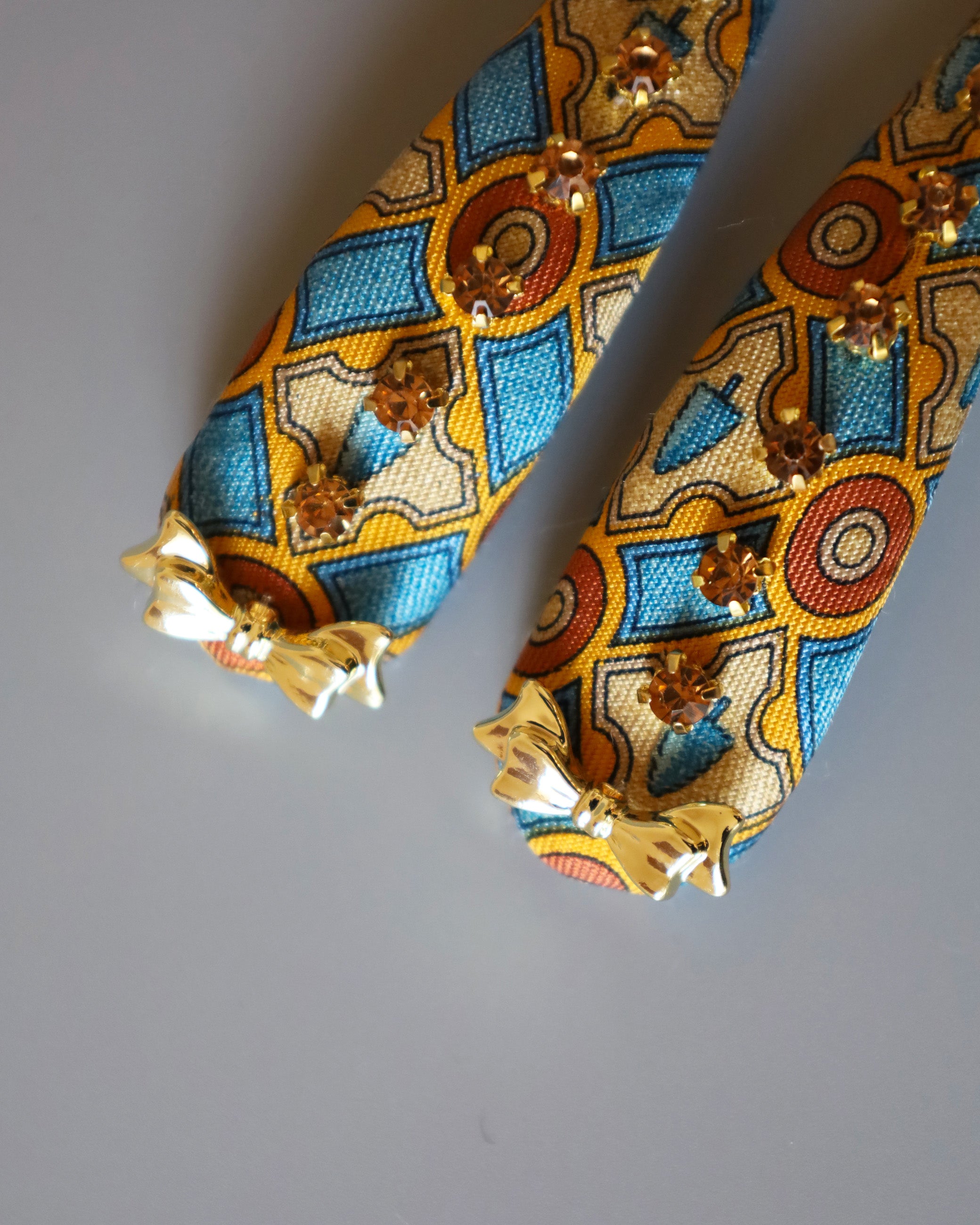 カラフルなボディの上にはオレンジブラウンのビジューのきらめきの他に、ゴールドのリボンパーツも配置。