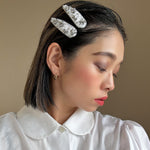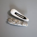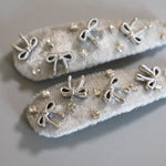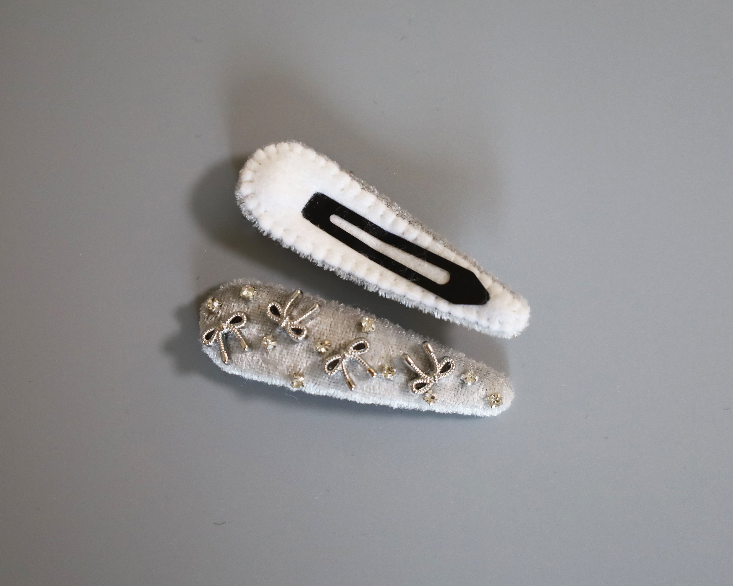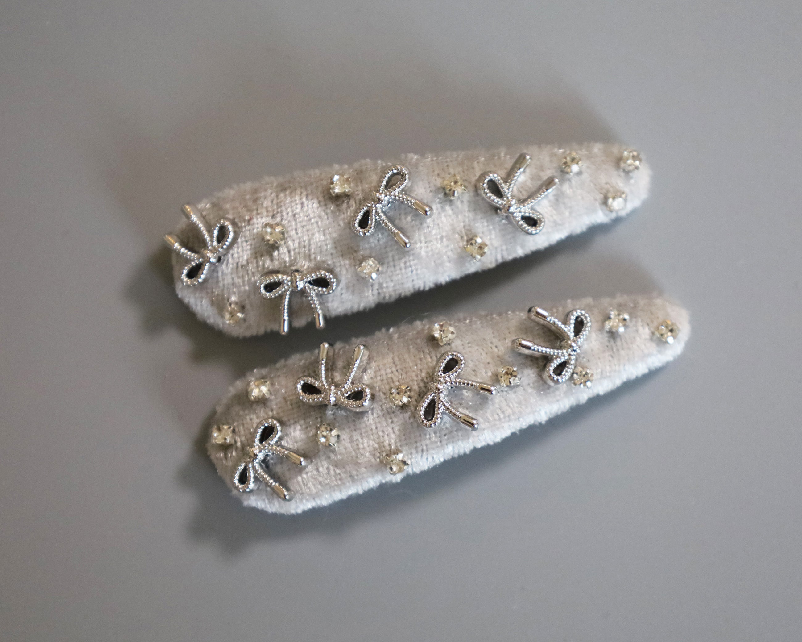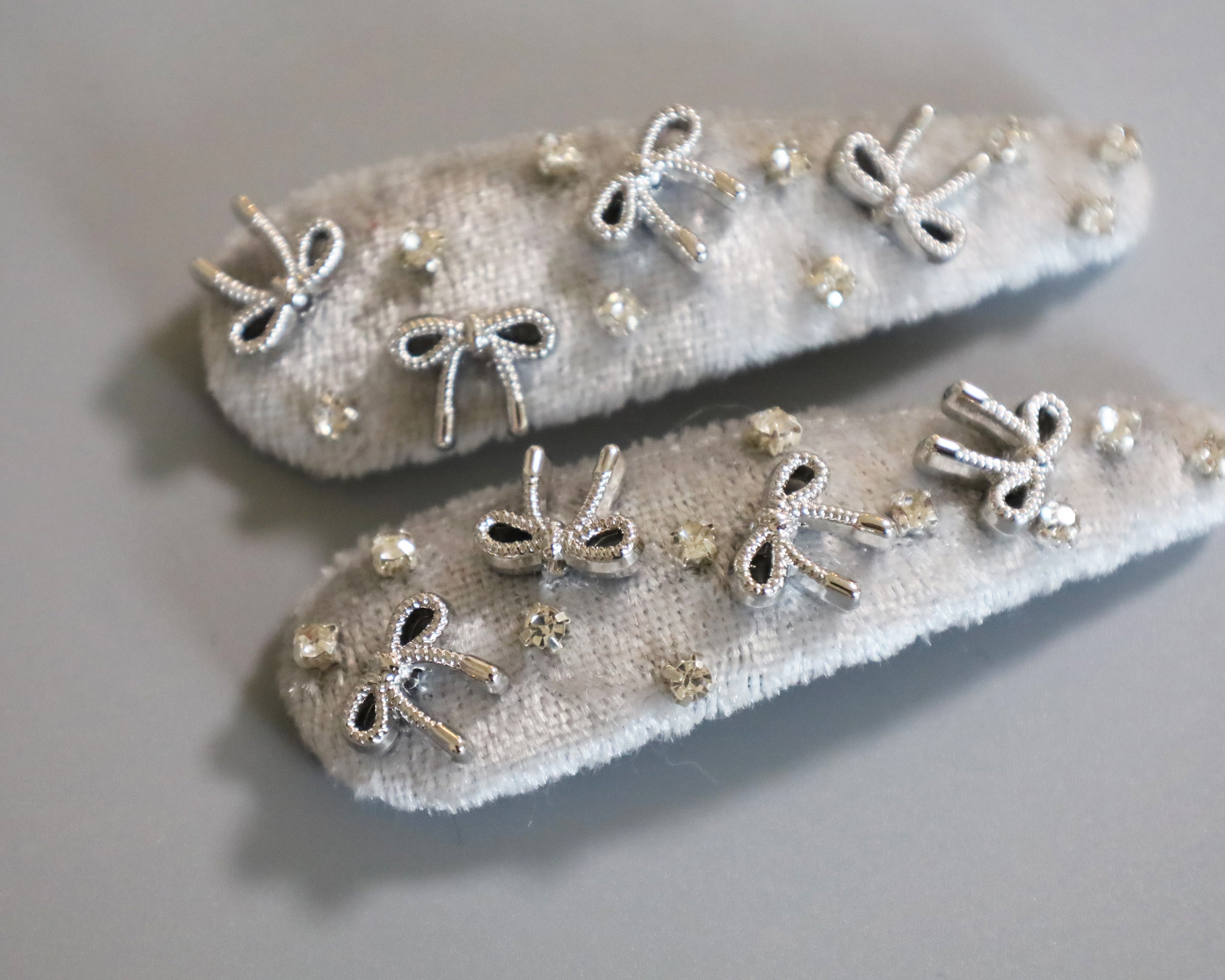 シルバーのベロアにリボンパーツを散りばめた大人かわいいヘアピン。
