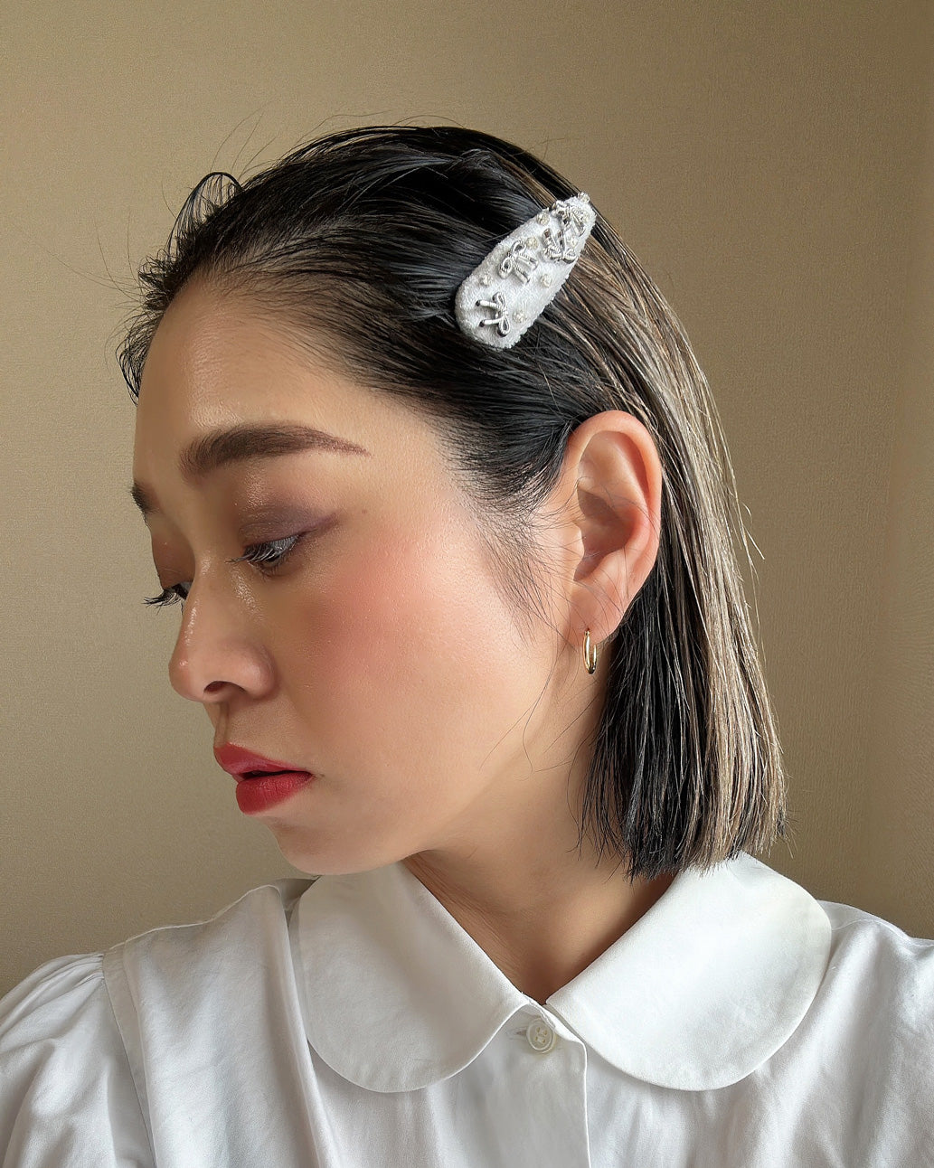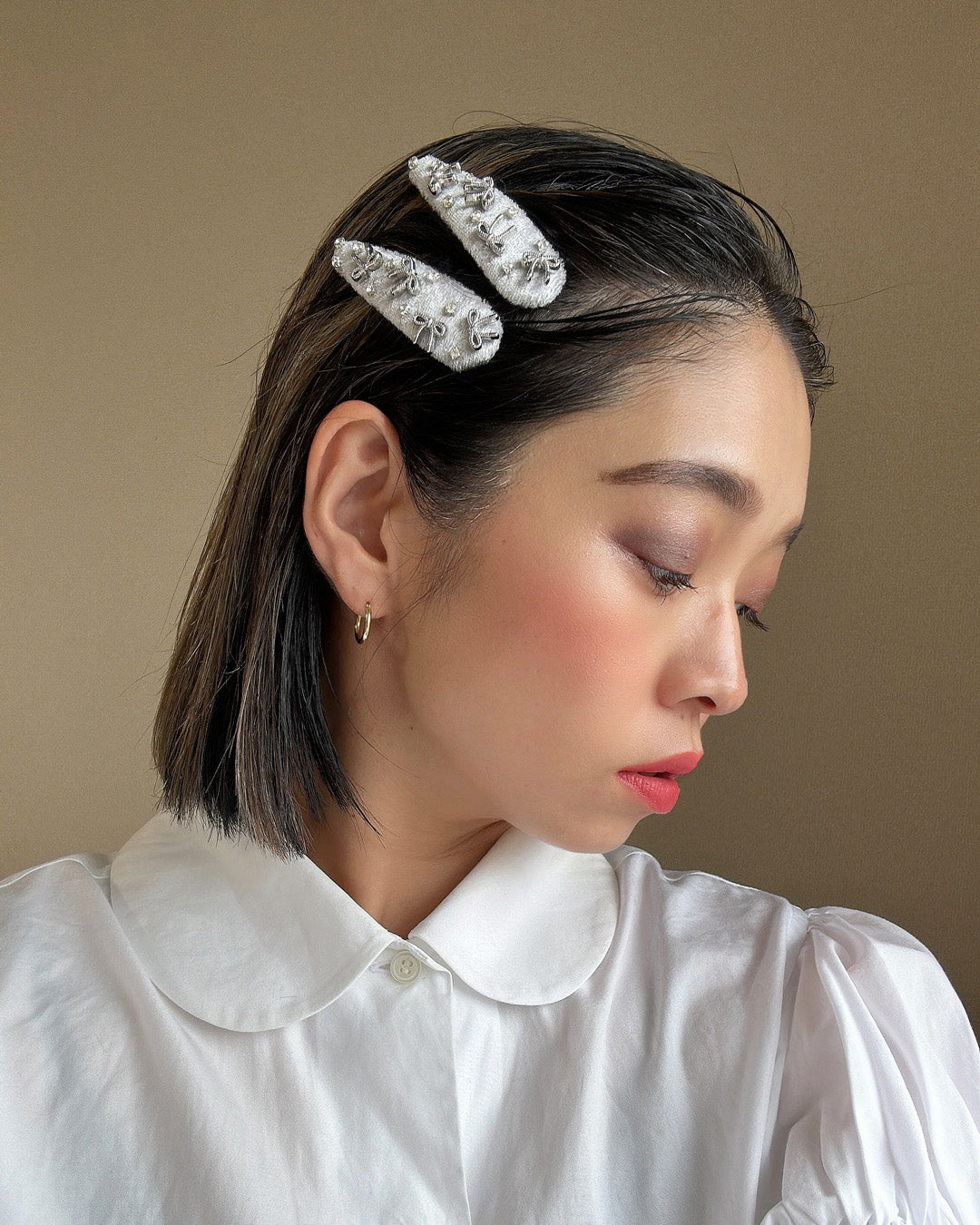左右に1つずつ、片側に2つつけるアレンジは不器用さんでも簡単にできる顔まわりアレンジ。
