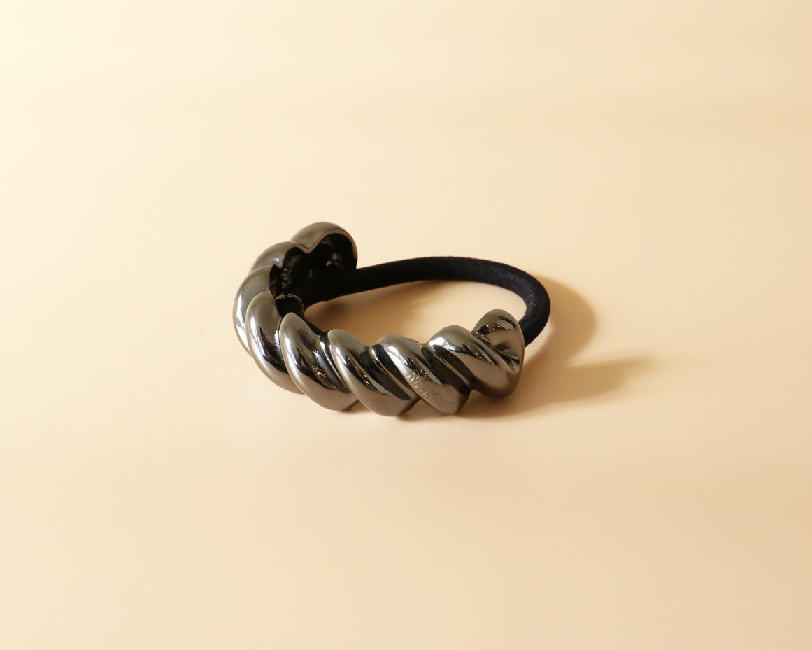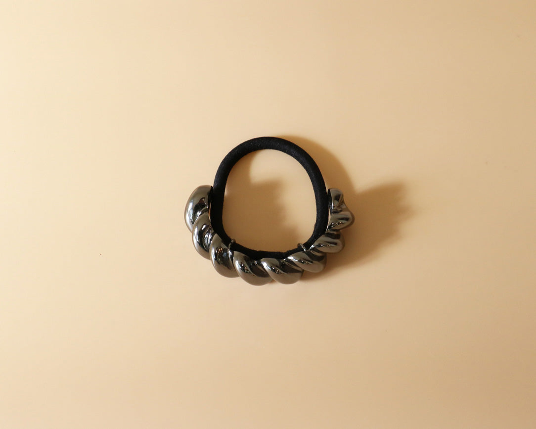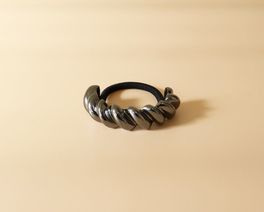ねじり上げたような立体感とブラックメタルの重厚感がトレンド感たっぷりのヘアゴムです。