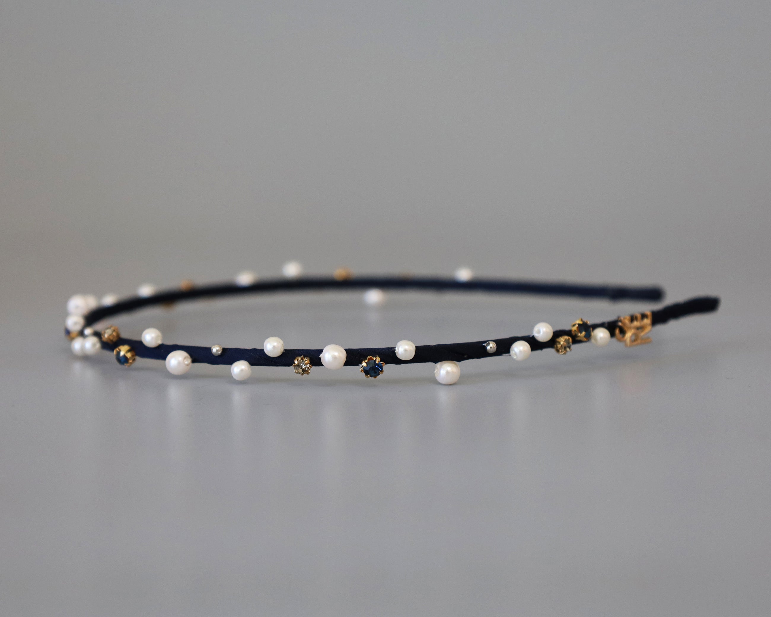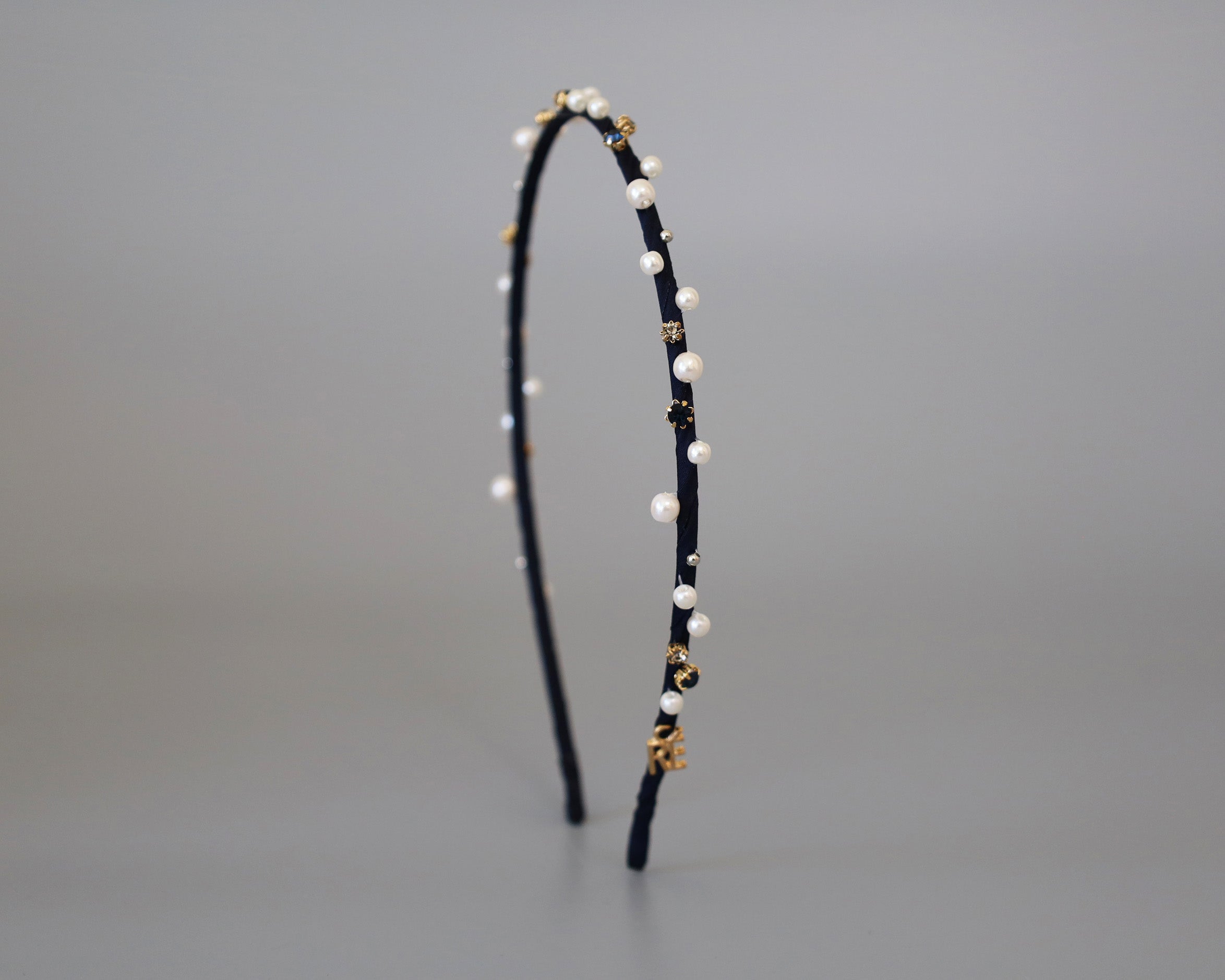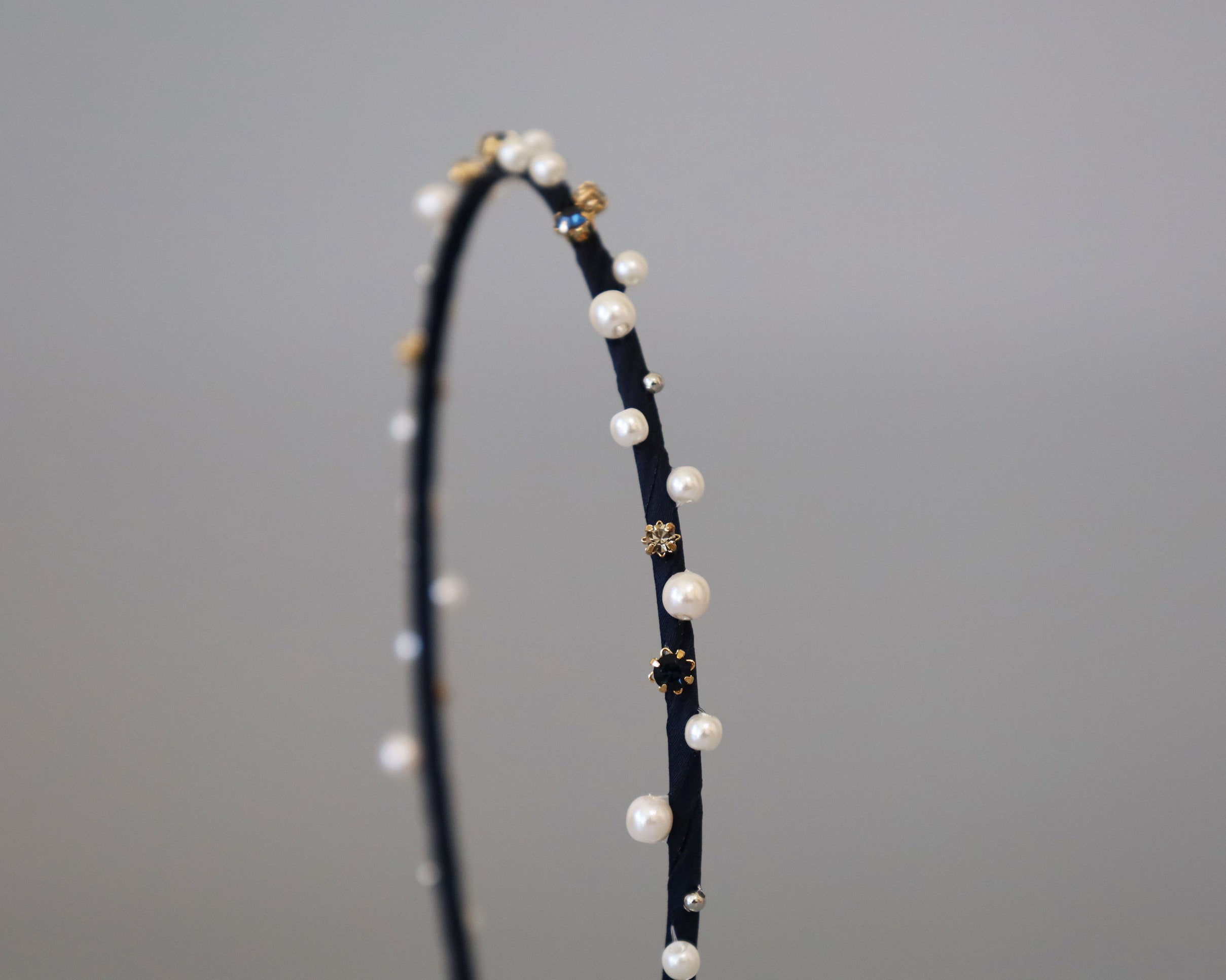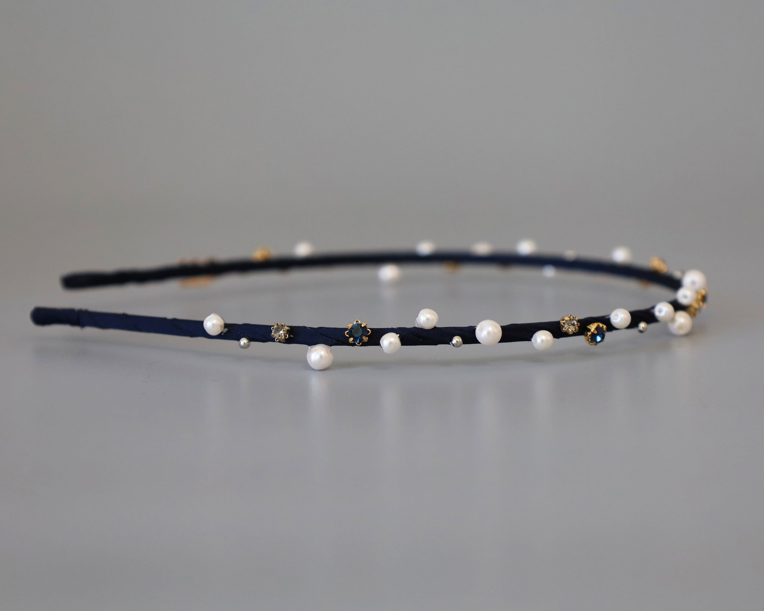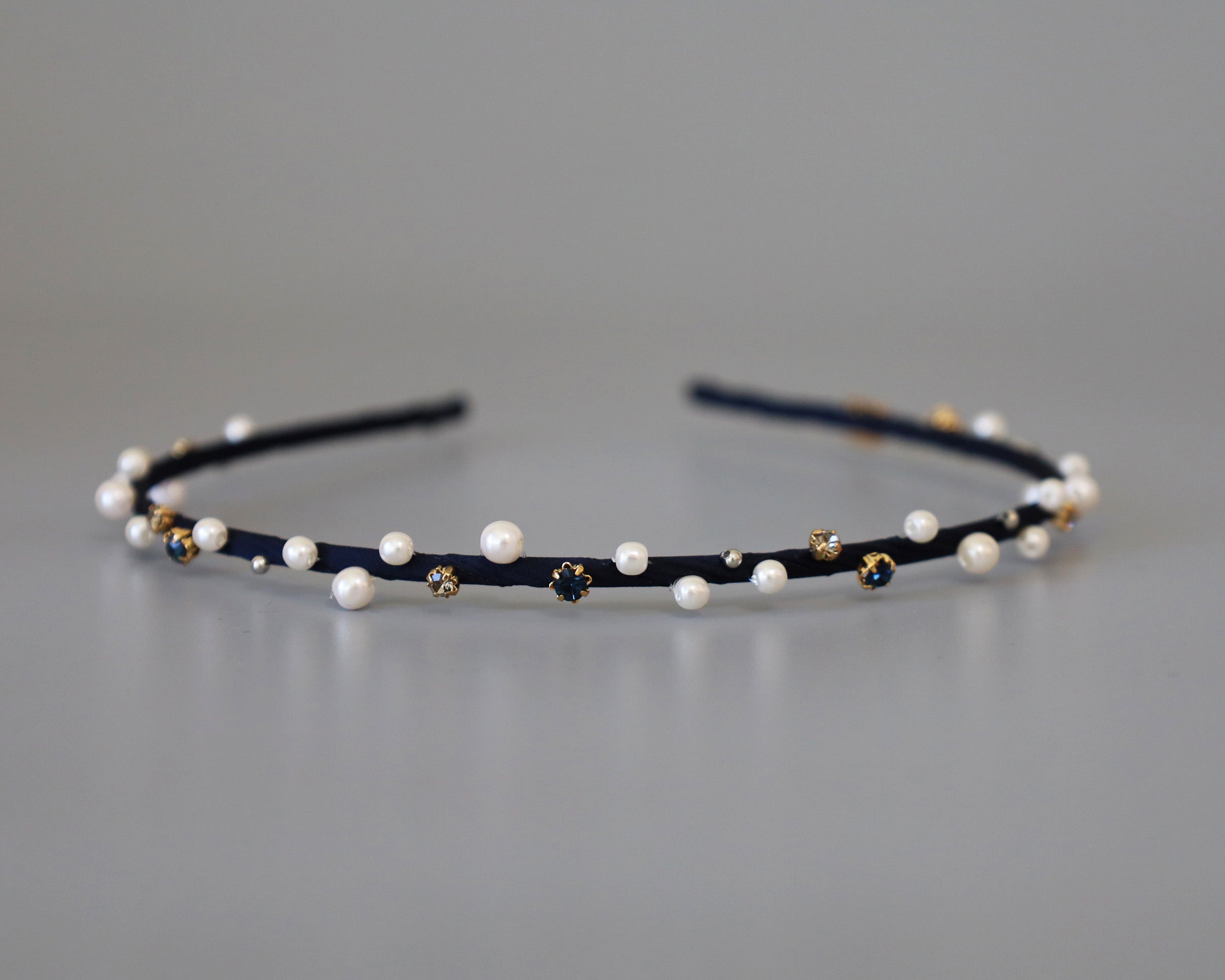 細身のネイビーカラーのカチューシャにパールとビジューをバランスよく配置。