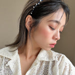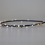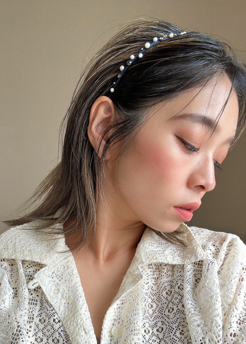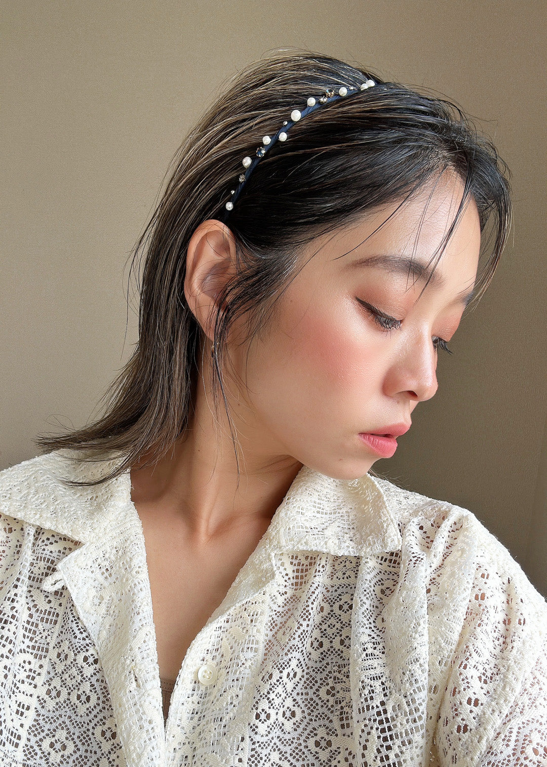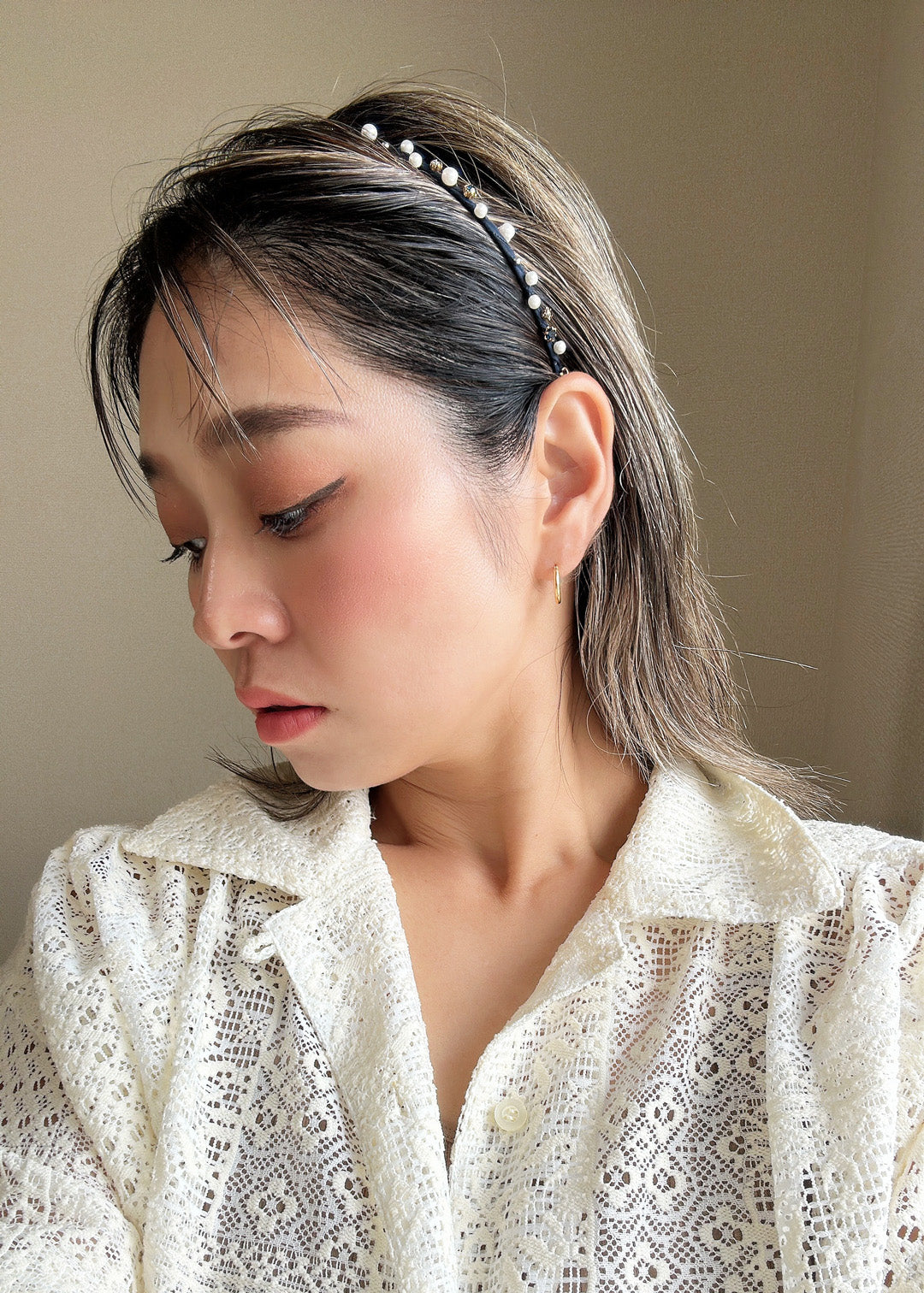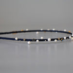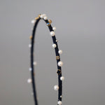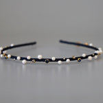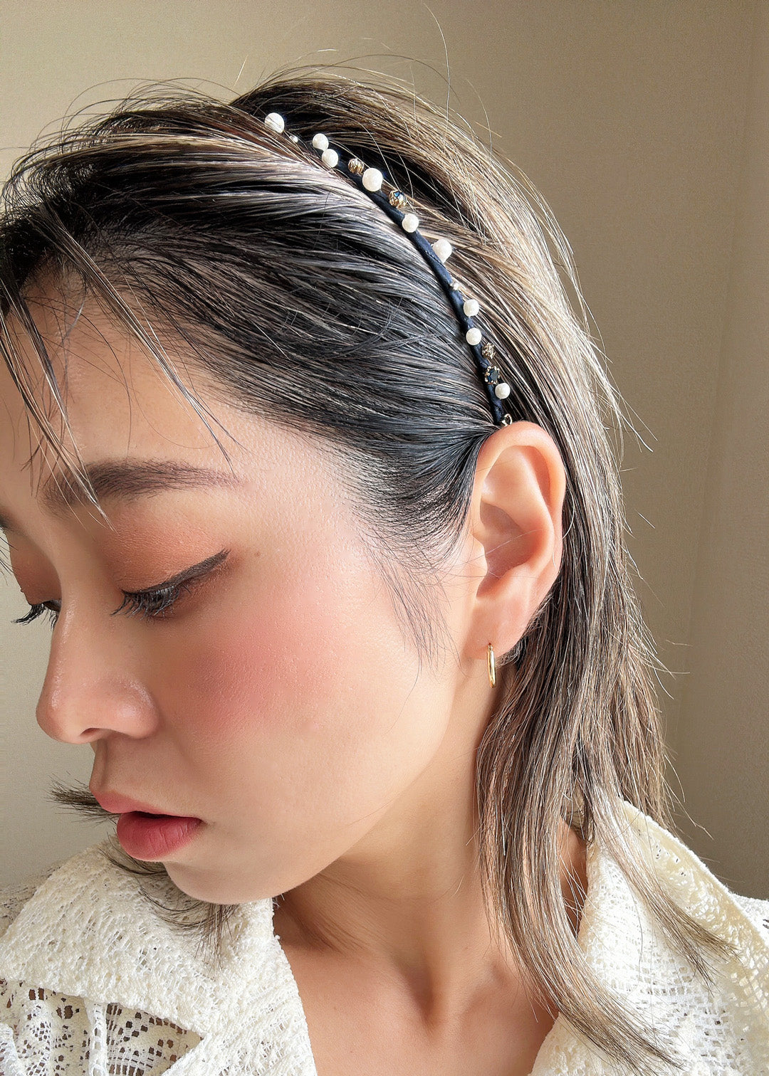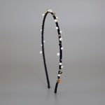 細身のネイビーカラーのカチューシャにパールとビジューをバランスよく配置。