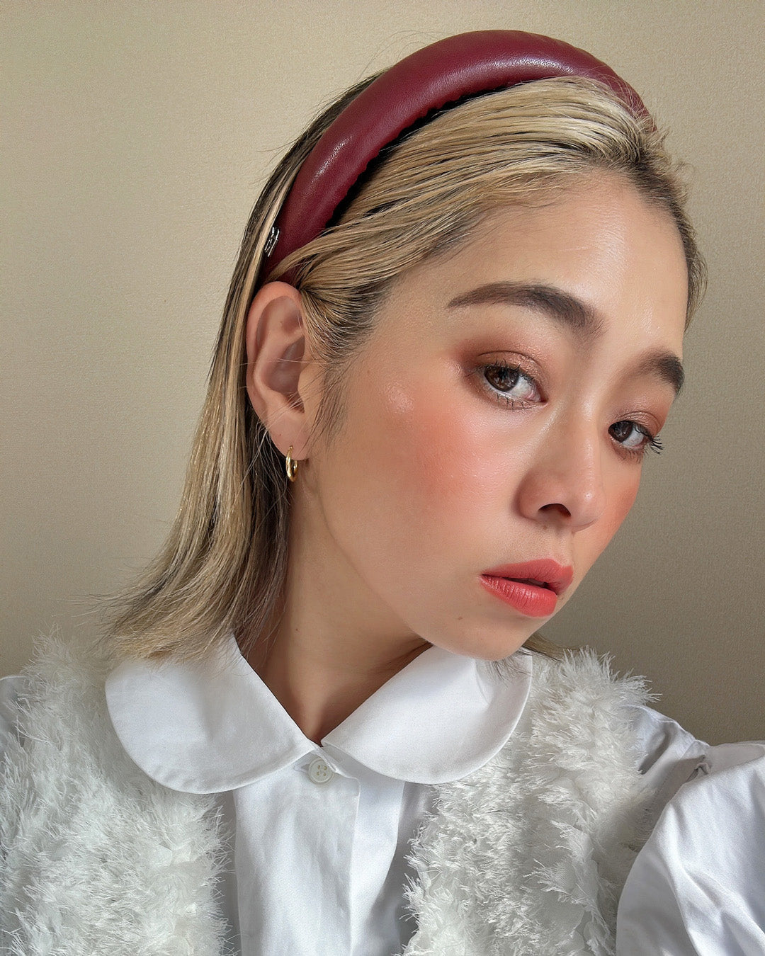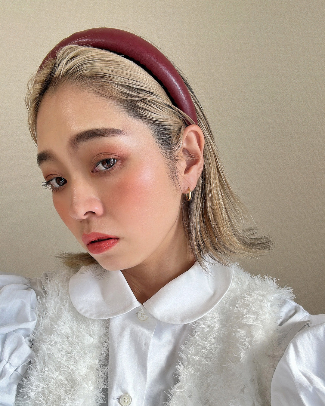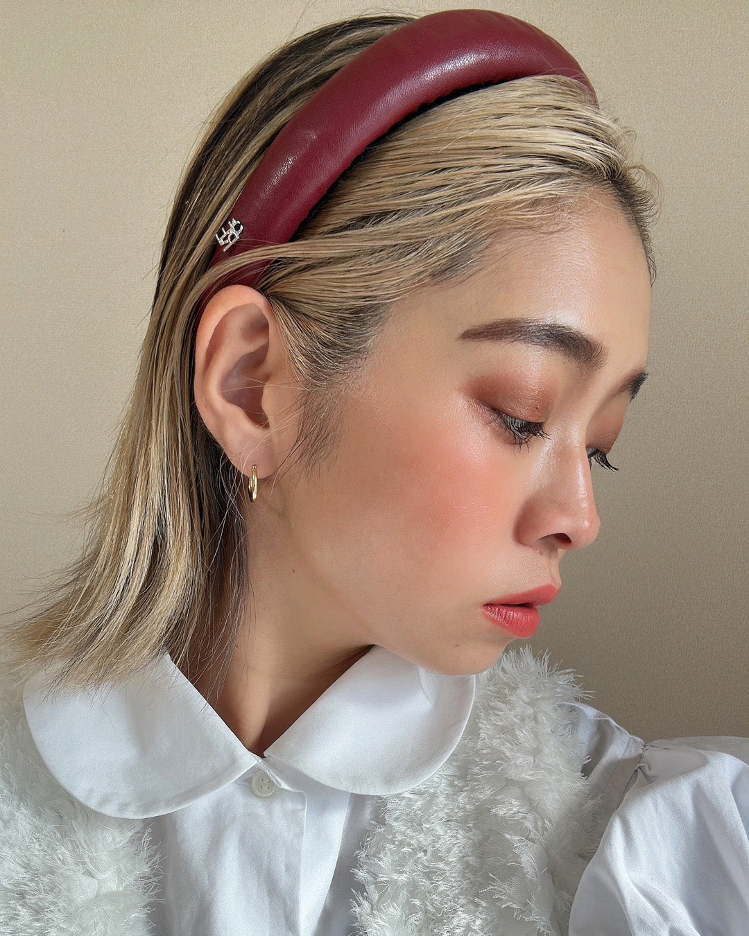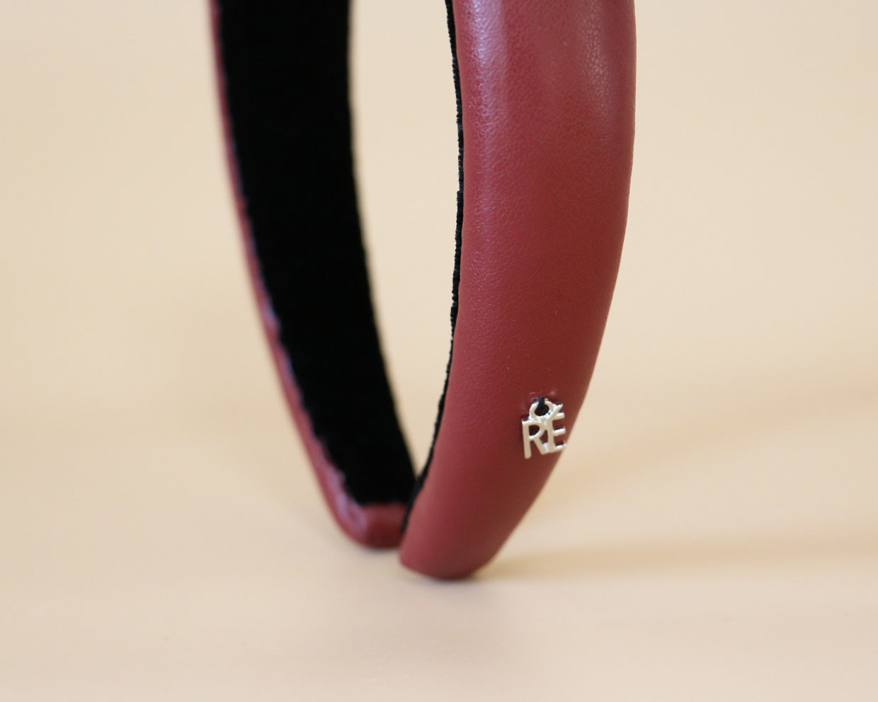 落ち着いたレッドカラーが特徴のフェイクレザーカチューシャです。