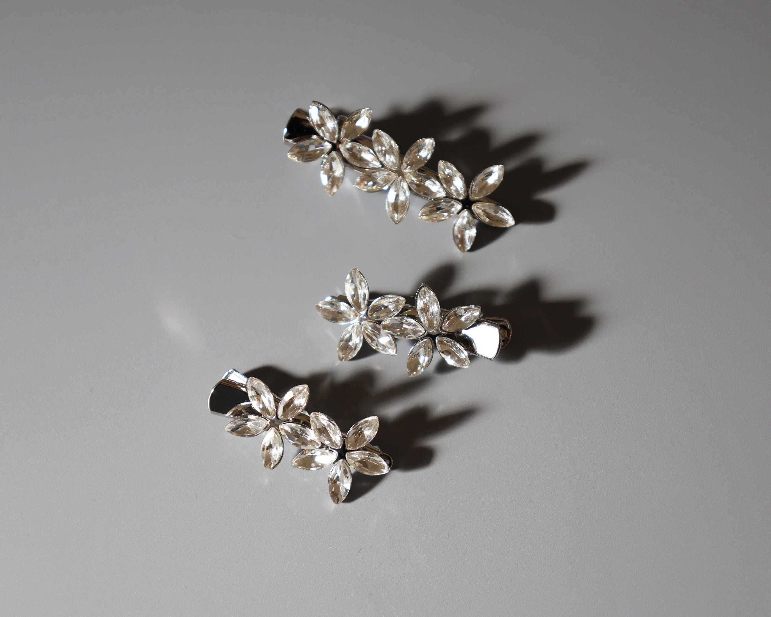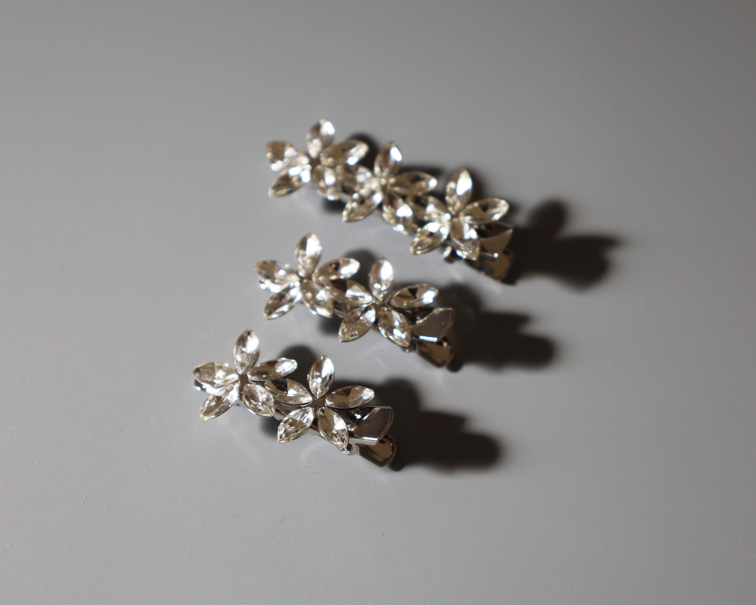 シルバーの土台をベースにフラワーモチーフがそれぞれ3つ、2つ、2つ付いている3つセットです。