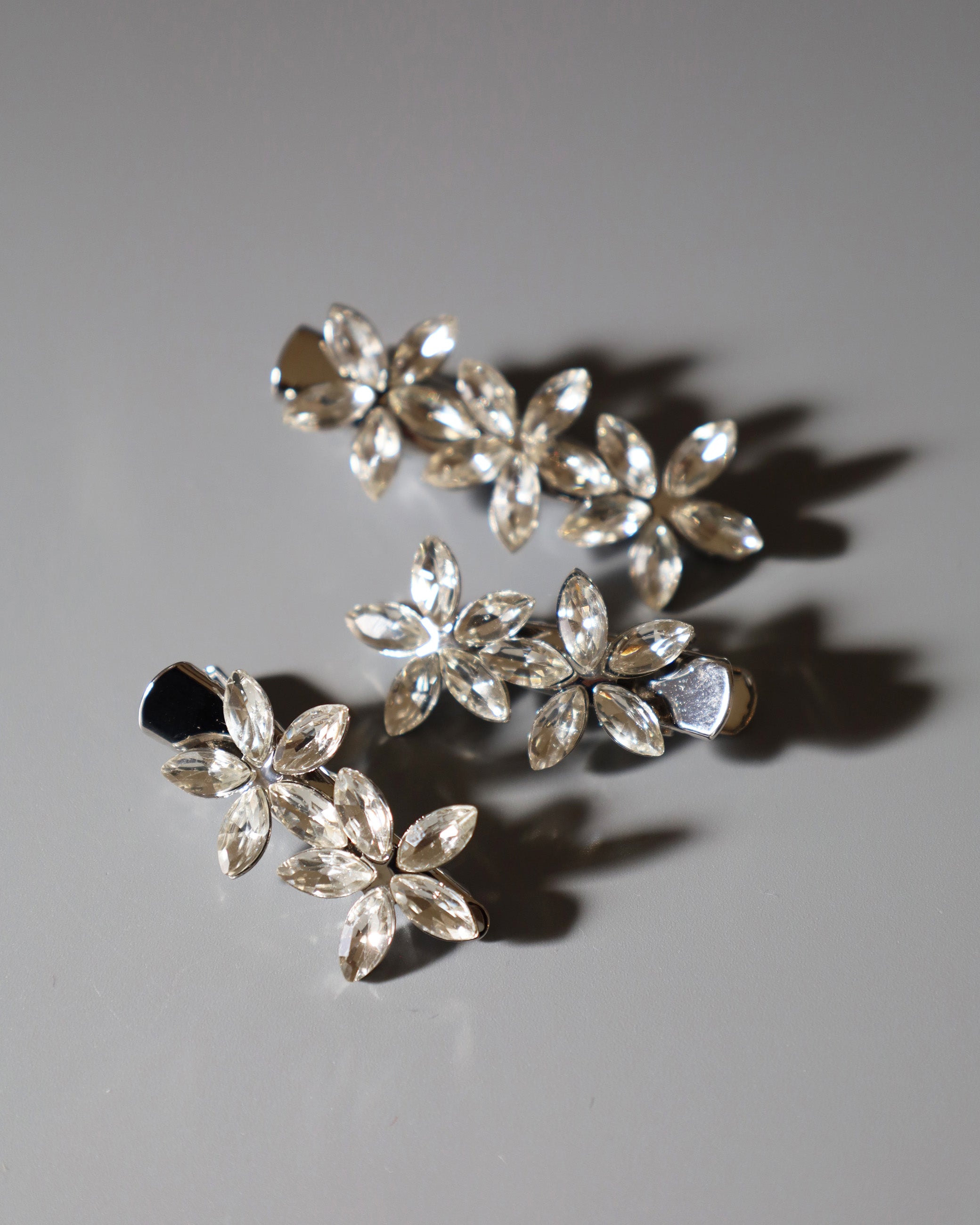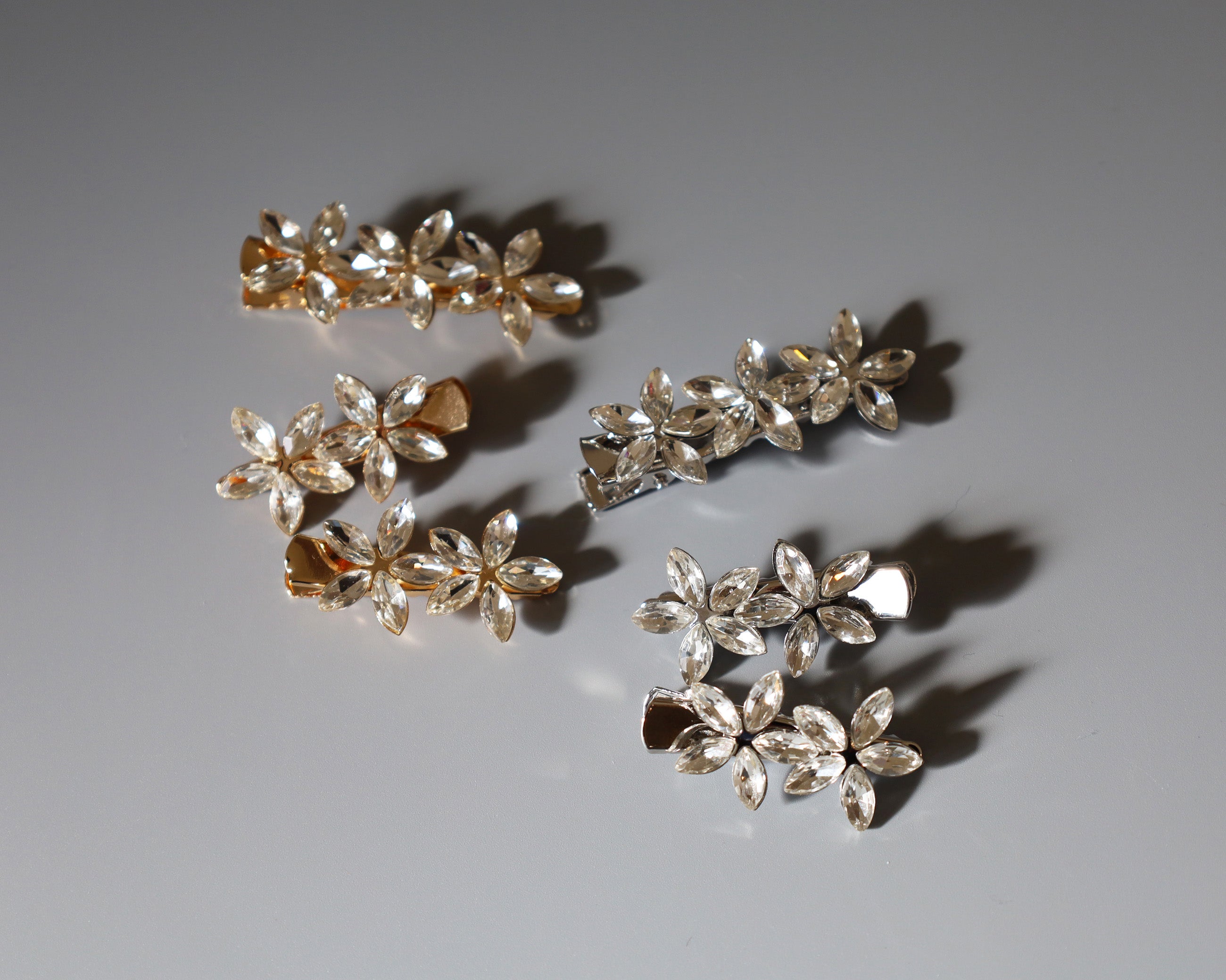 5枚の花びらがエレガントなフラワーモチーフのビジュー付きクリップ。