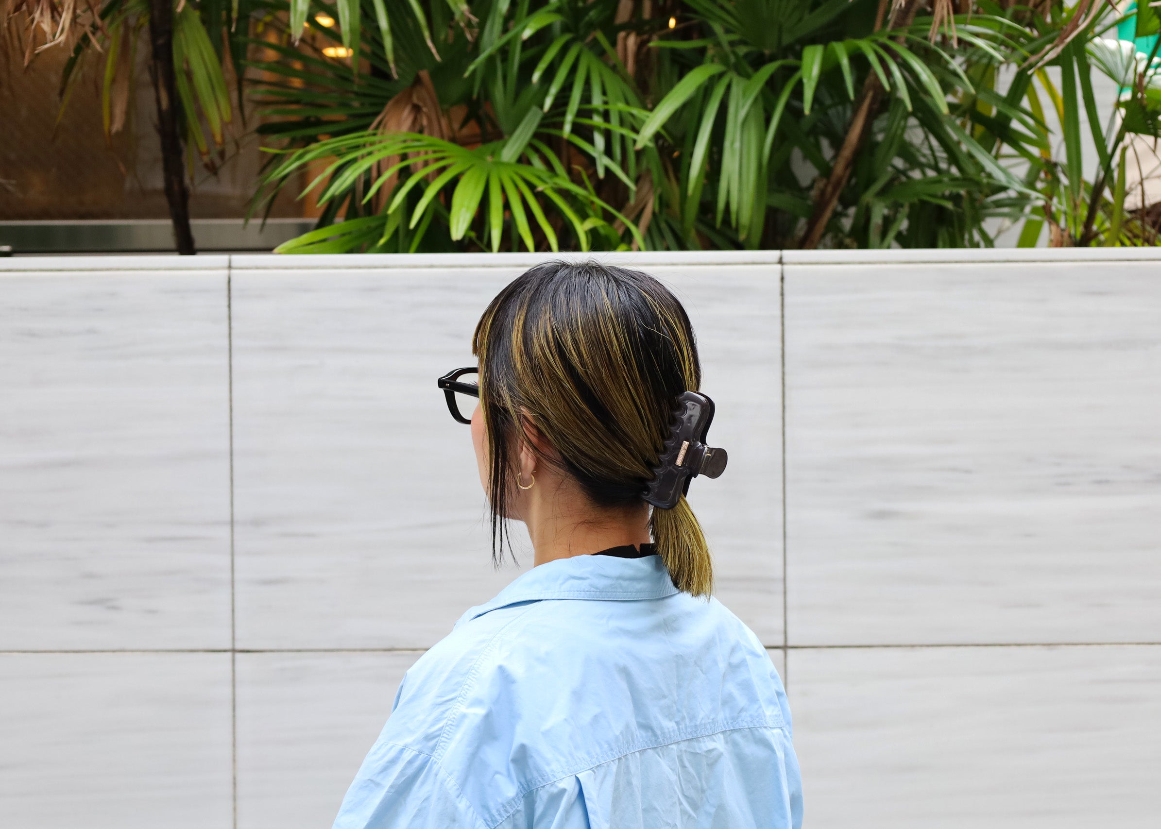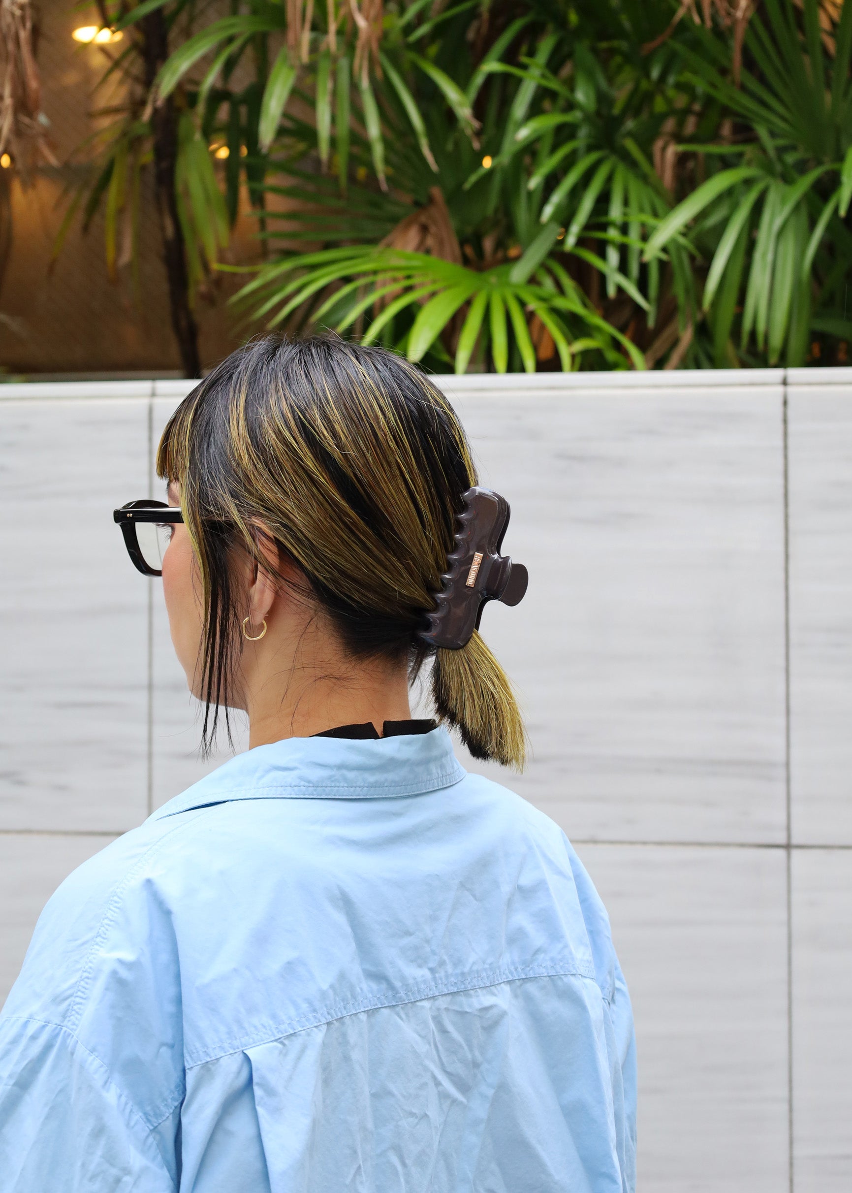 髪の毛全体をねじり上げてクリップでホールドするスタイルは簡単なのにきちんと見え。