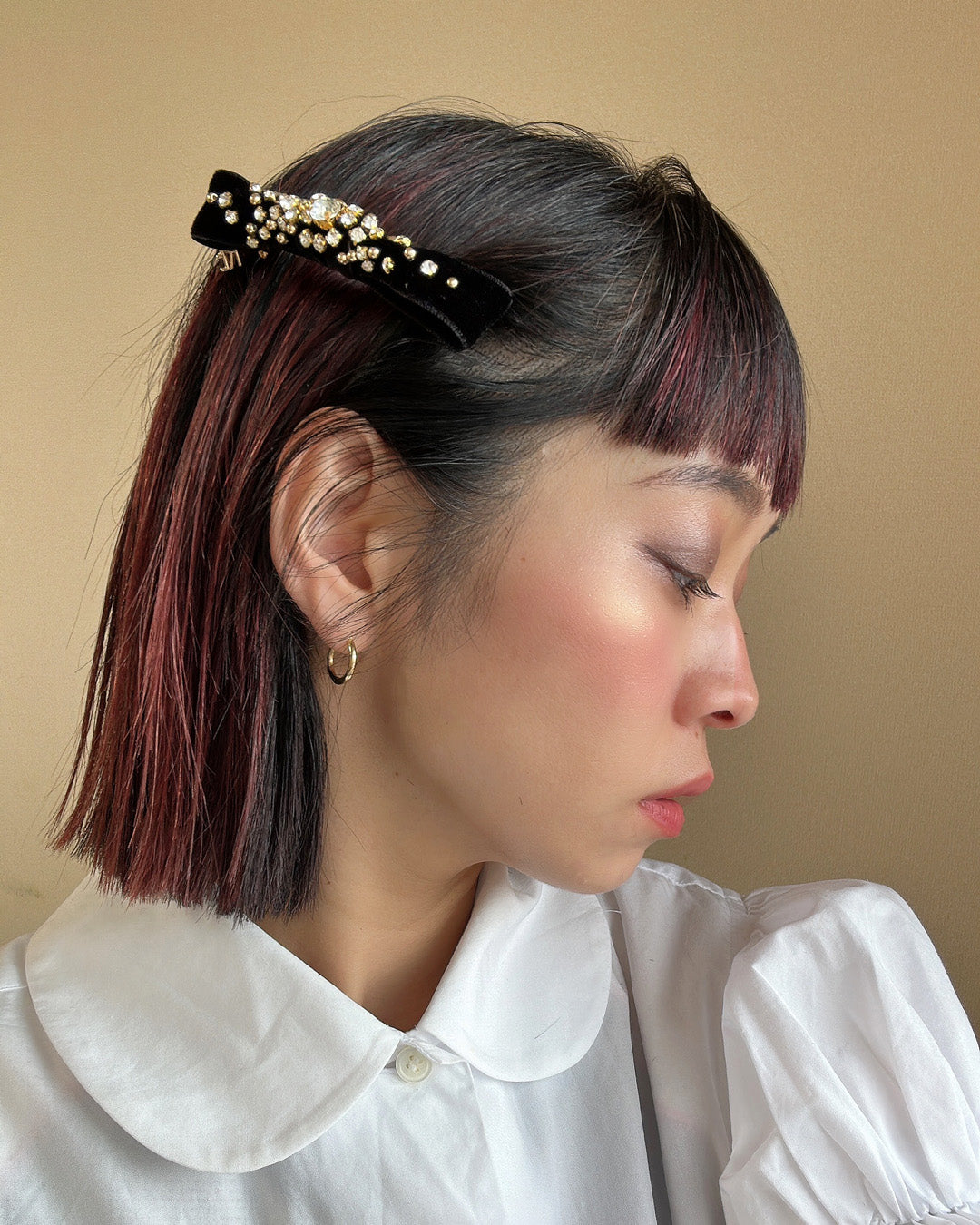 後頭部はタイトのままでももちろん素敵ですが、つまんで引き出してほぐしておくと横顔のシルエットがより美しく仕上がります。