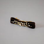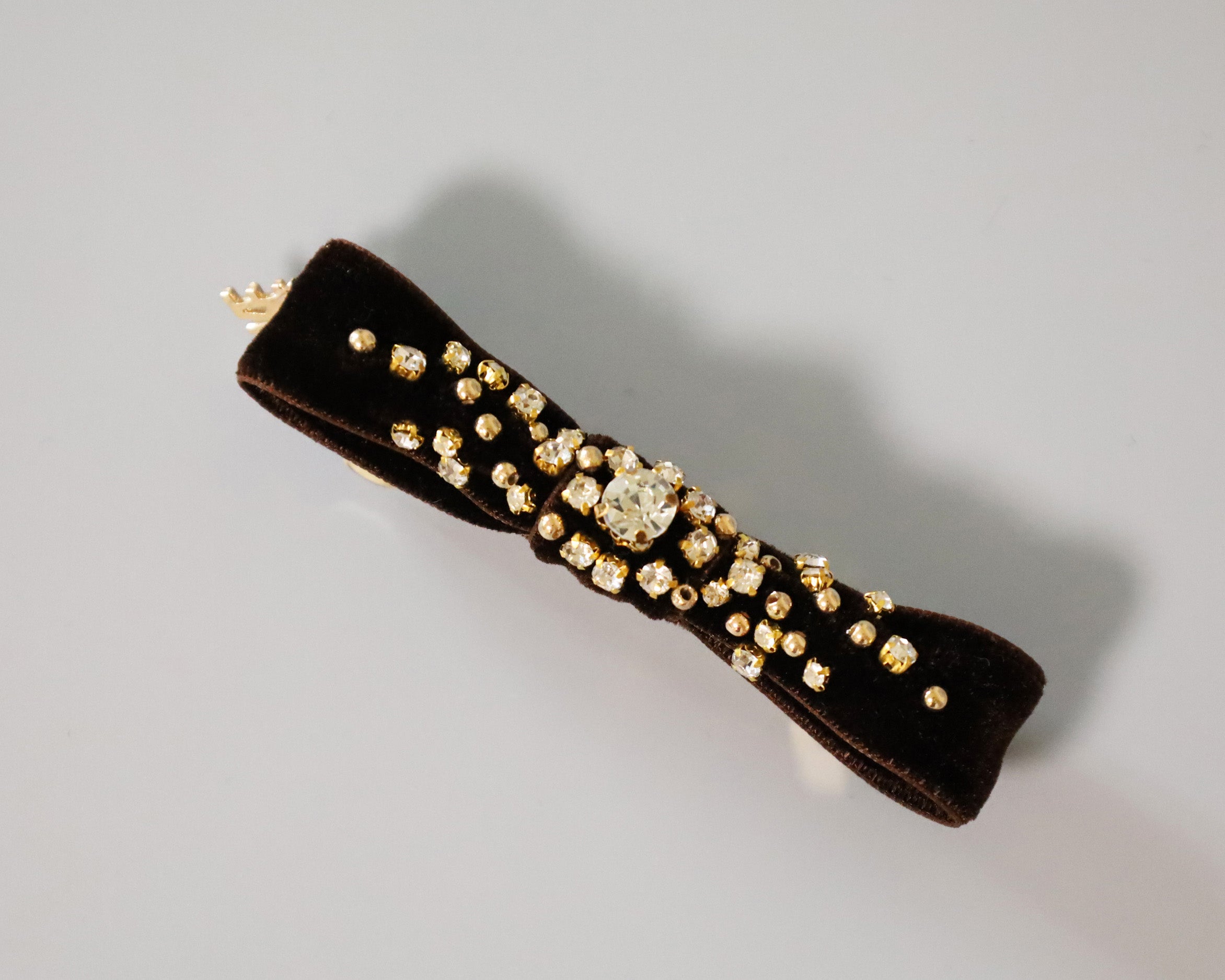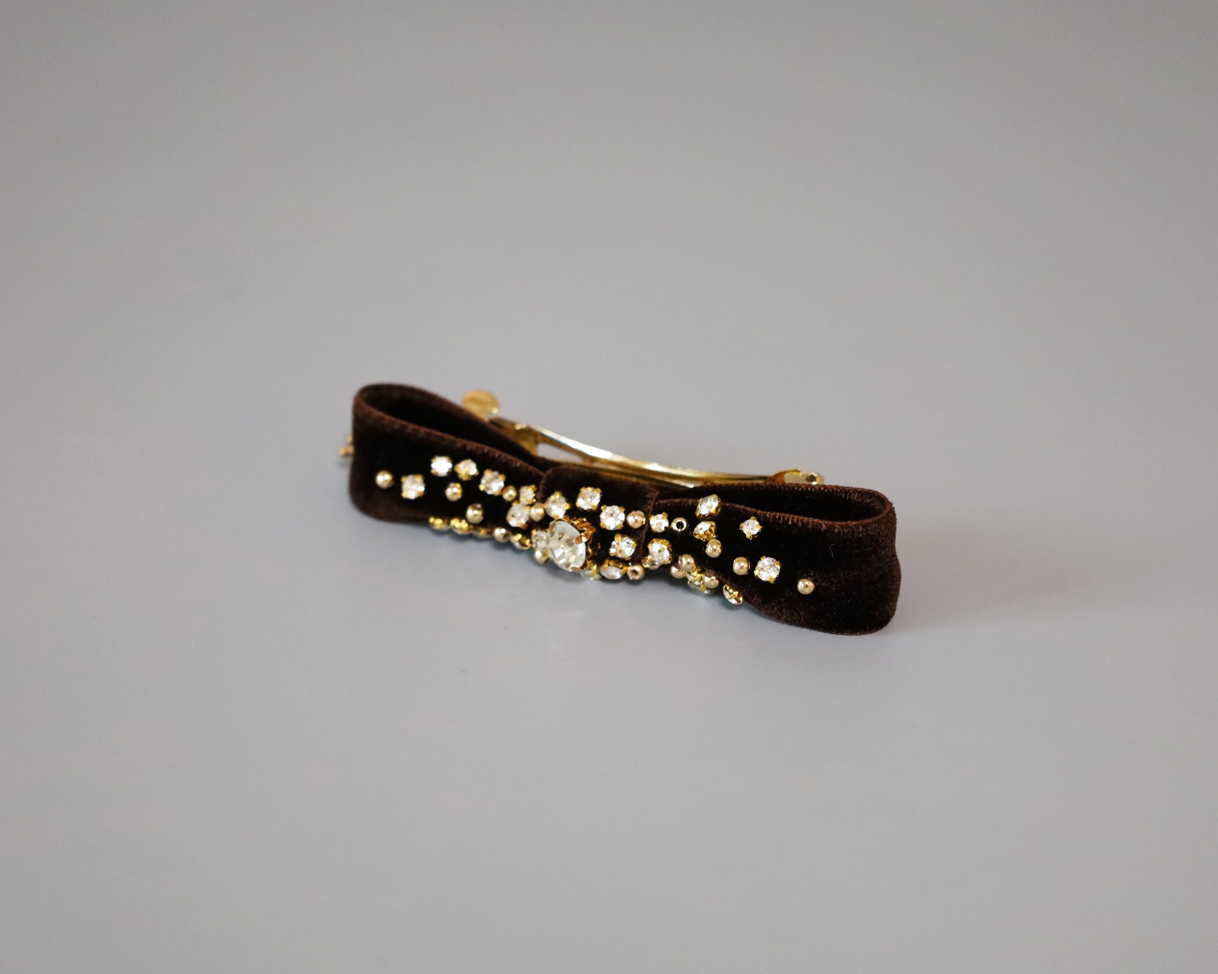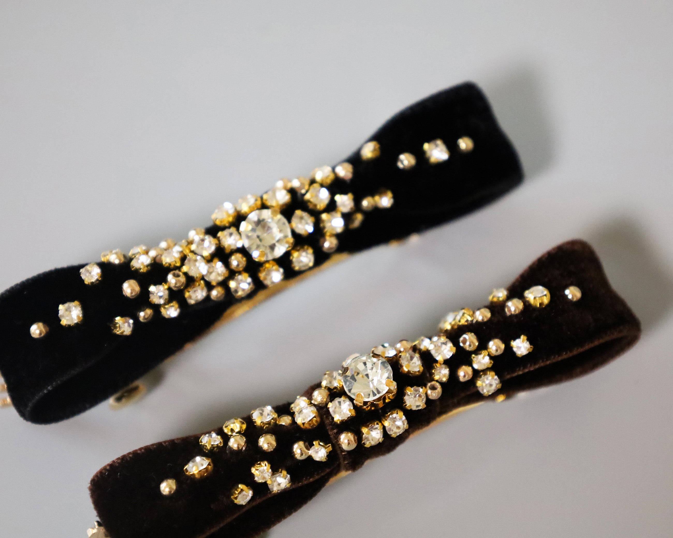 落ち着いたカラーとビジューのきらめきが大人かわいいリボンバレッタ。