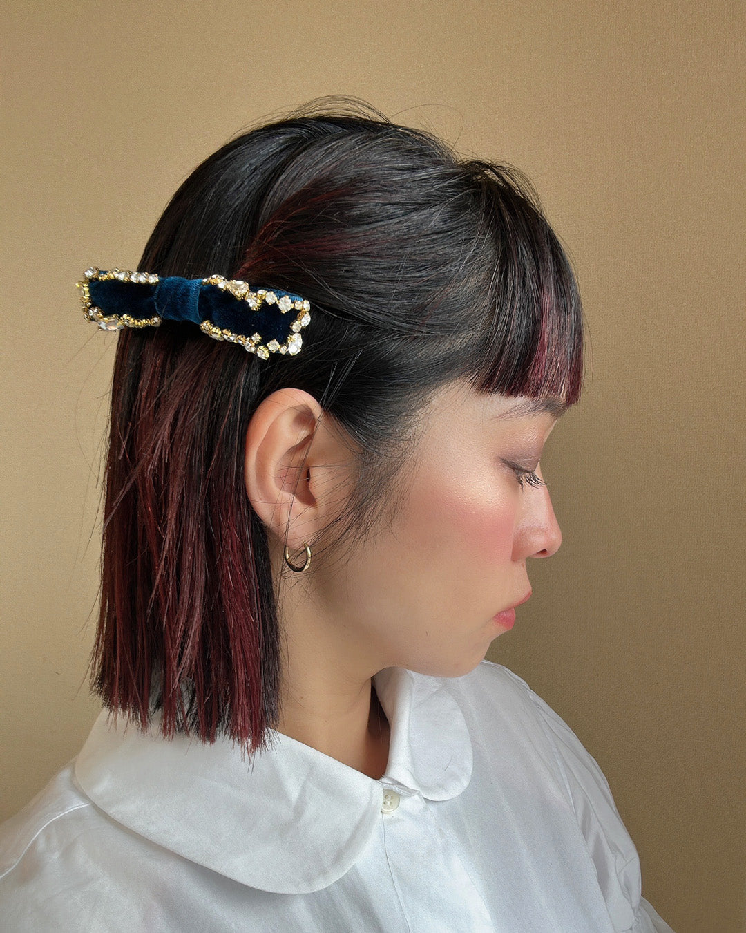 なんてことのない一つ結びも、ゴム部分にバレッタを重ねれば一気に高見えスタイルに。