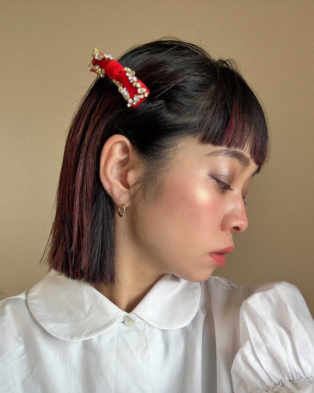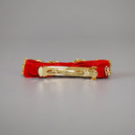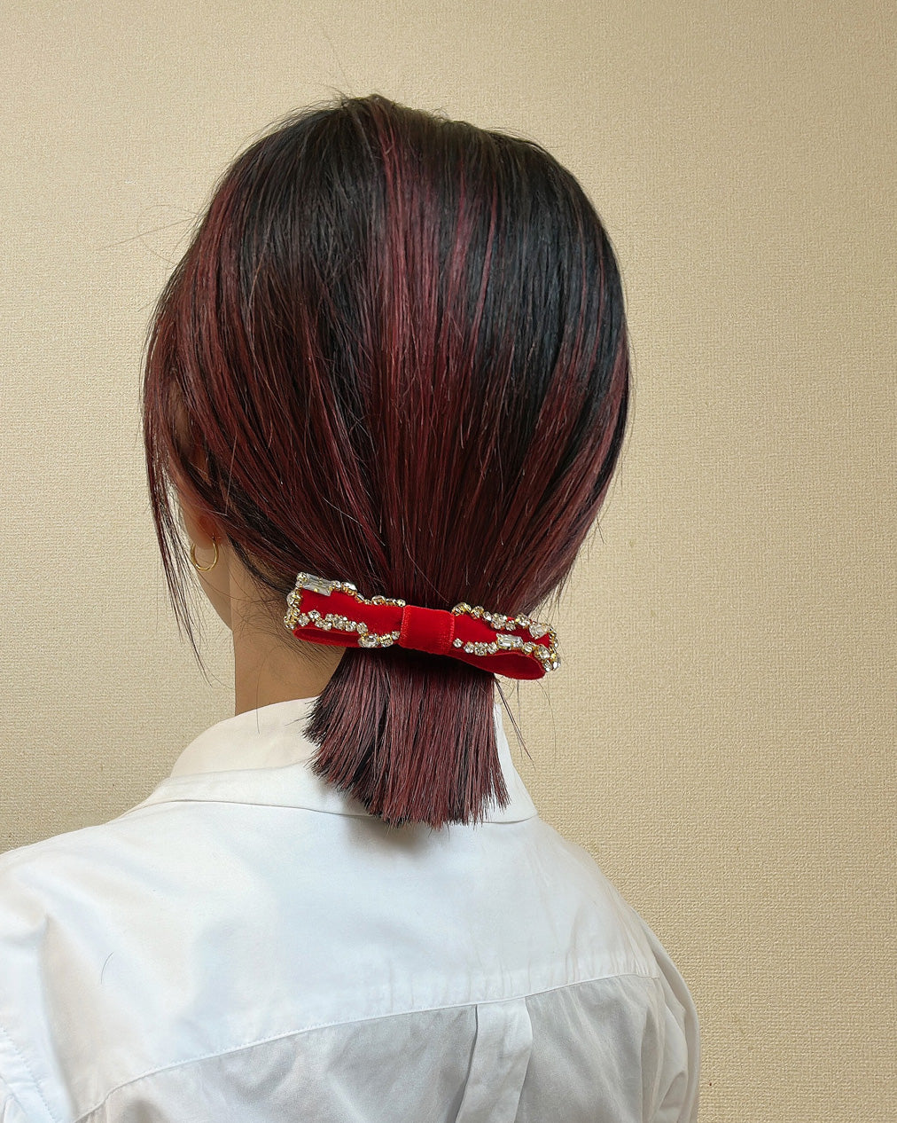 ドラマティックなスタイルを作り上げる深紅のリボンバレッタ。