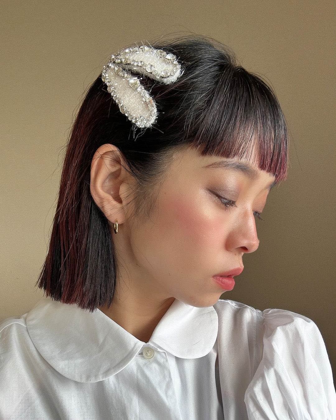 顔まわりにパチンとつけるだけで顔まわりが華やぎます。