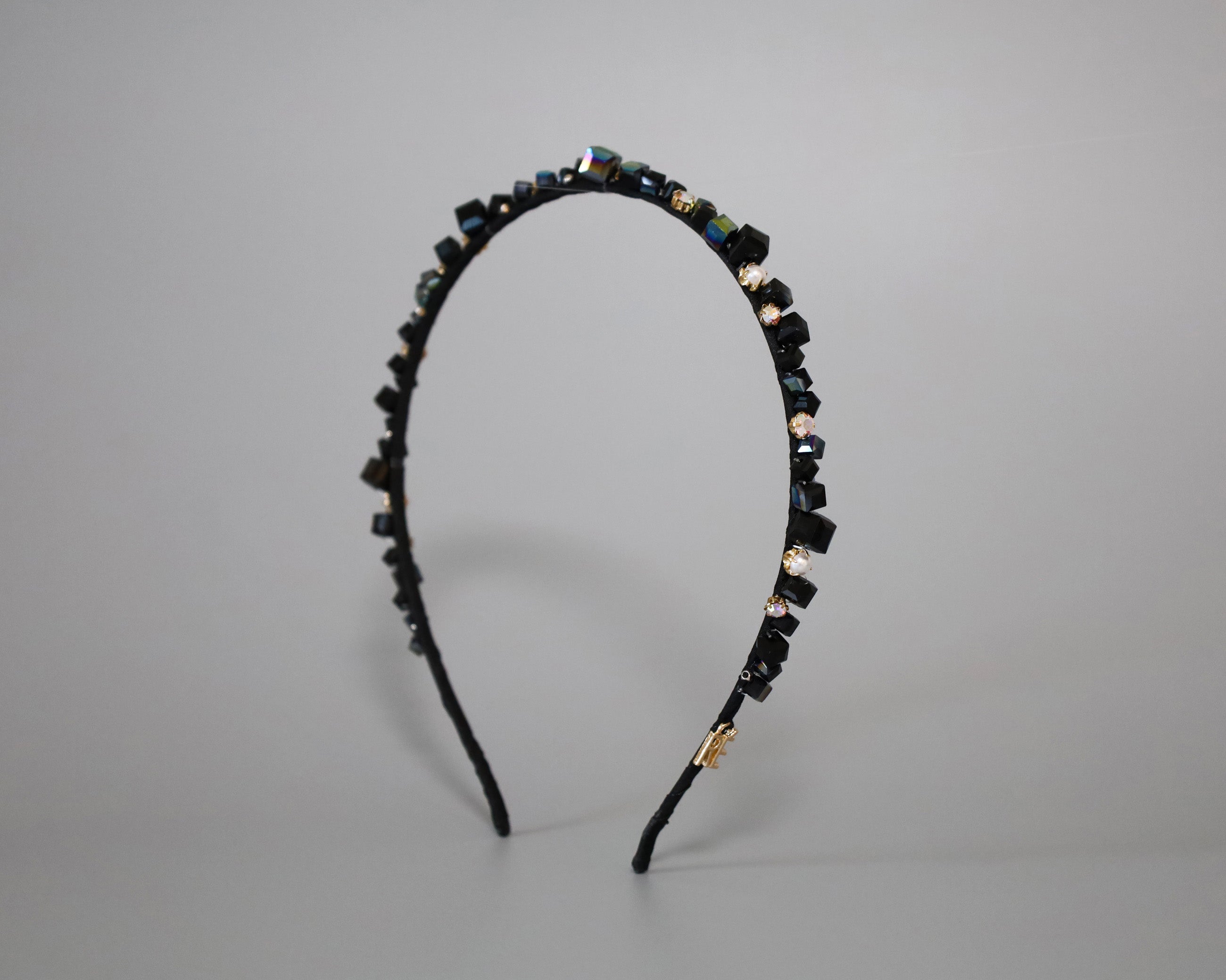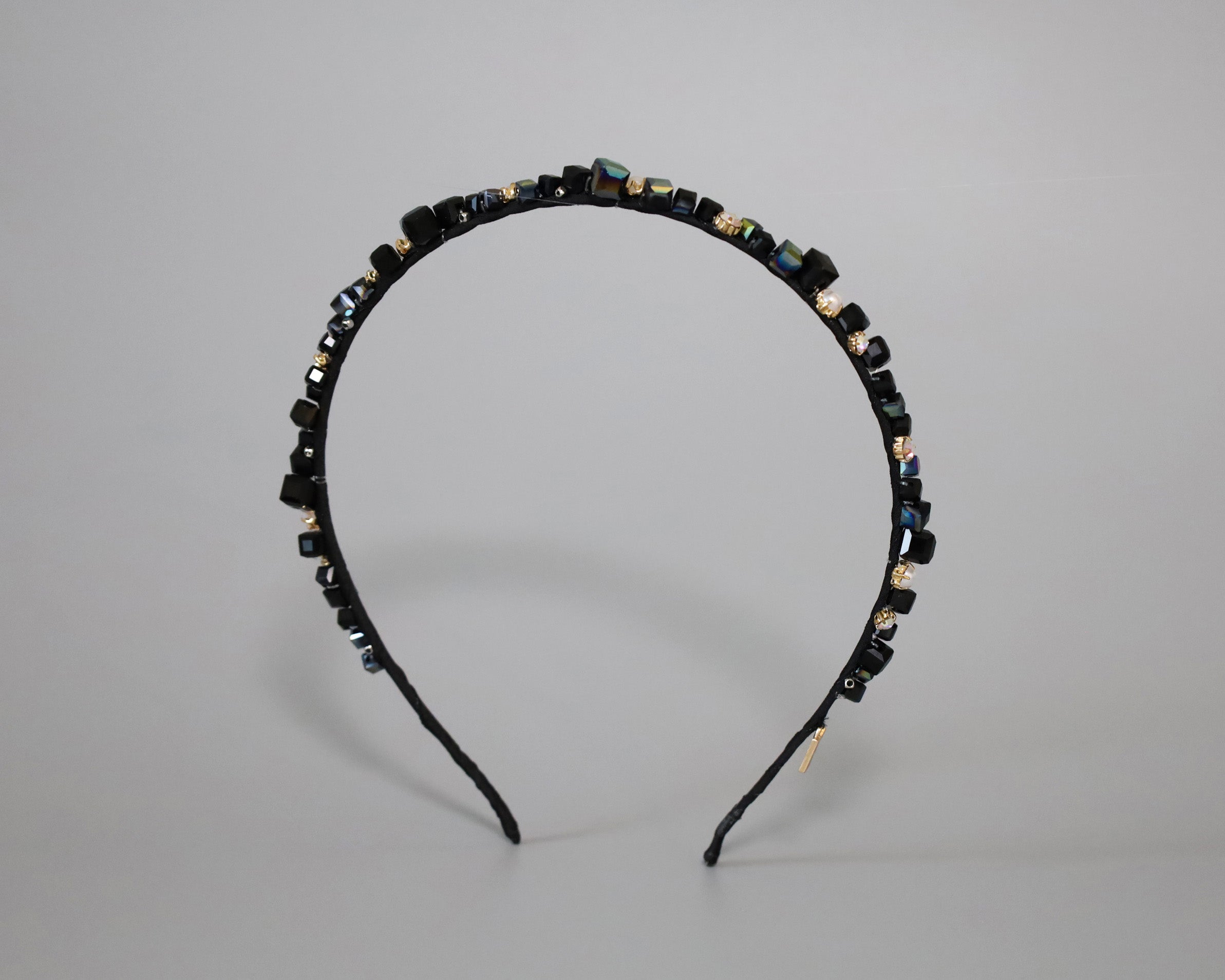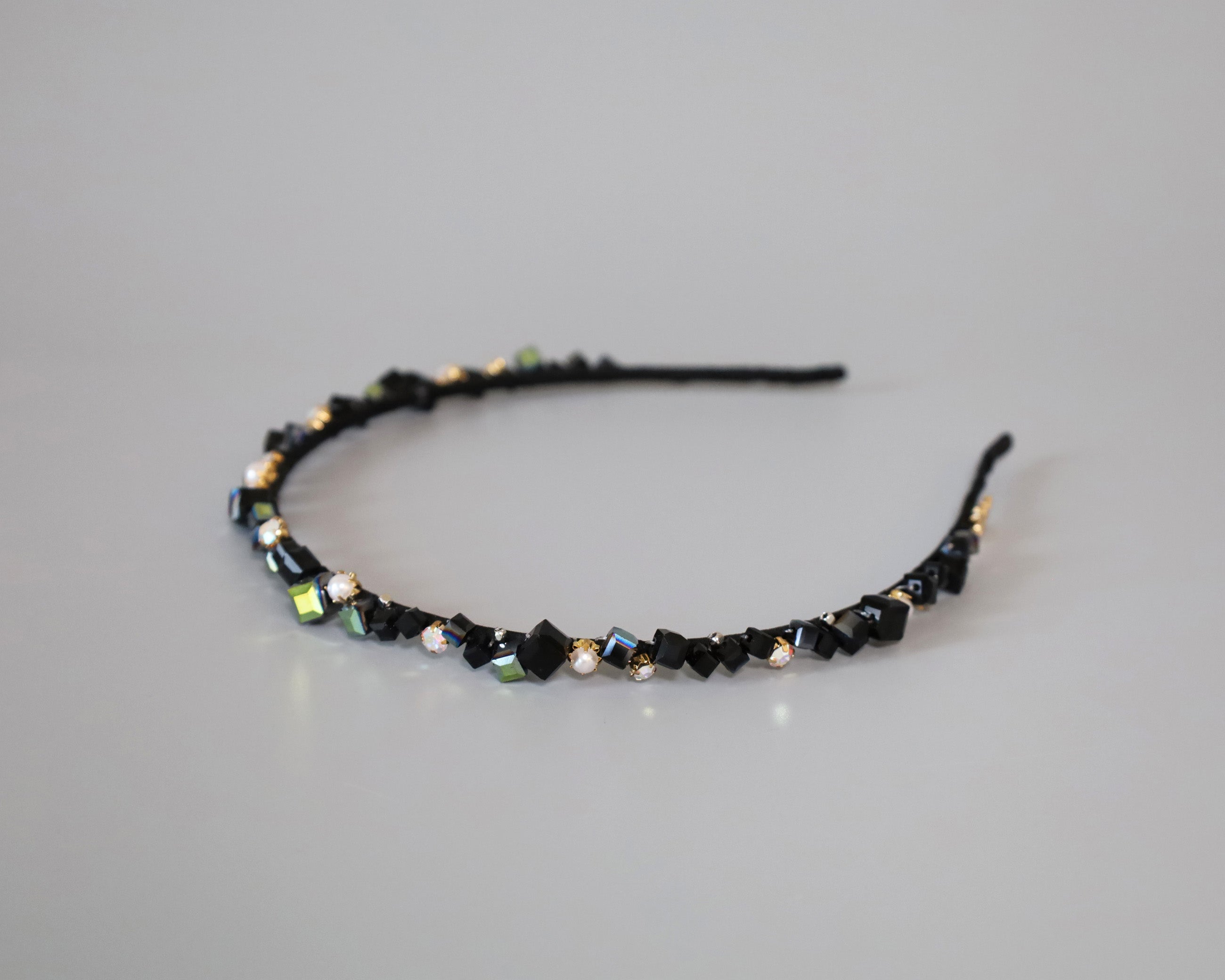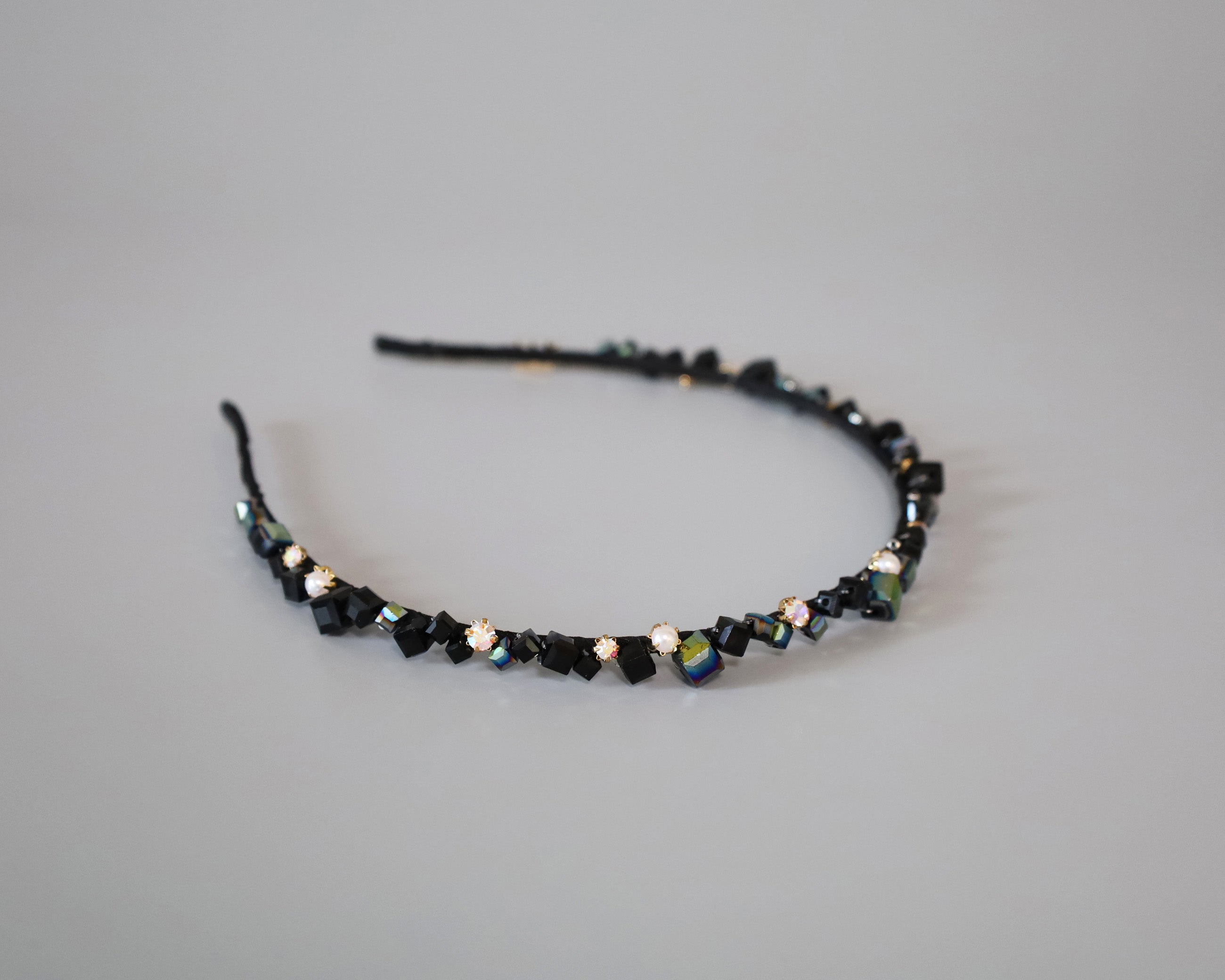 ブラックをベースにしたキューブビジューが不規則に並ぶ、ニュアンス感が美しい極細カチューシャ。