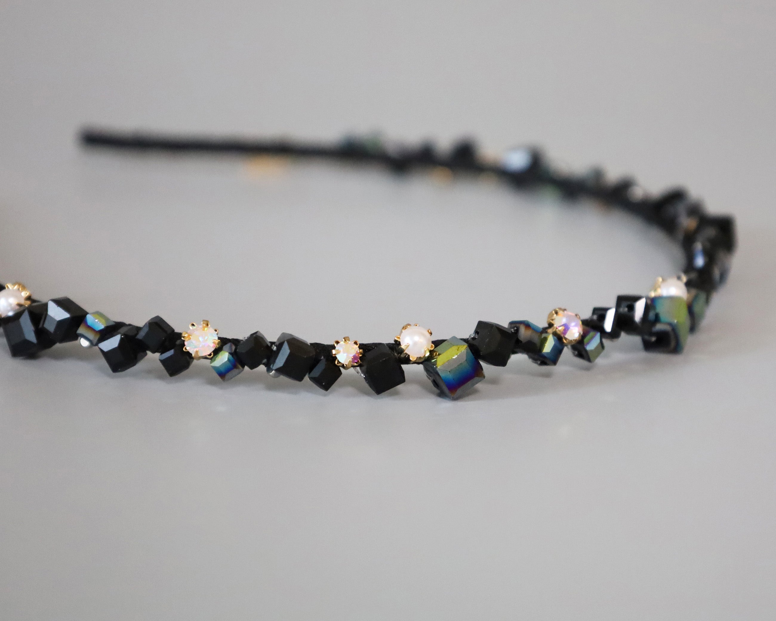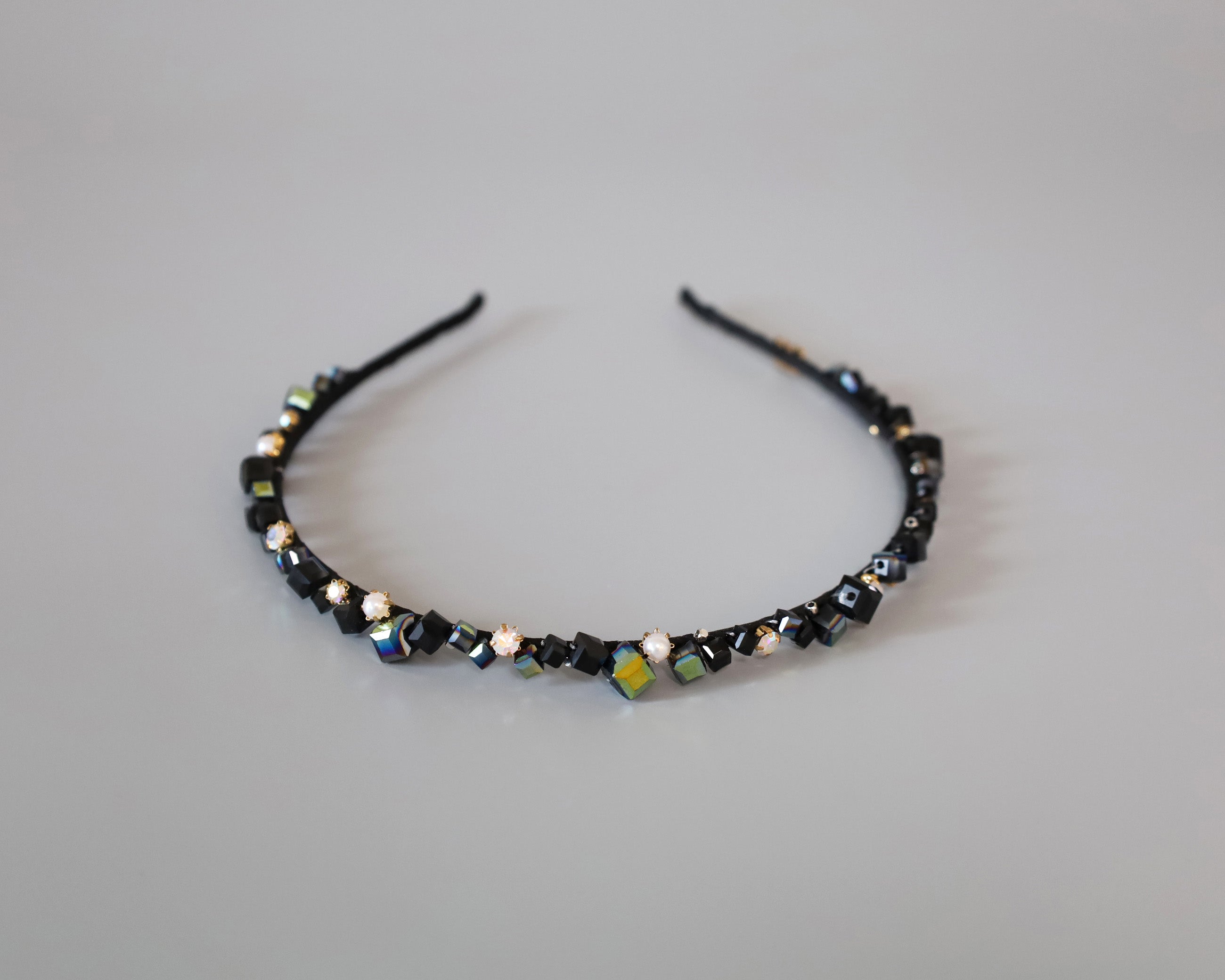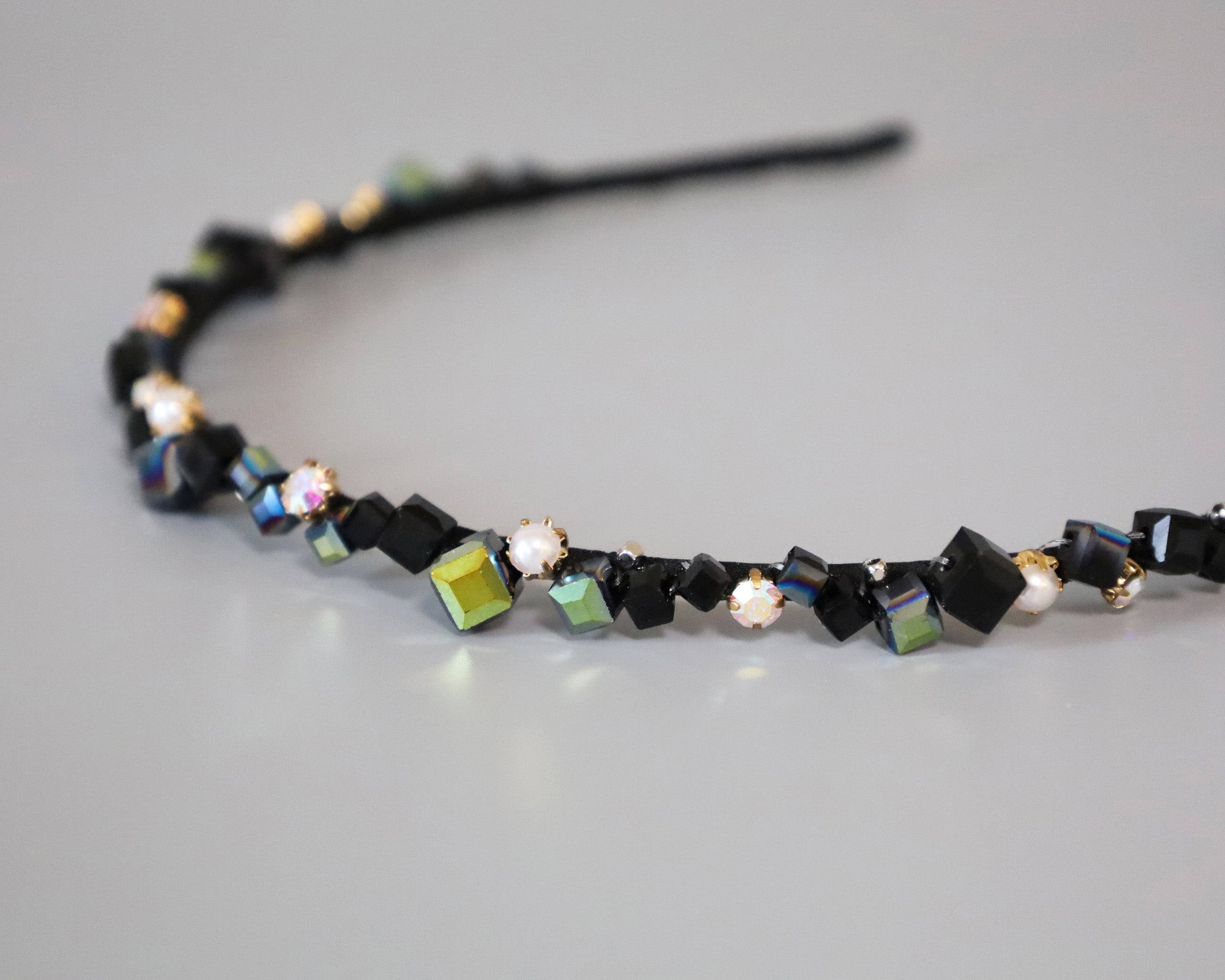 ブラックをベースにしたキューブビジューが不規則に並ぶ、ニュアンス感が美しい極細カチューシャ。