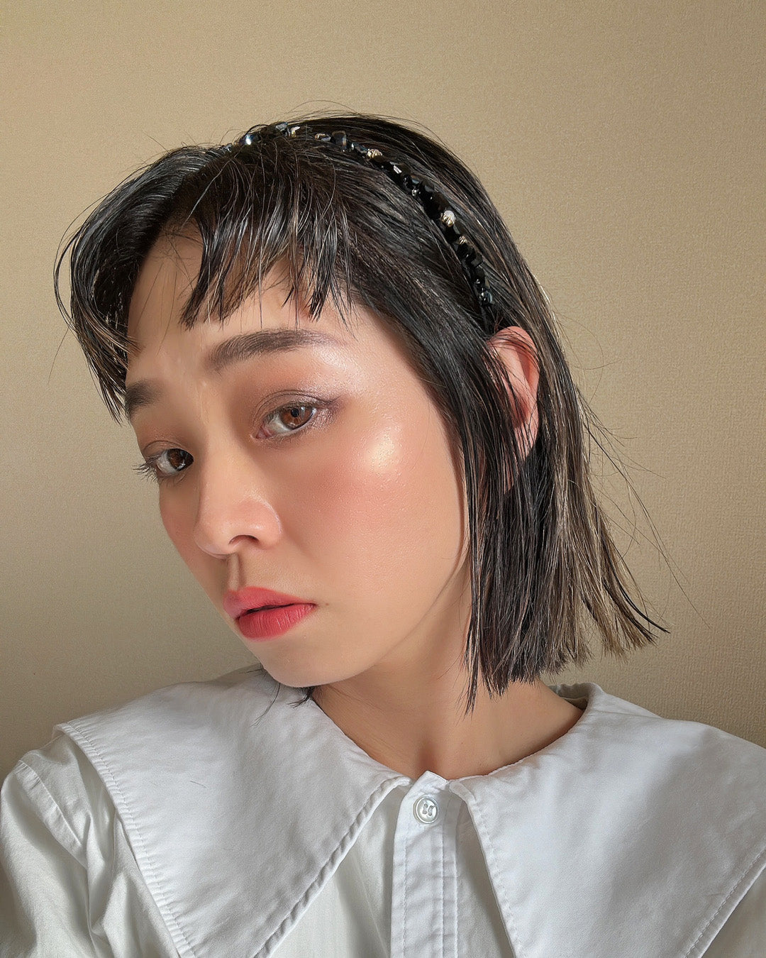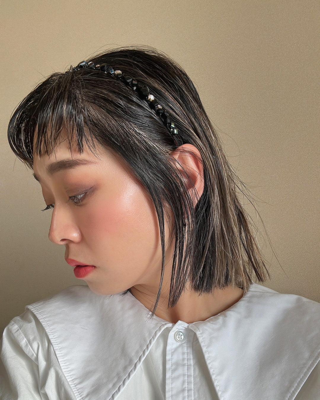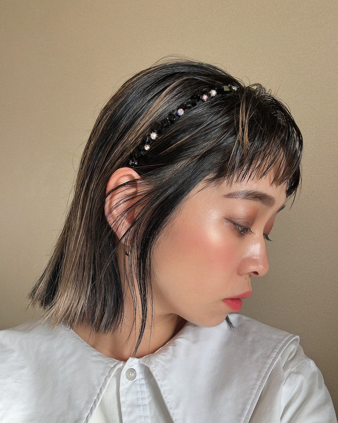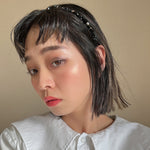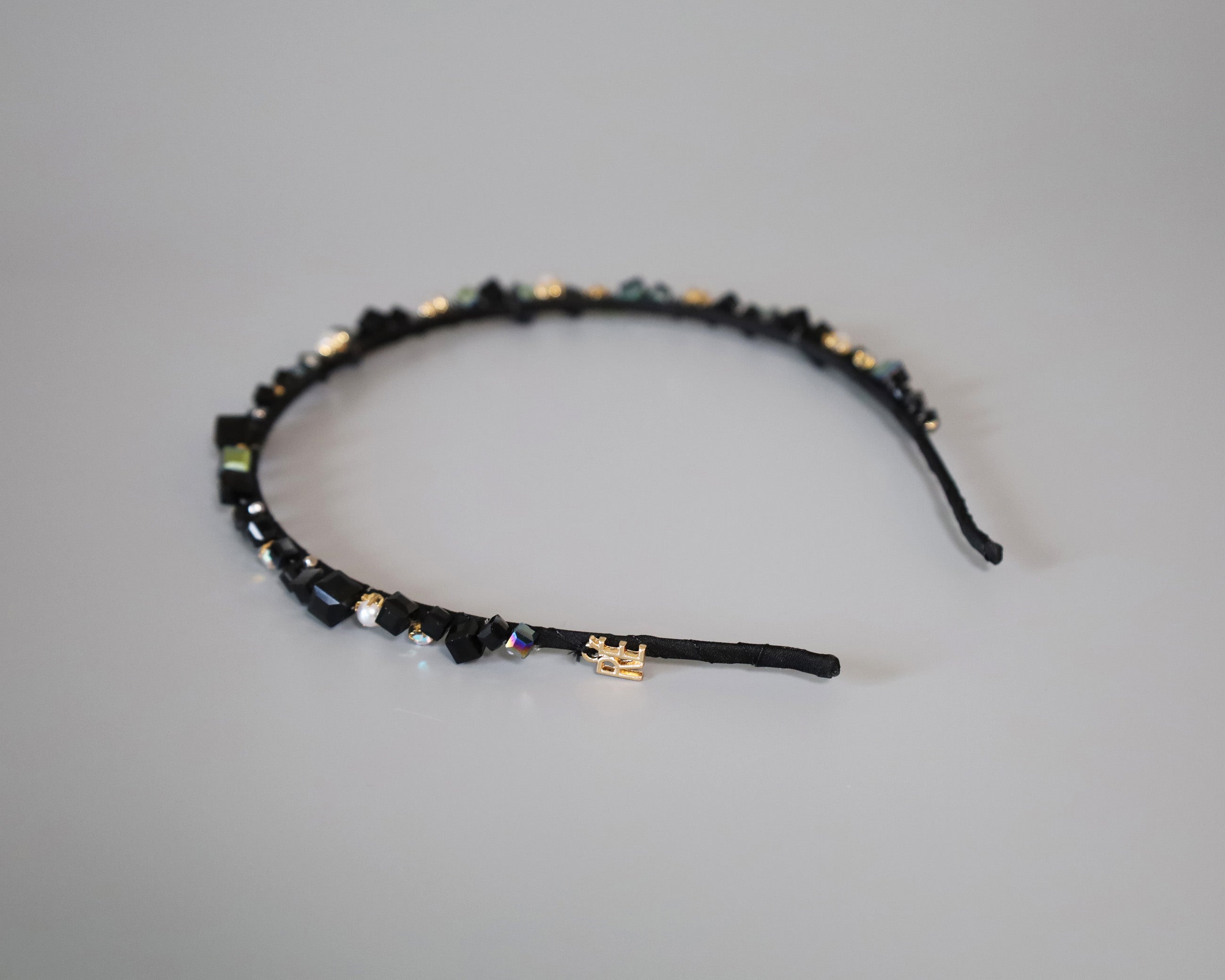 ブラックをベースにしたキューブビジューが不規則に並ぶ、ニュアンス感が美しい極細カチューシャ。
