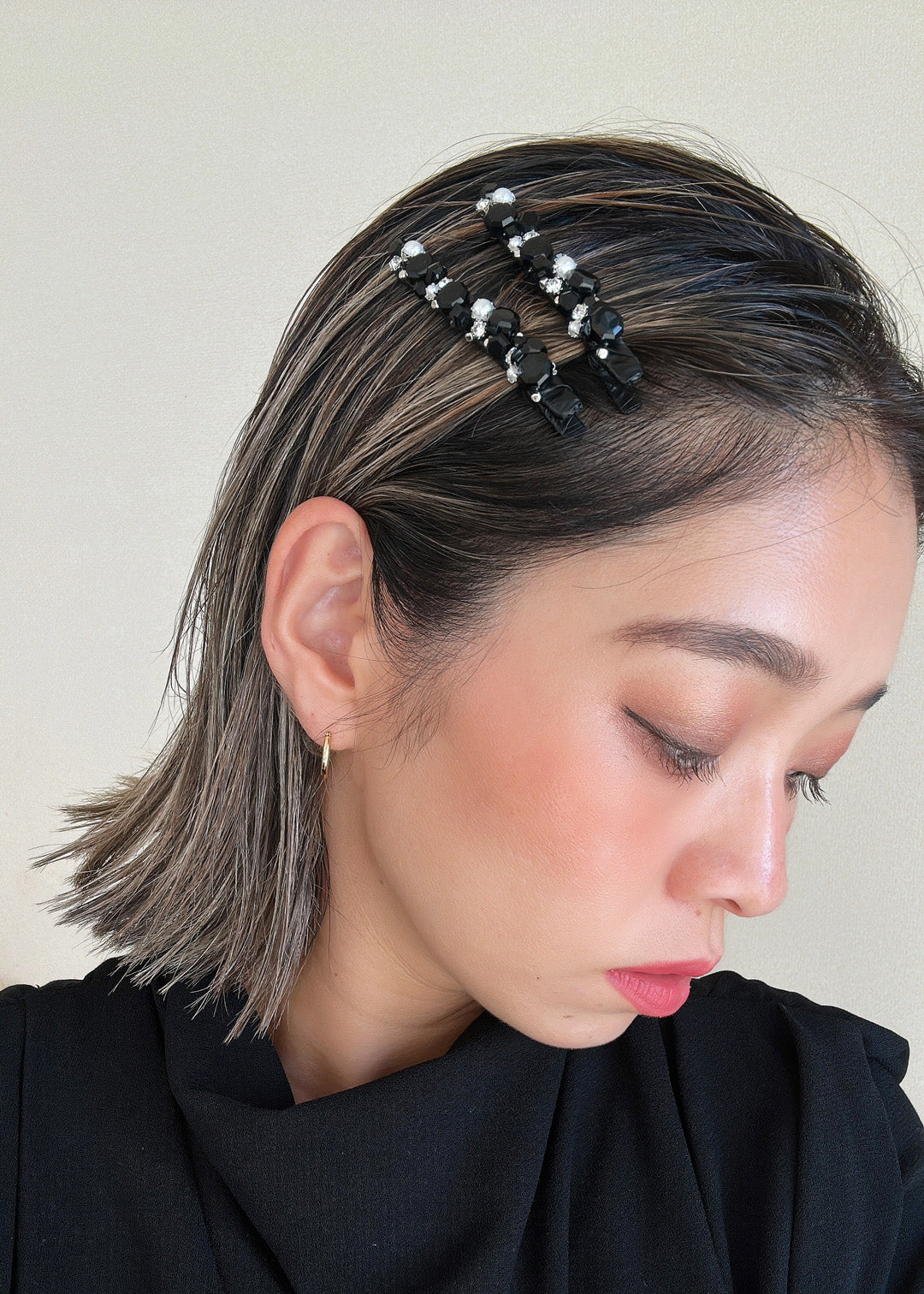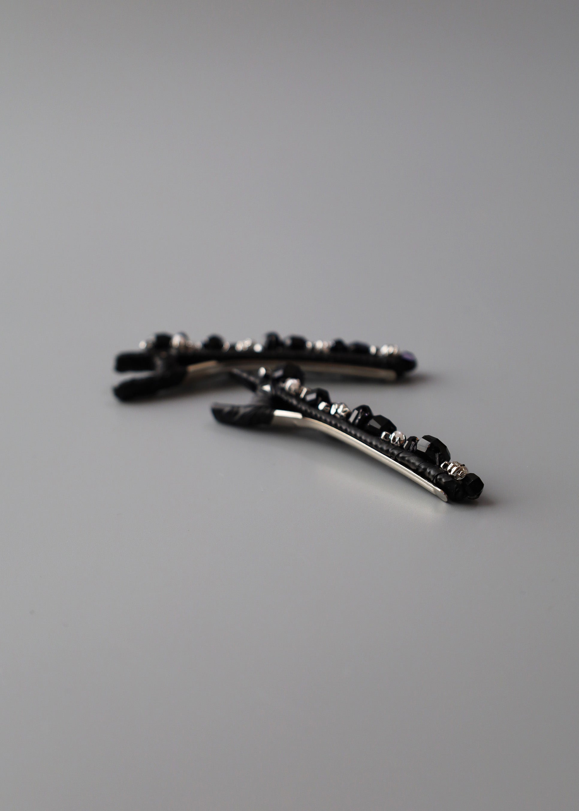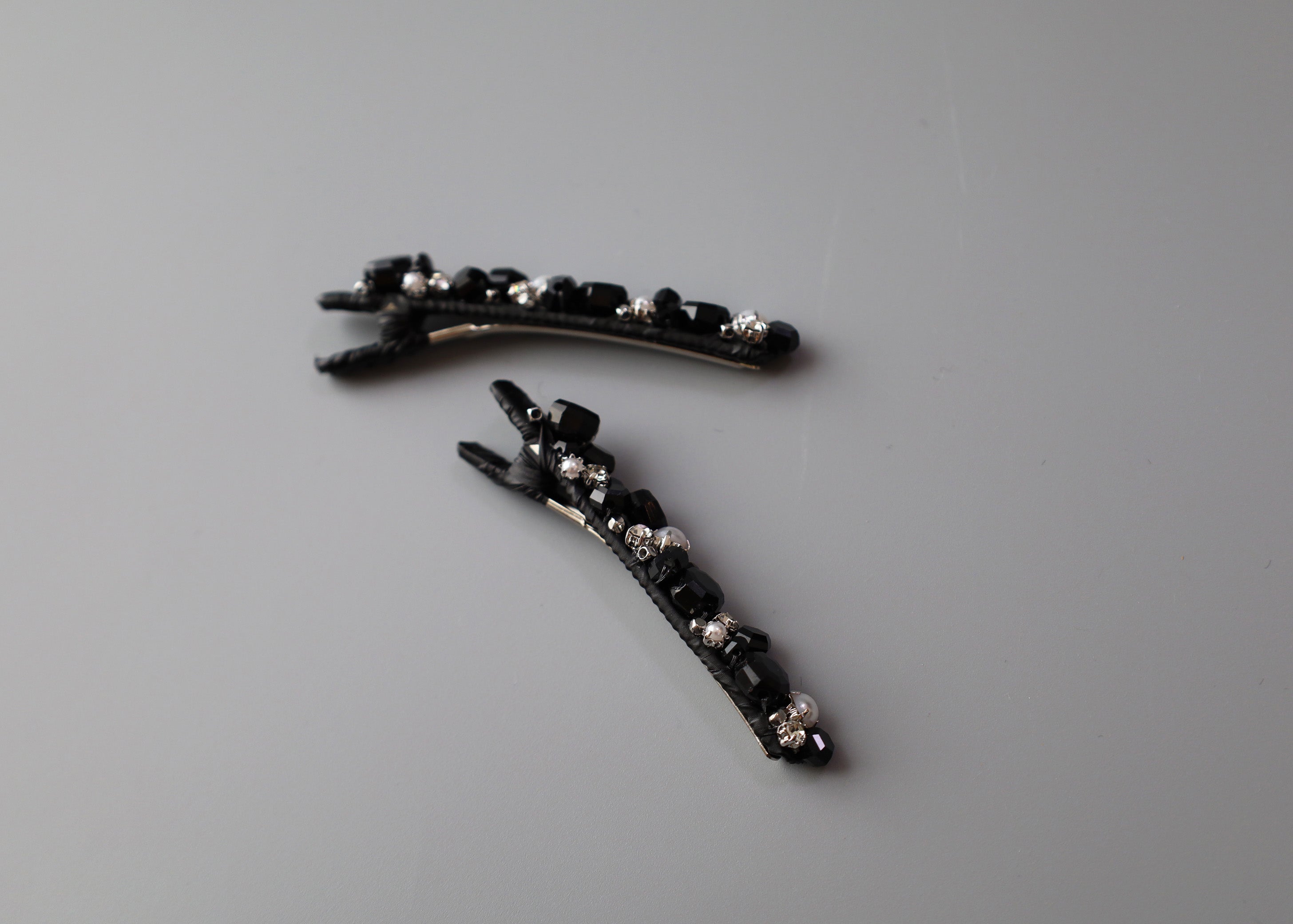 モノトーンカラーが大人っぽい、モードなキラキラヘアピン。