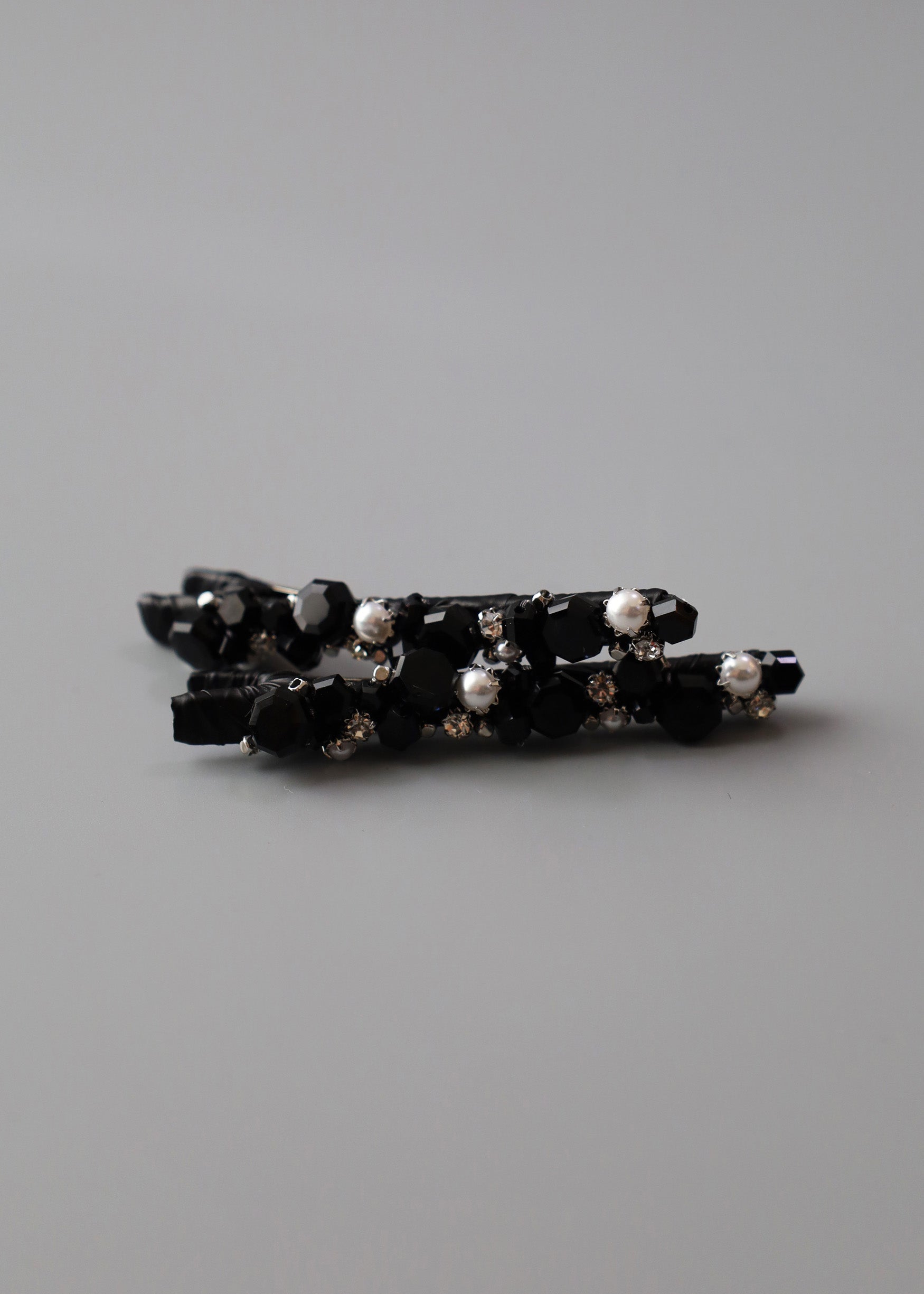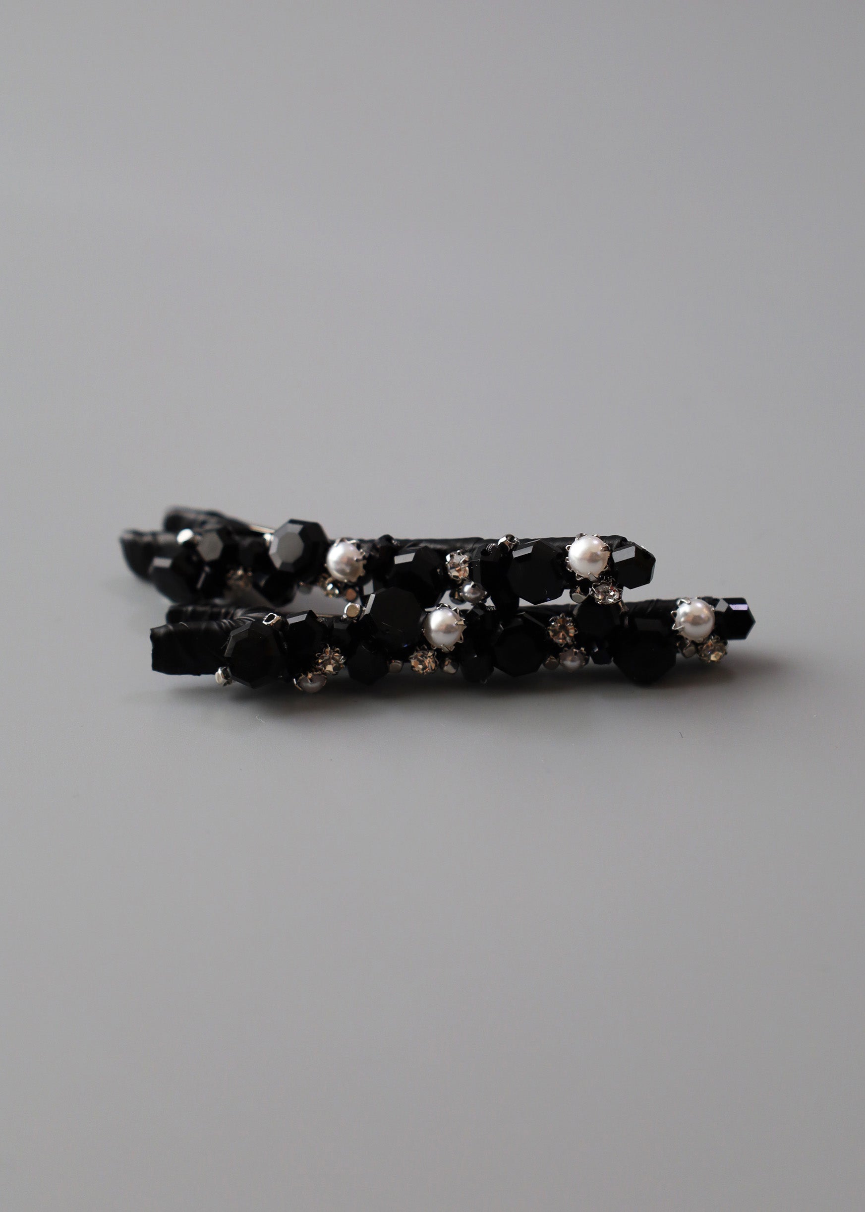 ブラックカラーのビジューパーツの合間にきらめくパールパーツがラグジュアリーな気分をプラス。