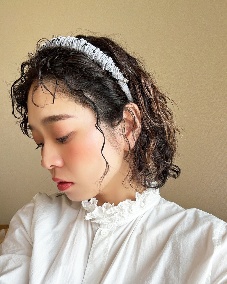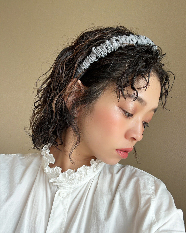 薄めのグレーが軽やかな印象のギャザーカチューシャ。