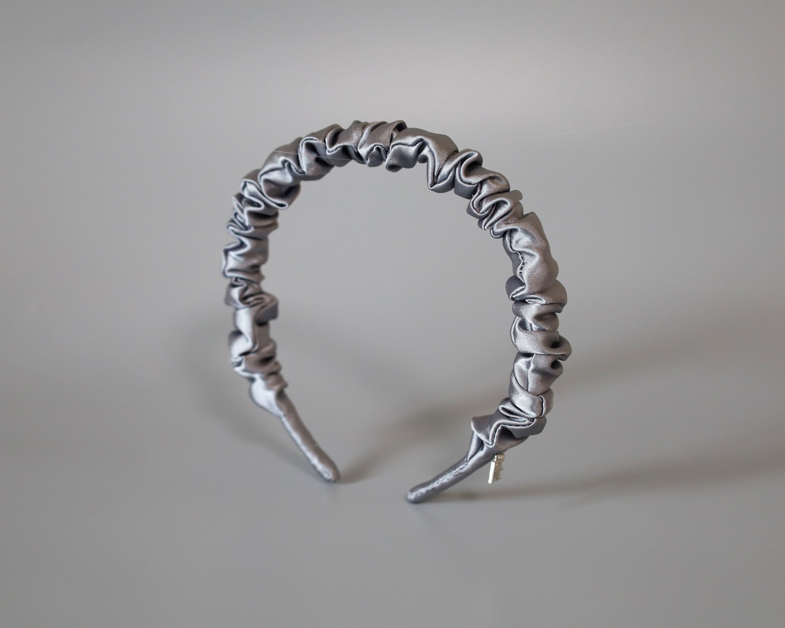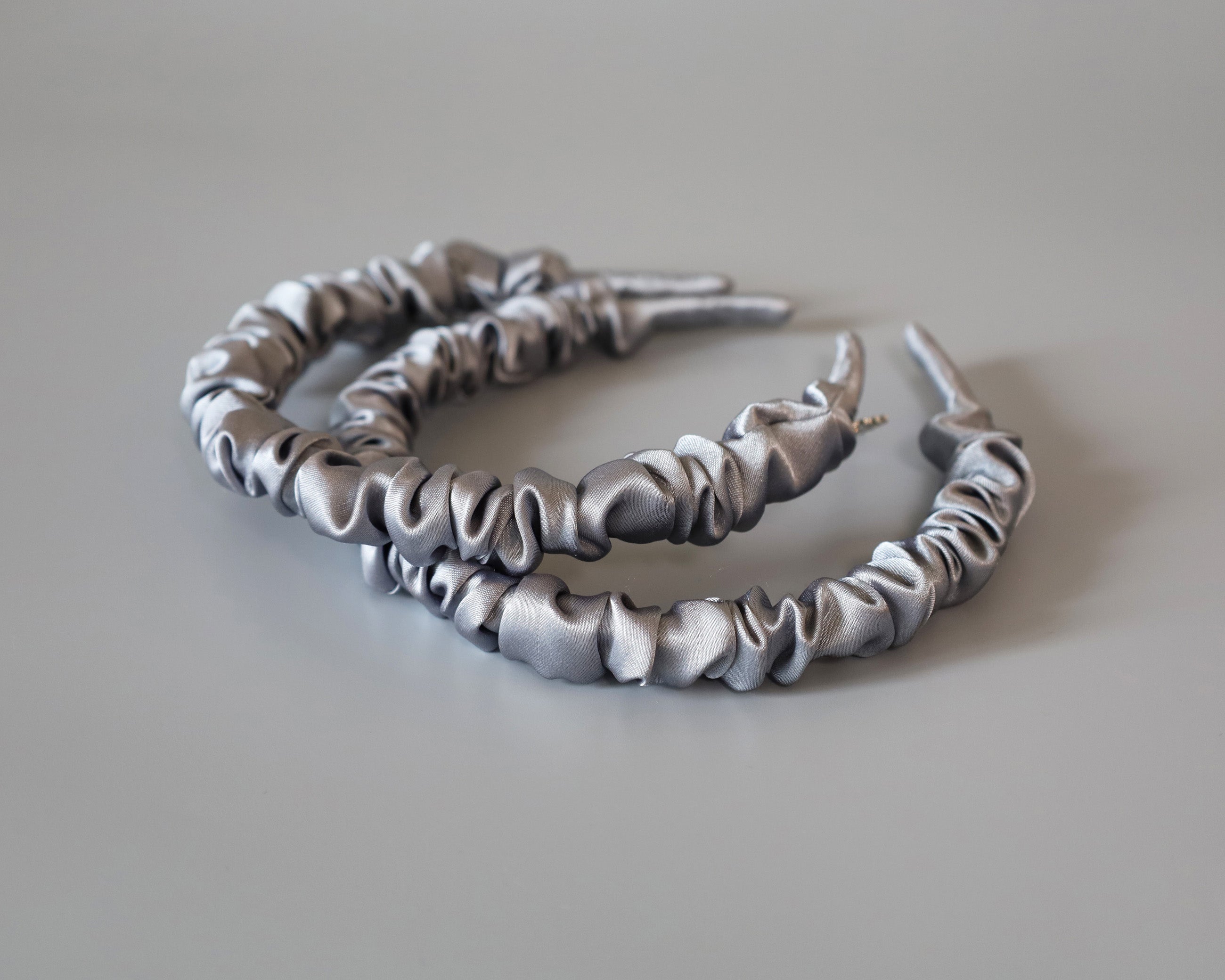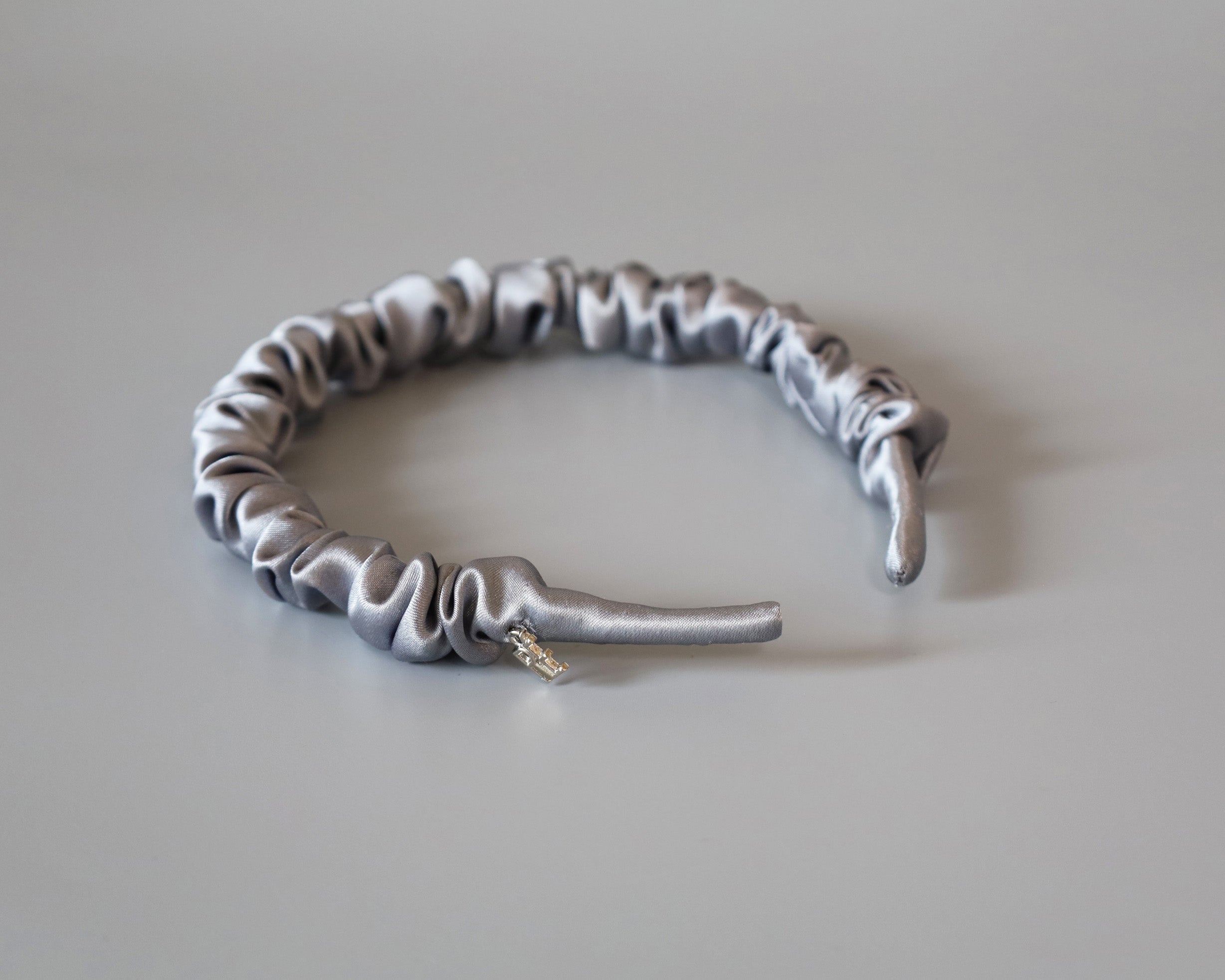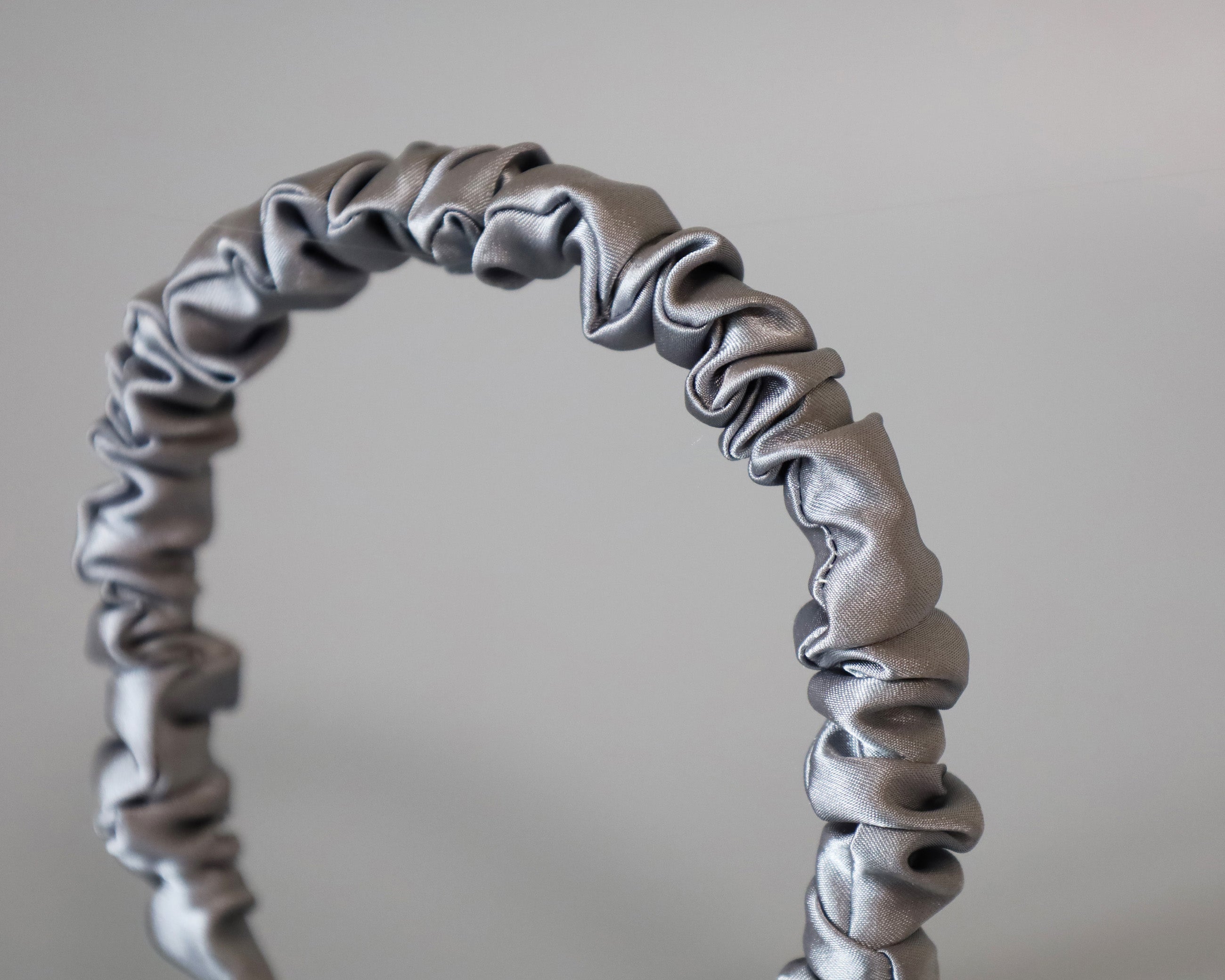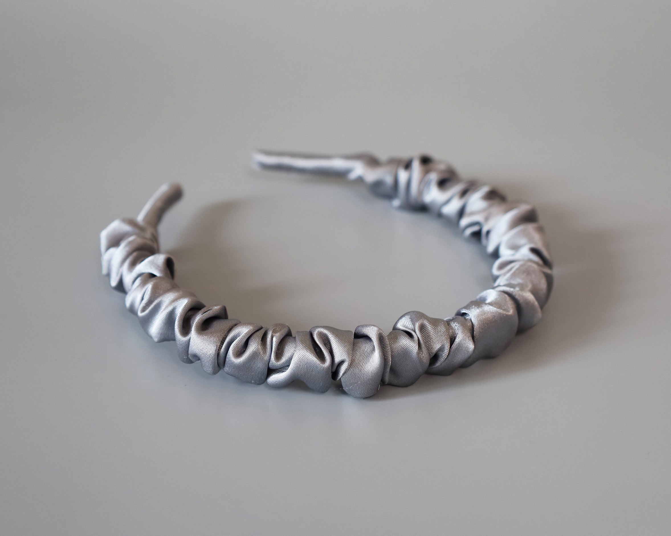 なめらかに輝くシルバーグレーのギャザーカチューシャ。