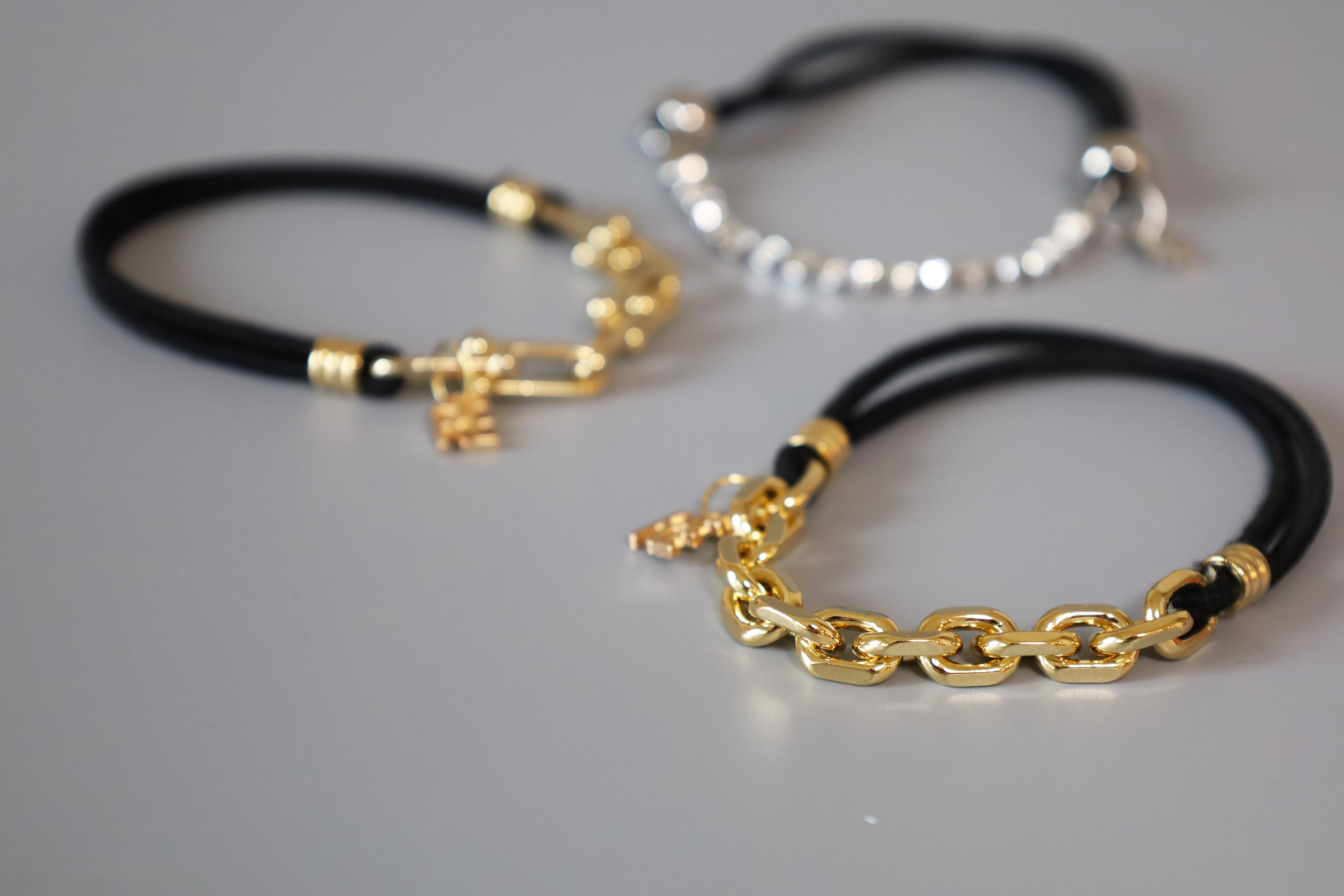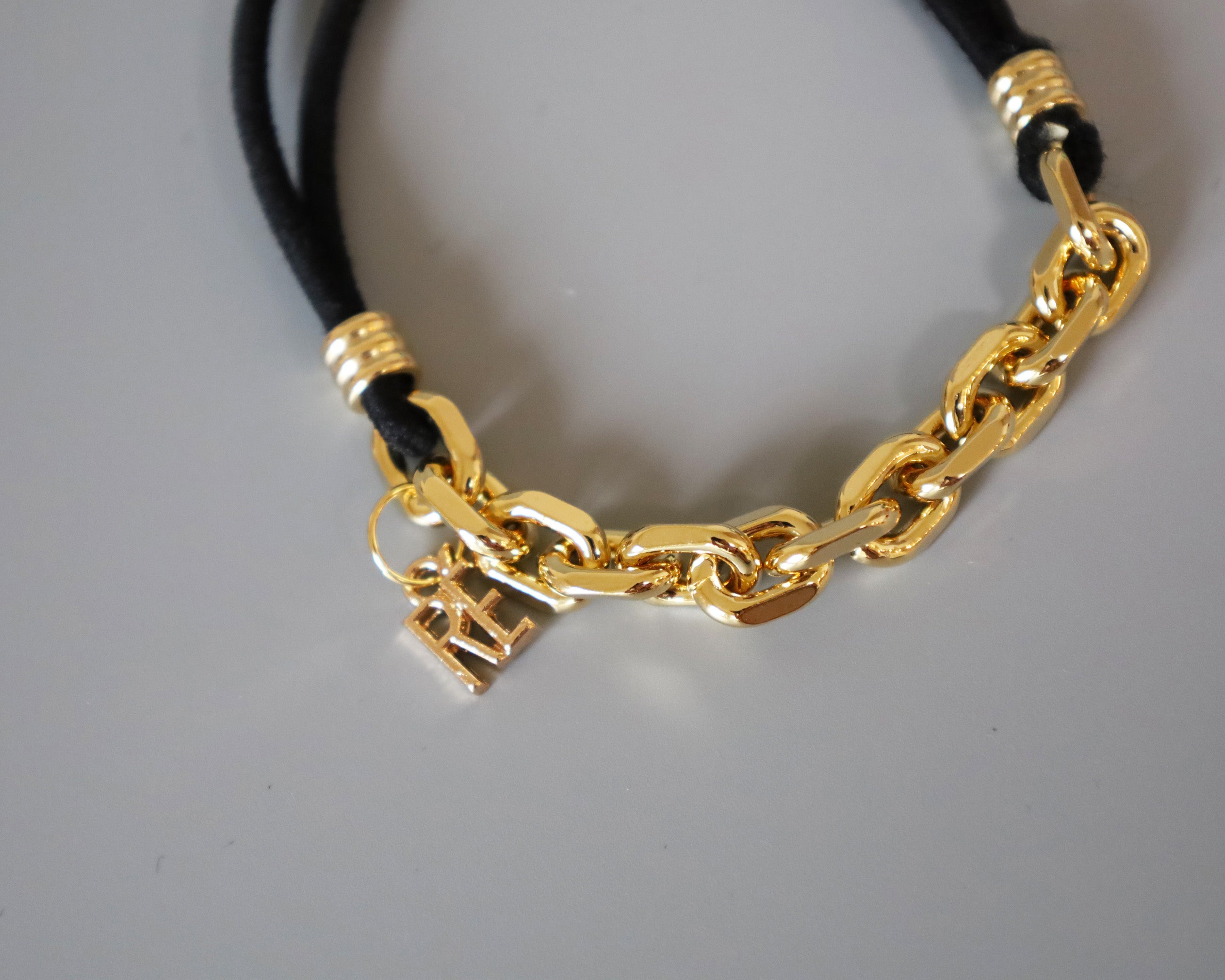 チェーンを巻き付けたような仕上がりでゴムを目立ちにくくするさりげなさがニクい。