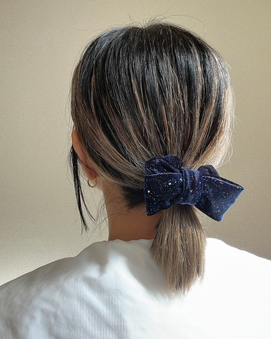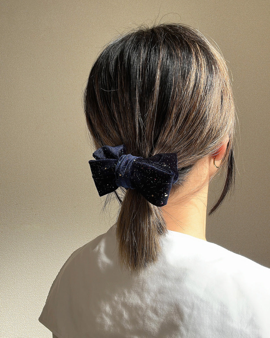 シンプルなポニーテールやシニヨン、ハーフアップに合わせるのがこのリボンポニーの魅力を活かすスタイル。