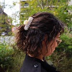 ゴムを使わないゆるめのポニースタイルに合わせればこなれた雰囲気に仕上がります。