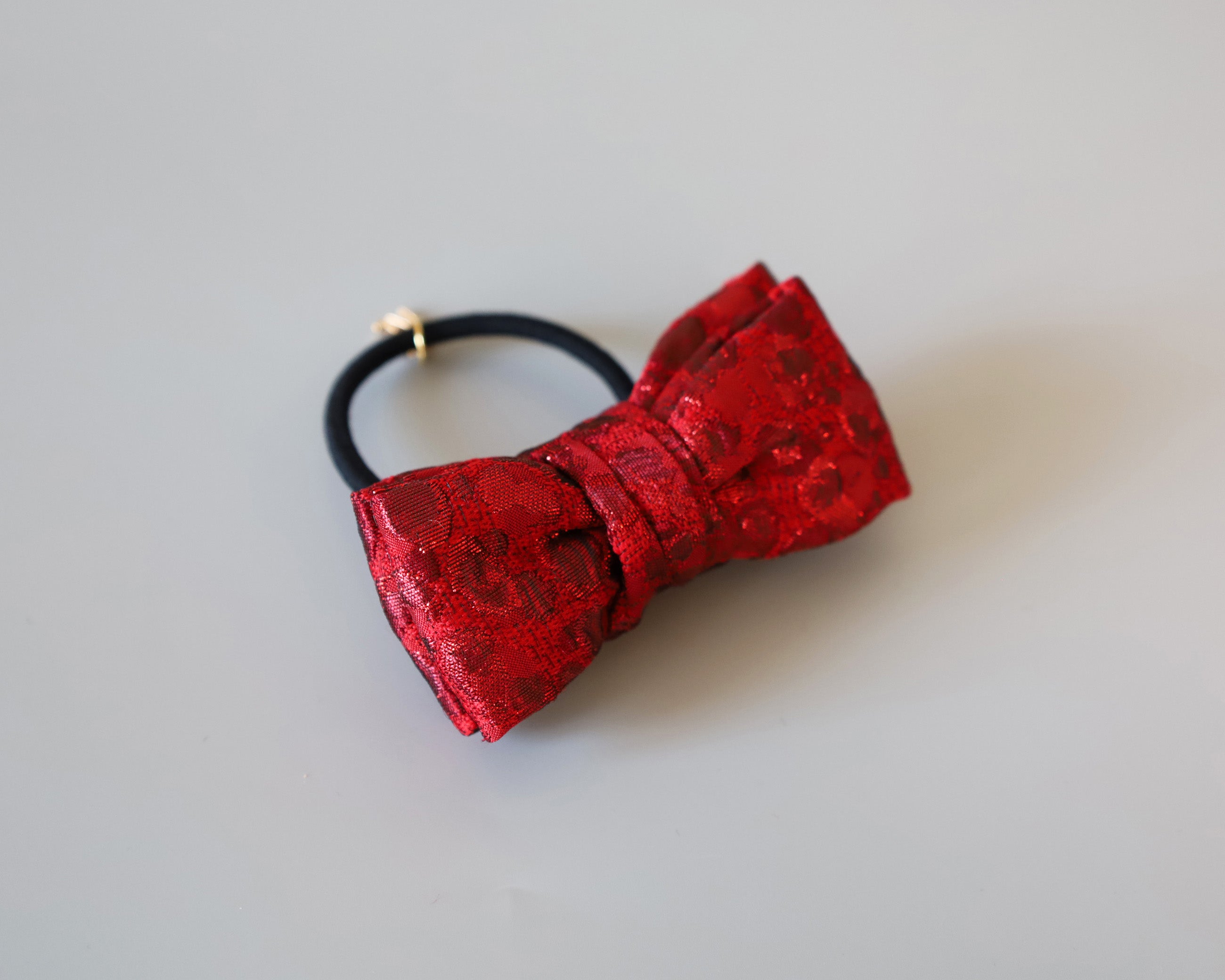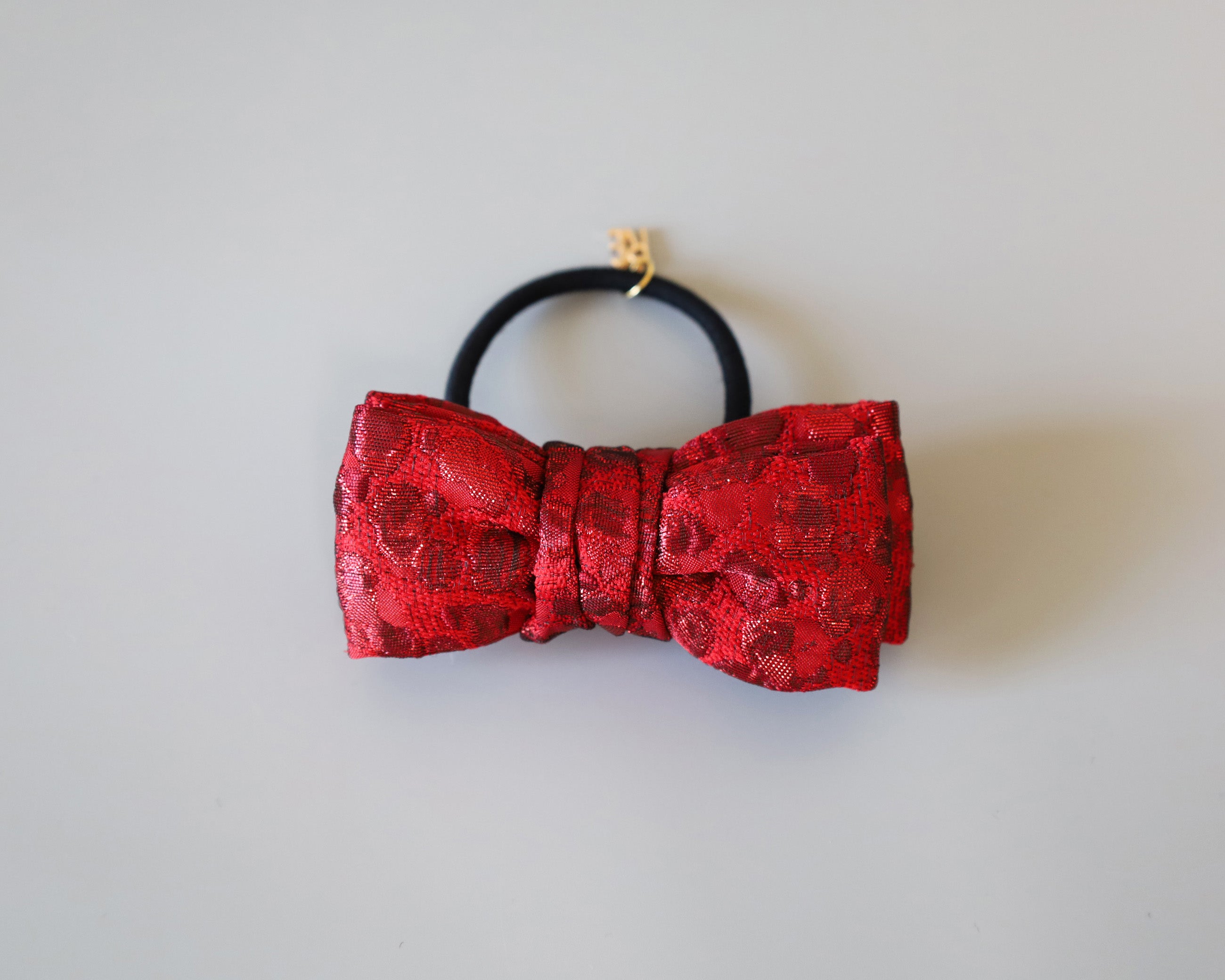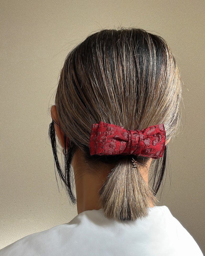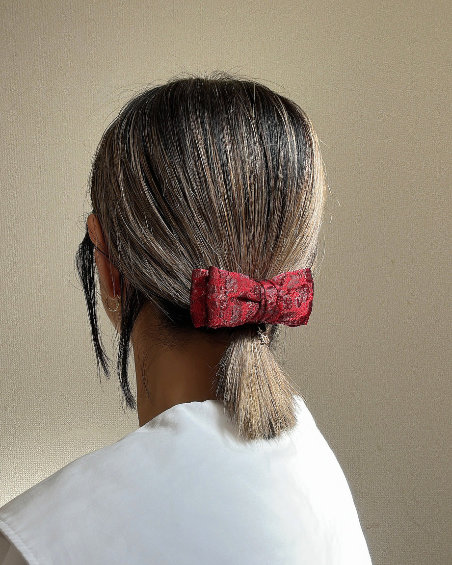 シンプルなヘアやコーデのアクセントとしてぴったりな深紅のリボンポニー。