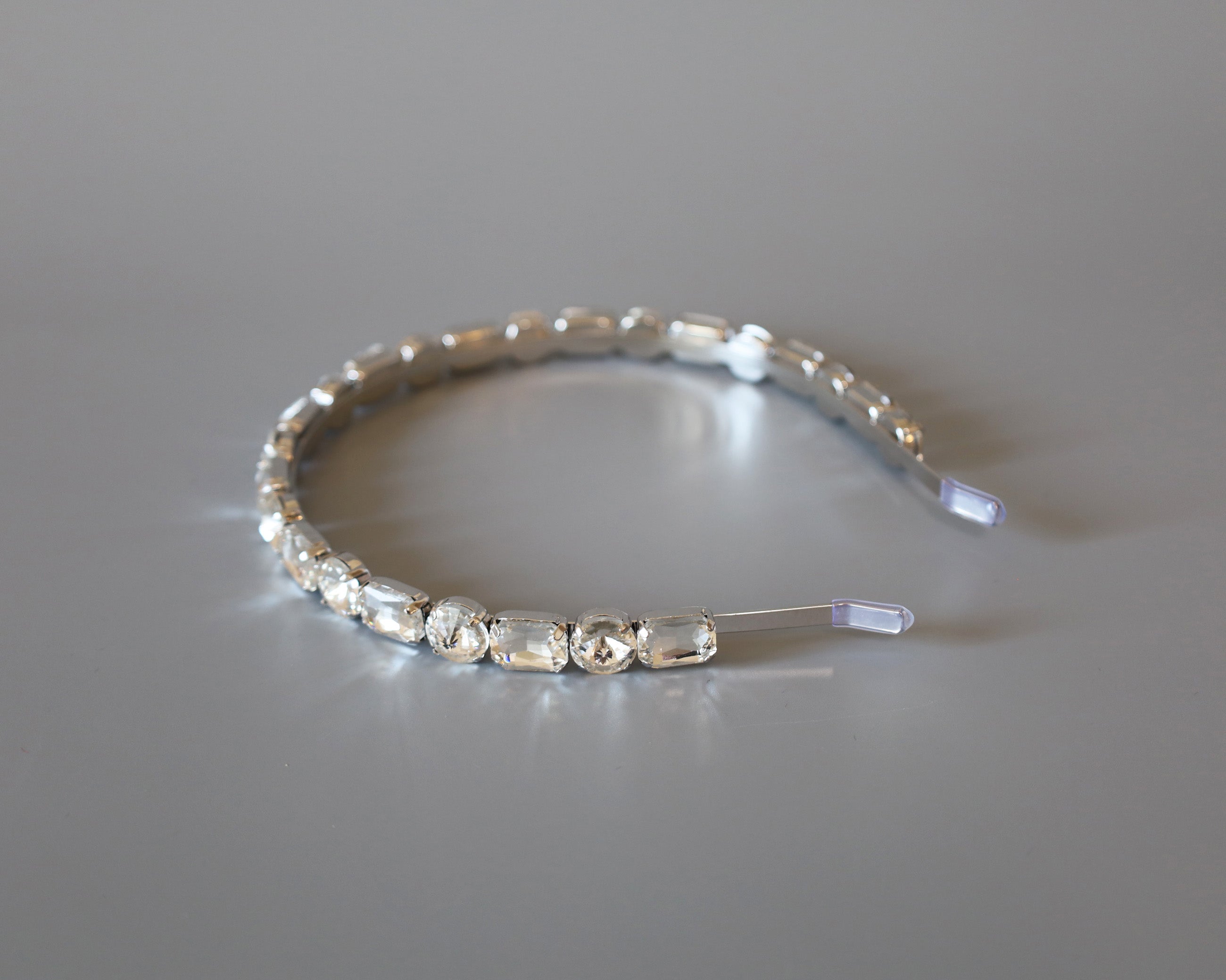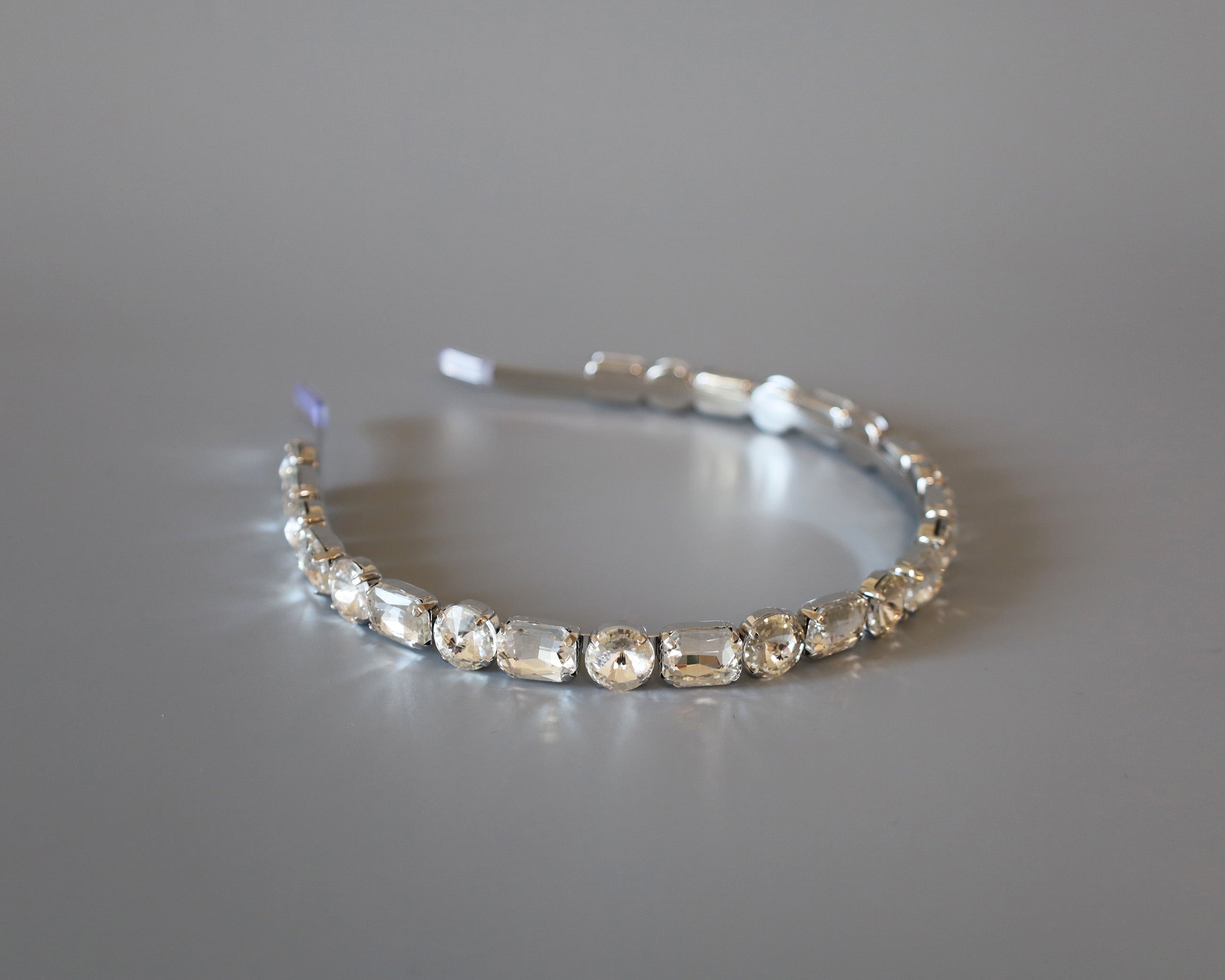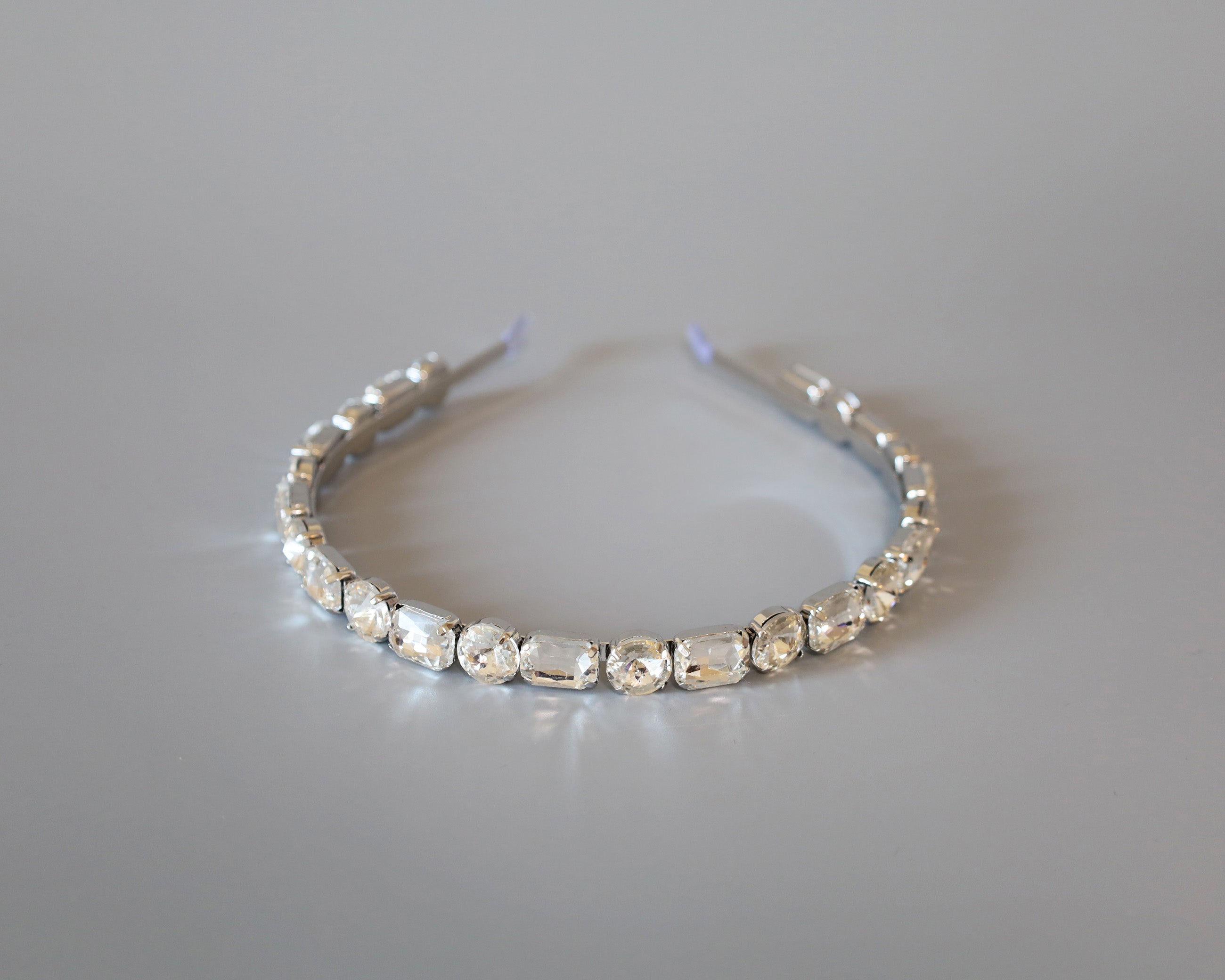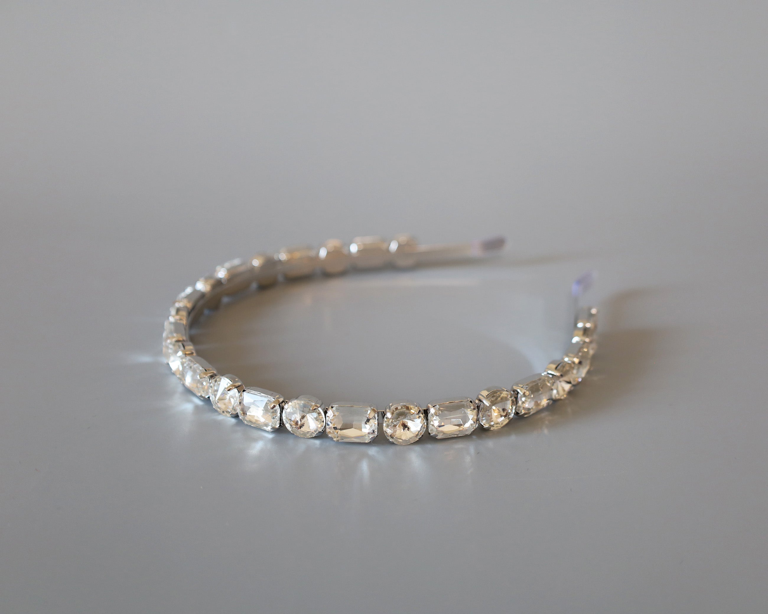 シルバーのメタルフレームに大粒クリアビジューをたっぷり並べた乙女心くすぐるキラキラカチューシャ。